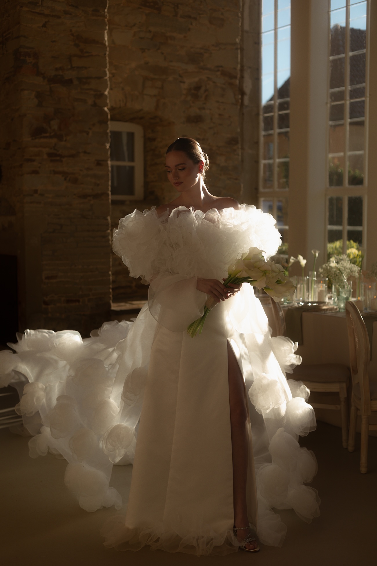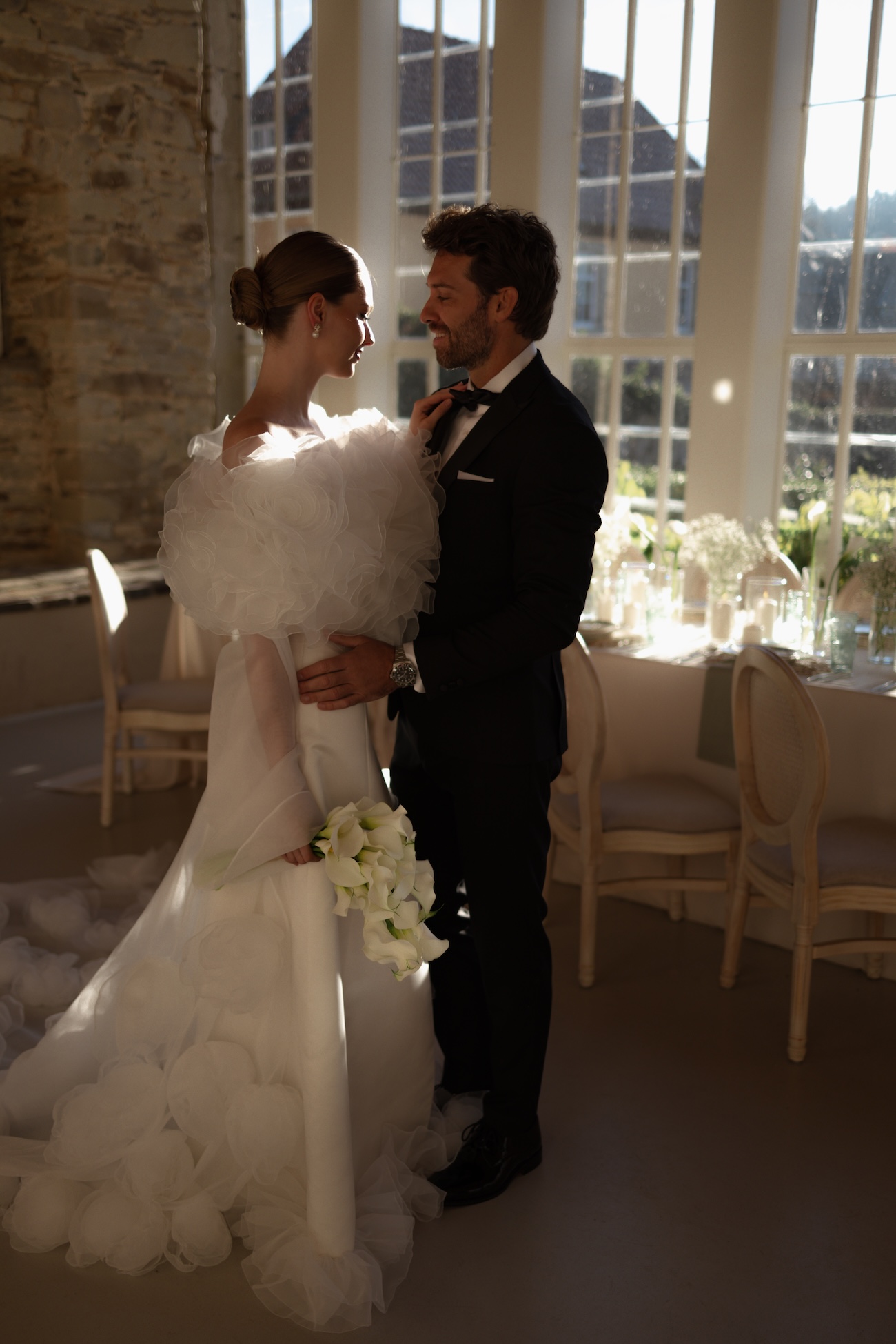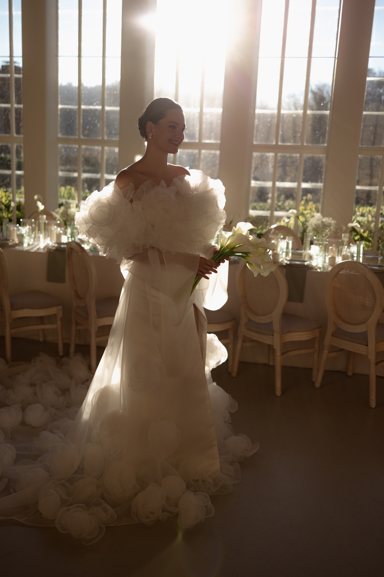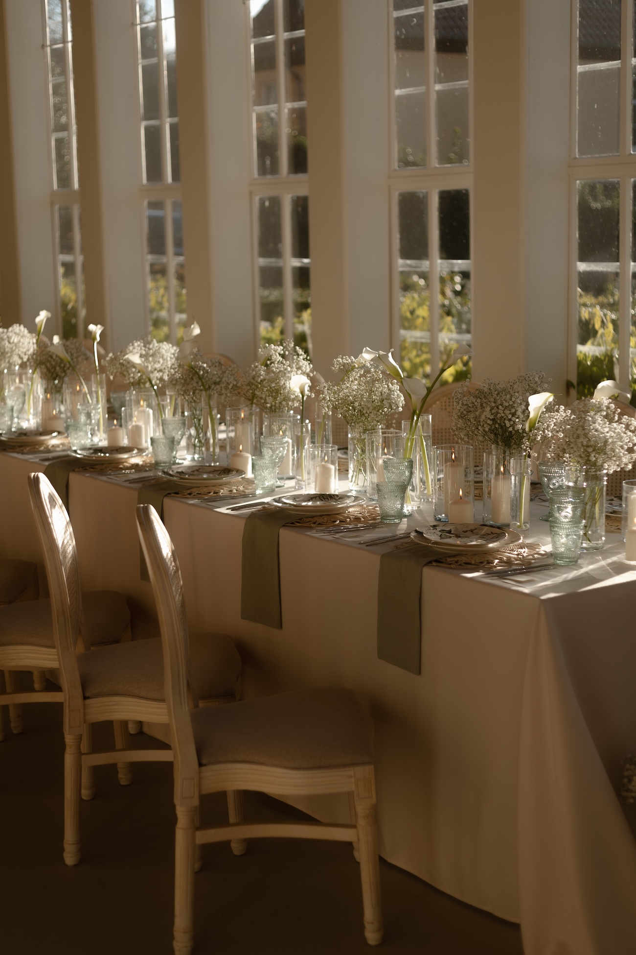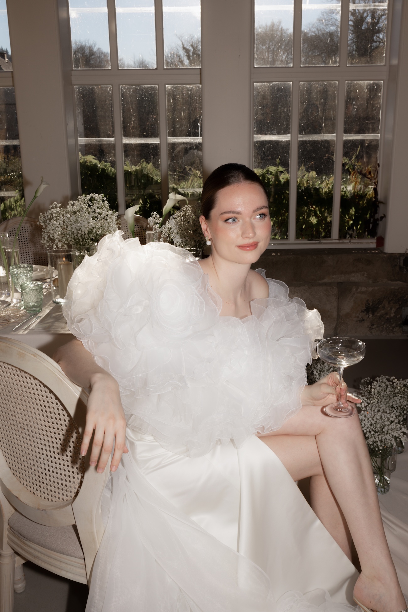 Baignée par la douceur du soleil de novembre, la scénographie se pare de nuances de verts et de tons blanc-beige, soulignées par la chaleur des bougies et de subtils accents couture. Le décor, installé dans la somptueuse Orangerie de Gut Ostenwalde, offre un écrin presque irréel : grandes fenêtres anciennes, briques méditerranéennes et jardin poétique composent un tableau digne d’un conte moderne.