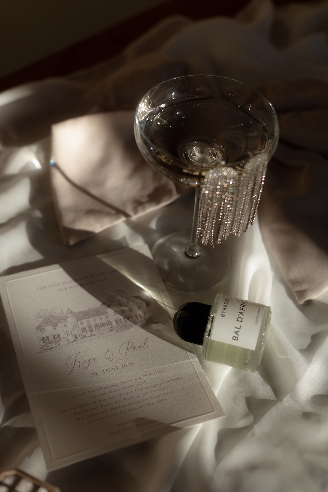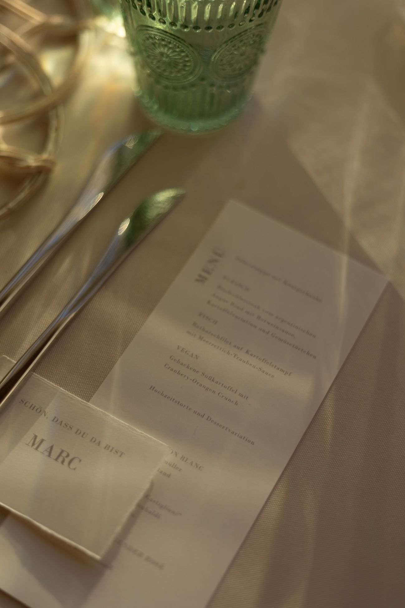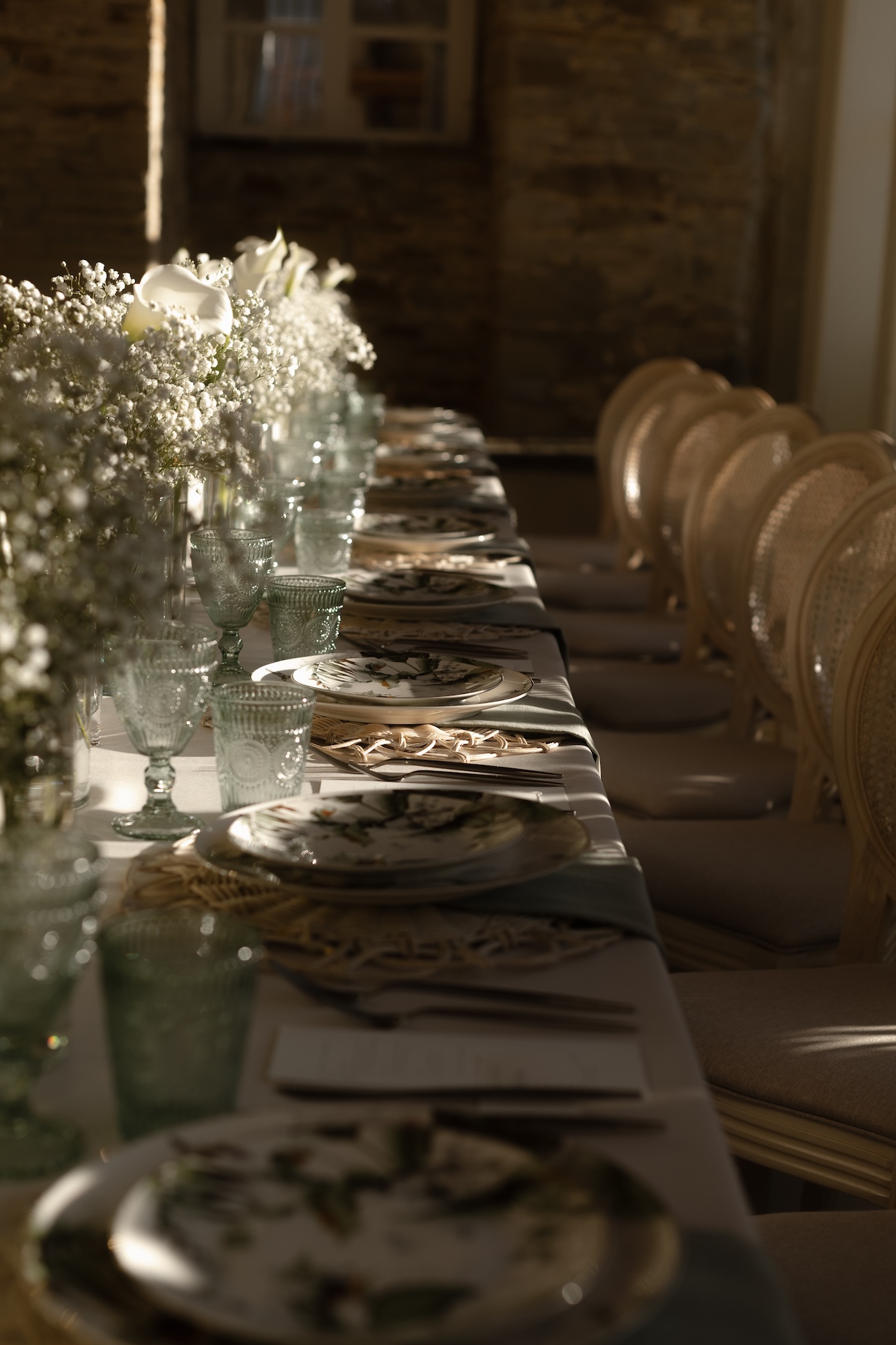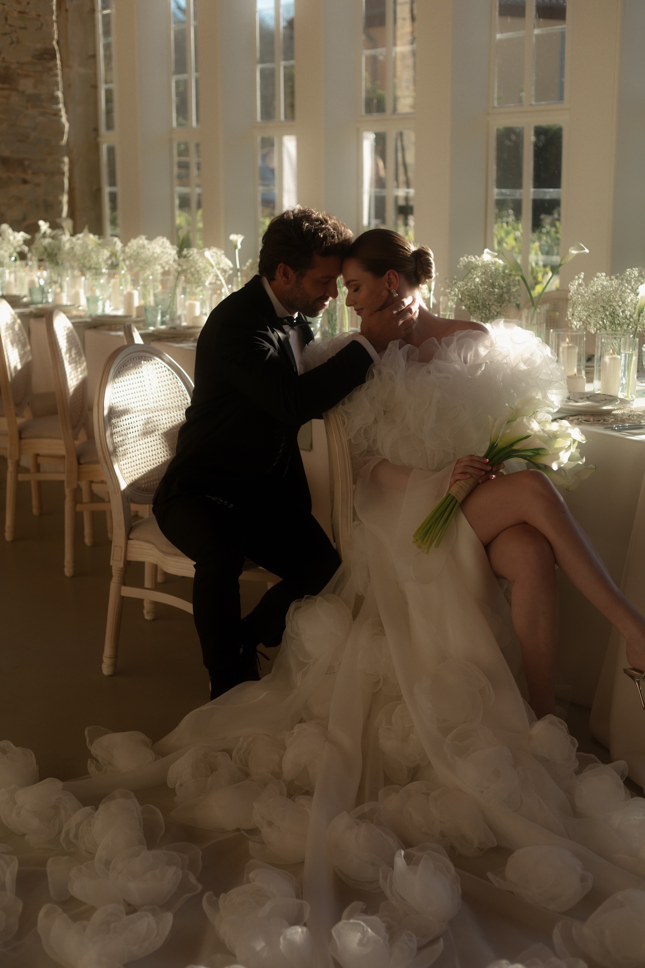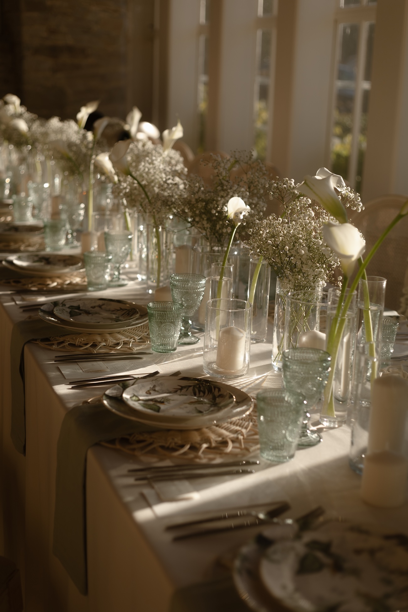 Baignée par la douceur du soleil de novembre, la scénographie se pare de nuances de verts et de tons blanc-beige, soulignées par la chaleur des bougies et de subtils accents couture. Le décor, installé dans la somptueuse Orangerie de Gut Ostenwalde, offre un écrin presque irréel : grandes fenêtres anciennes, briques méditerranéennes et jardin poétique composent un tableau digne d’un conte moderne.