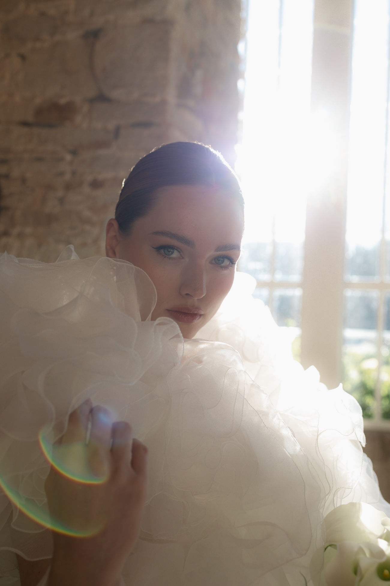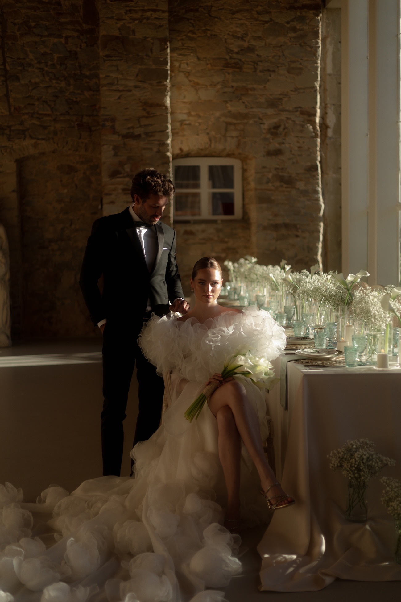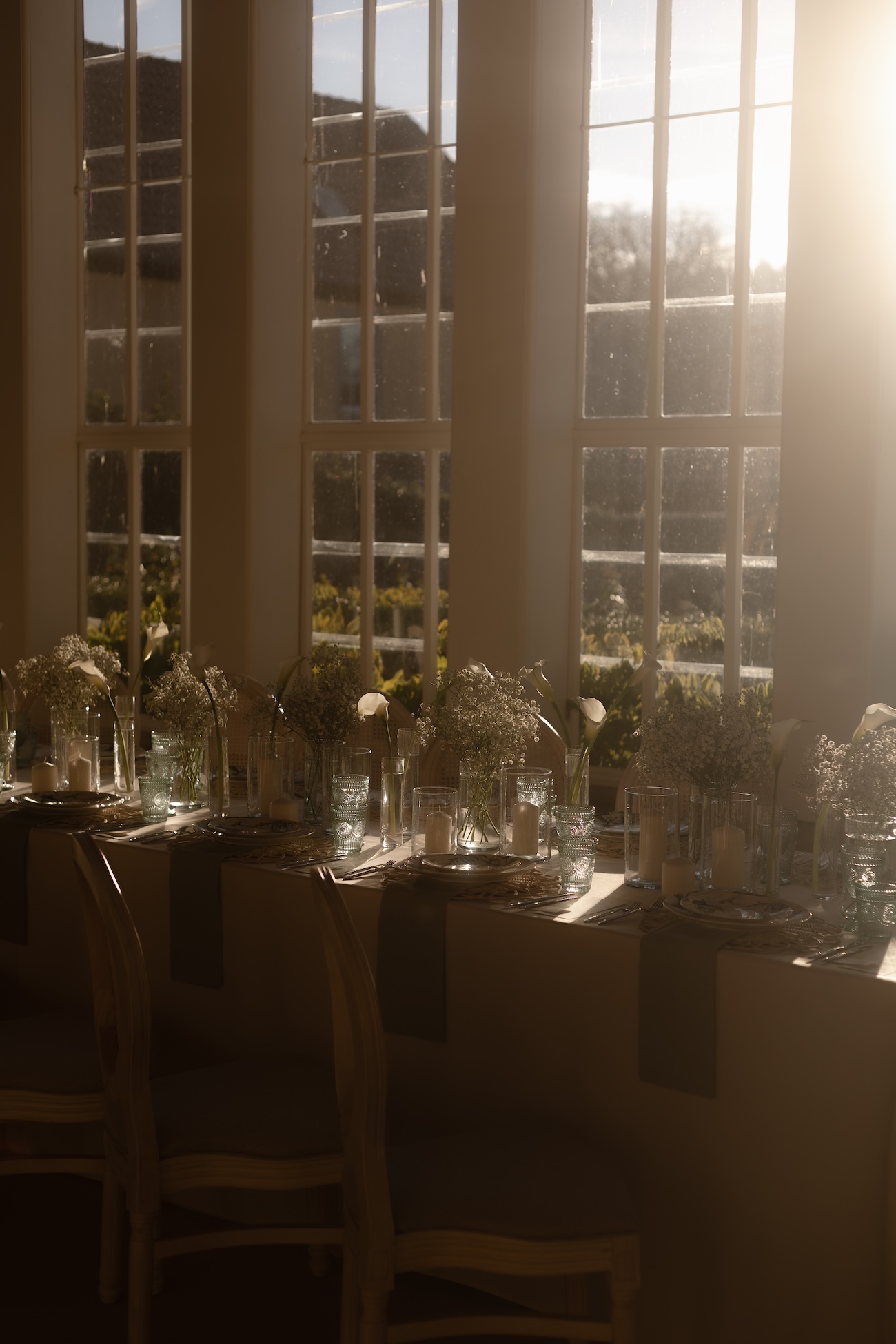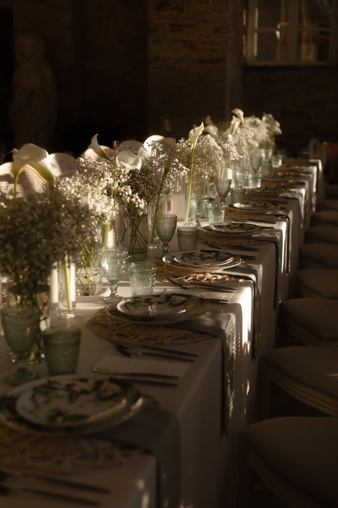 Baignée par la douceur du soleil de novembre, la scénographie se pare de nuances de verts et de tons blanc-beige, soulignées par la chaleur des bougies et de subtils accents couture. Le décor, installé dans la somptueuse Orangerie de Gut Ostenwalde, offre un écrin presque irréel : grandes fenêtres anciennes, briques méditerranéennes et jardin poétique composent un tableau digne d’un conte moderne.