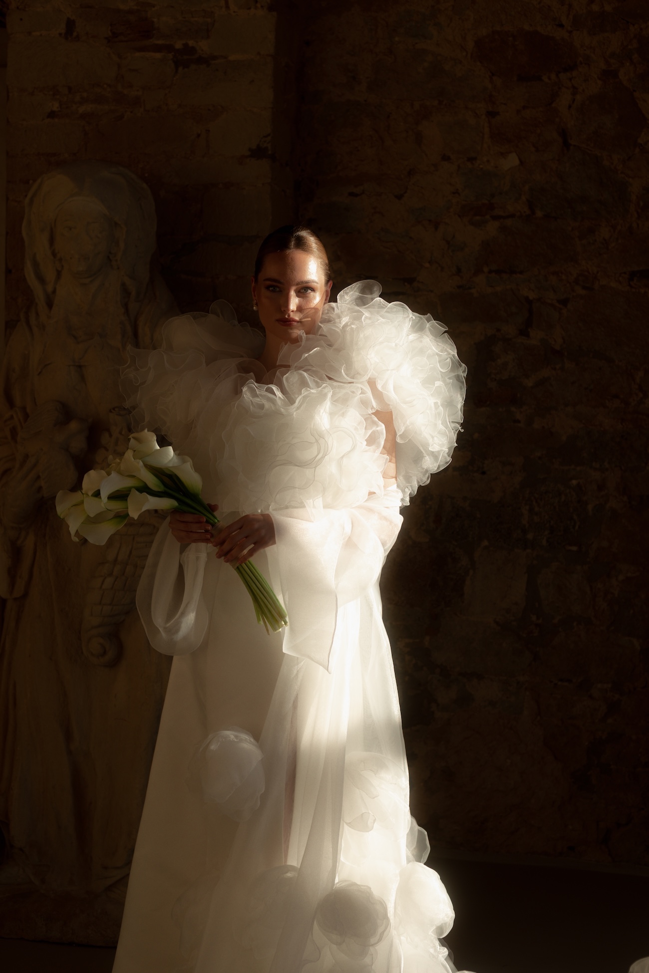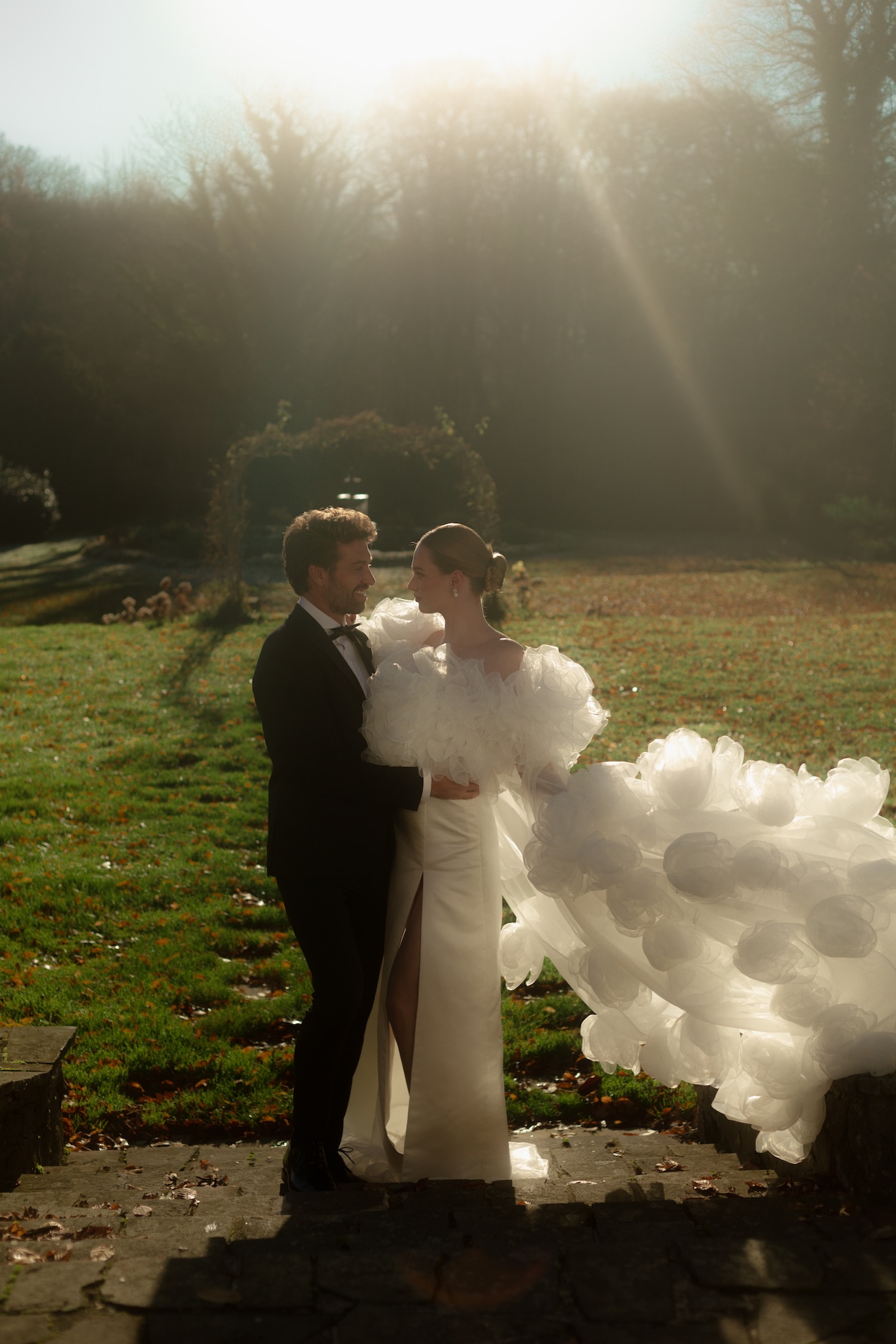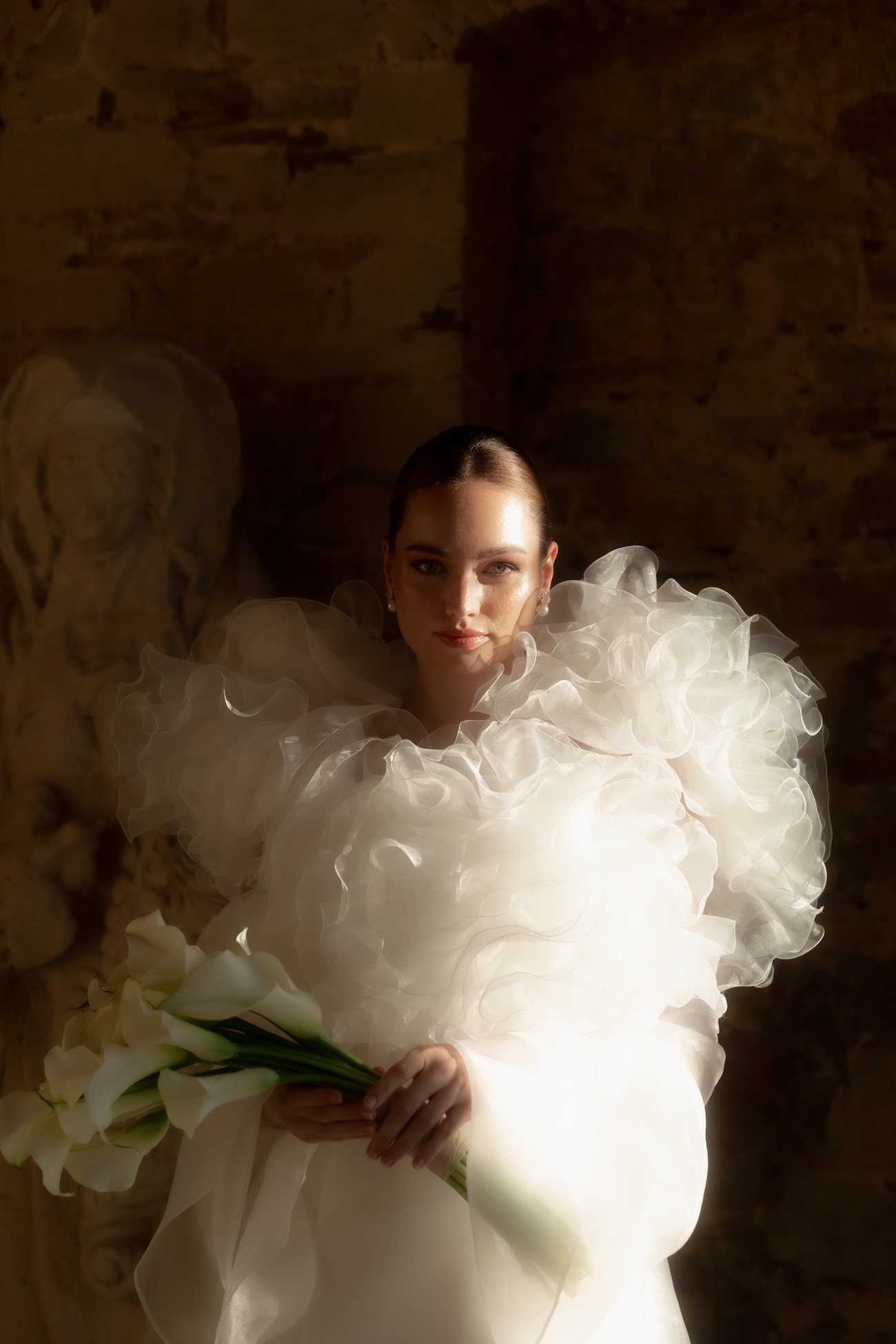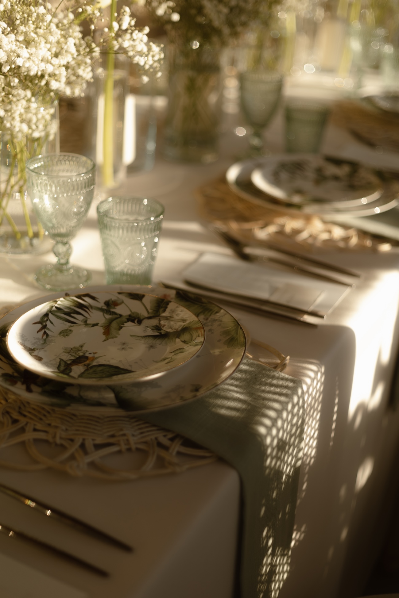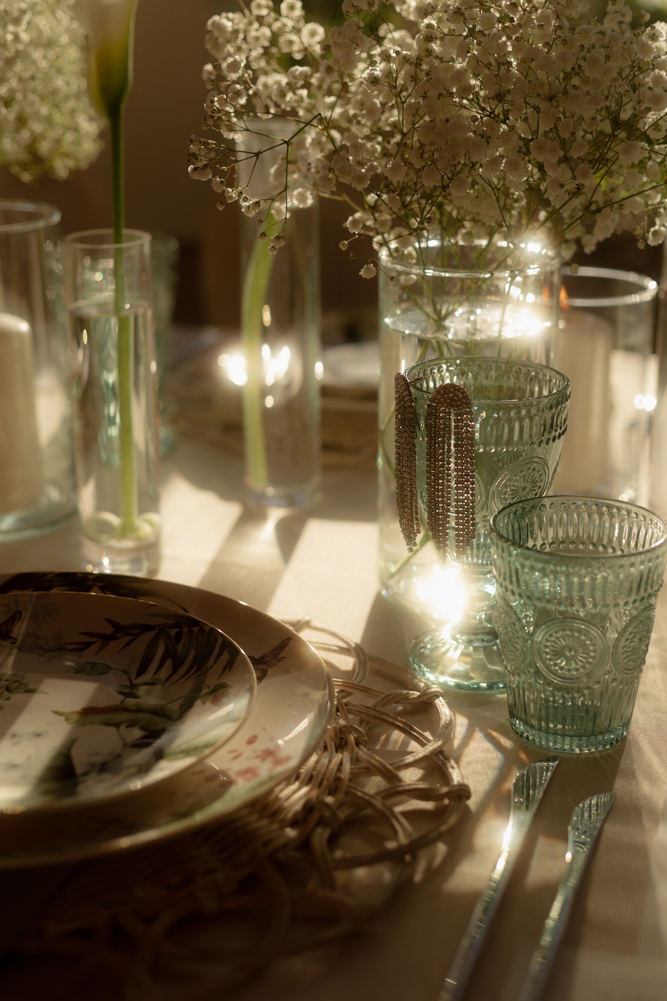 Baignée par la douceur du soleil de novembre, la scénographie se pare de nuances de verts et de tons blanc-beige, soulignées par la chaleur des bougies et de subtils accents couture. Le décor, installé dans la somptueuse Orangerie de Gut Ostenwalde, offre un écrin presque irréel : grandes fenêtres anciennes, briques méditerranéennes et jardin poétique composent un tableau digne d’un conte moderne.