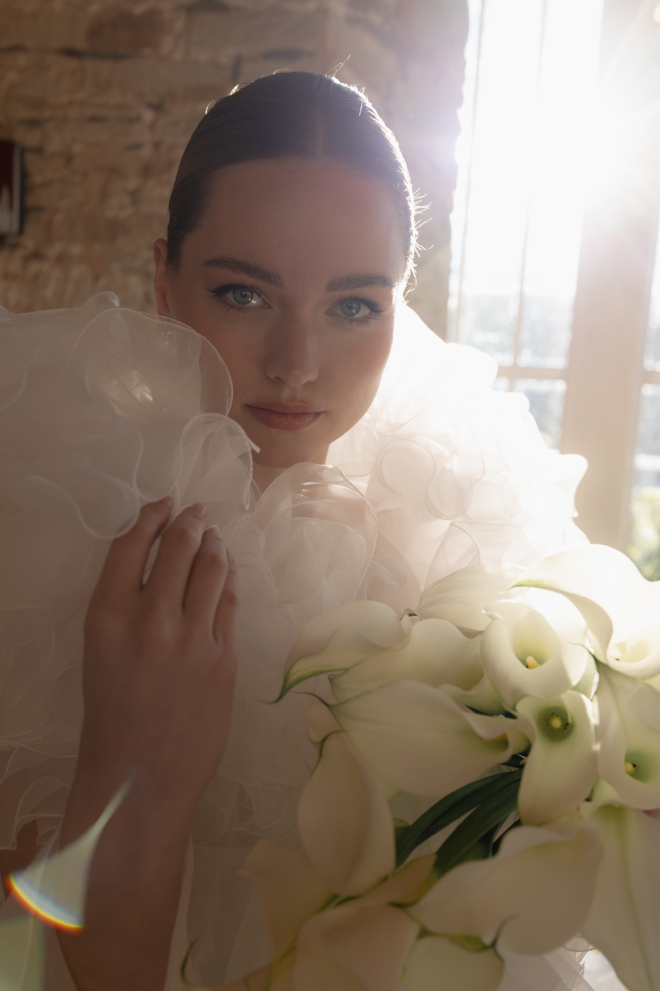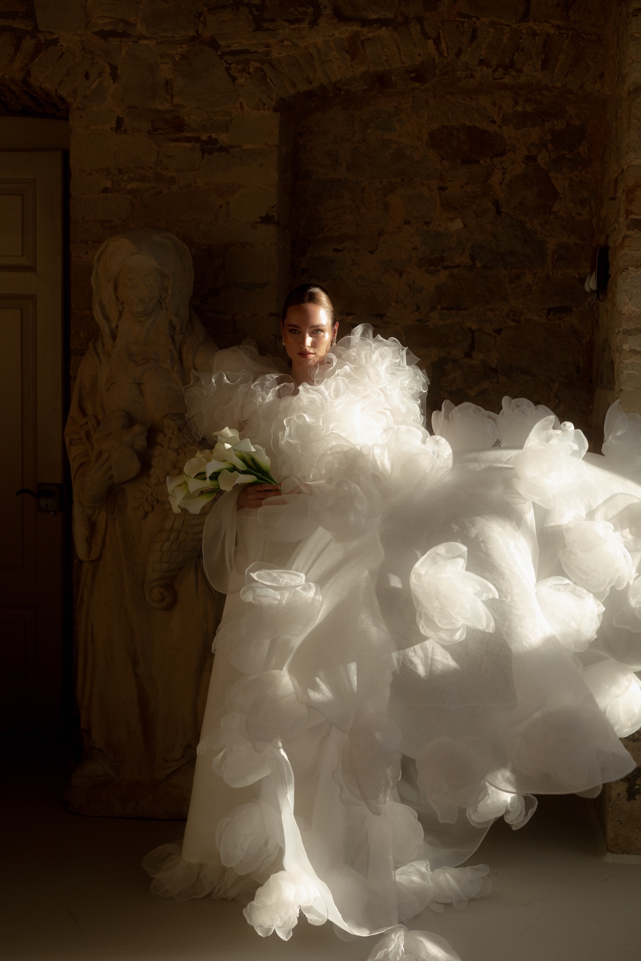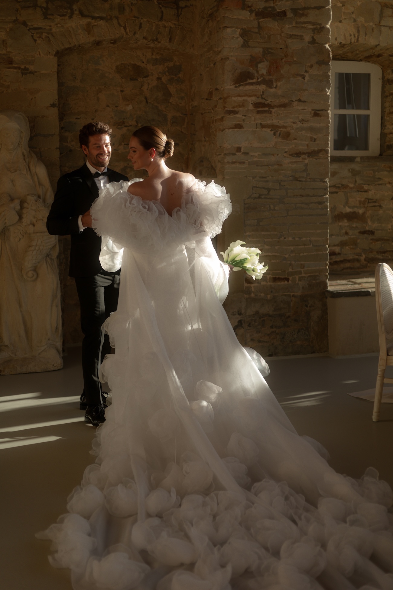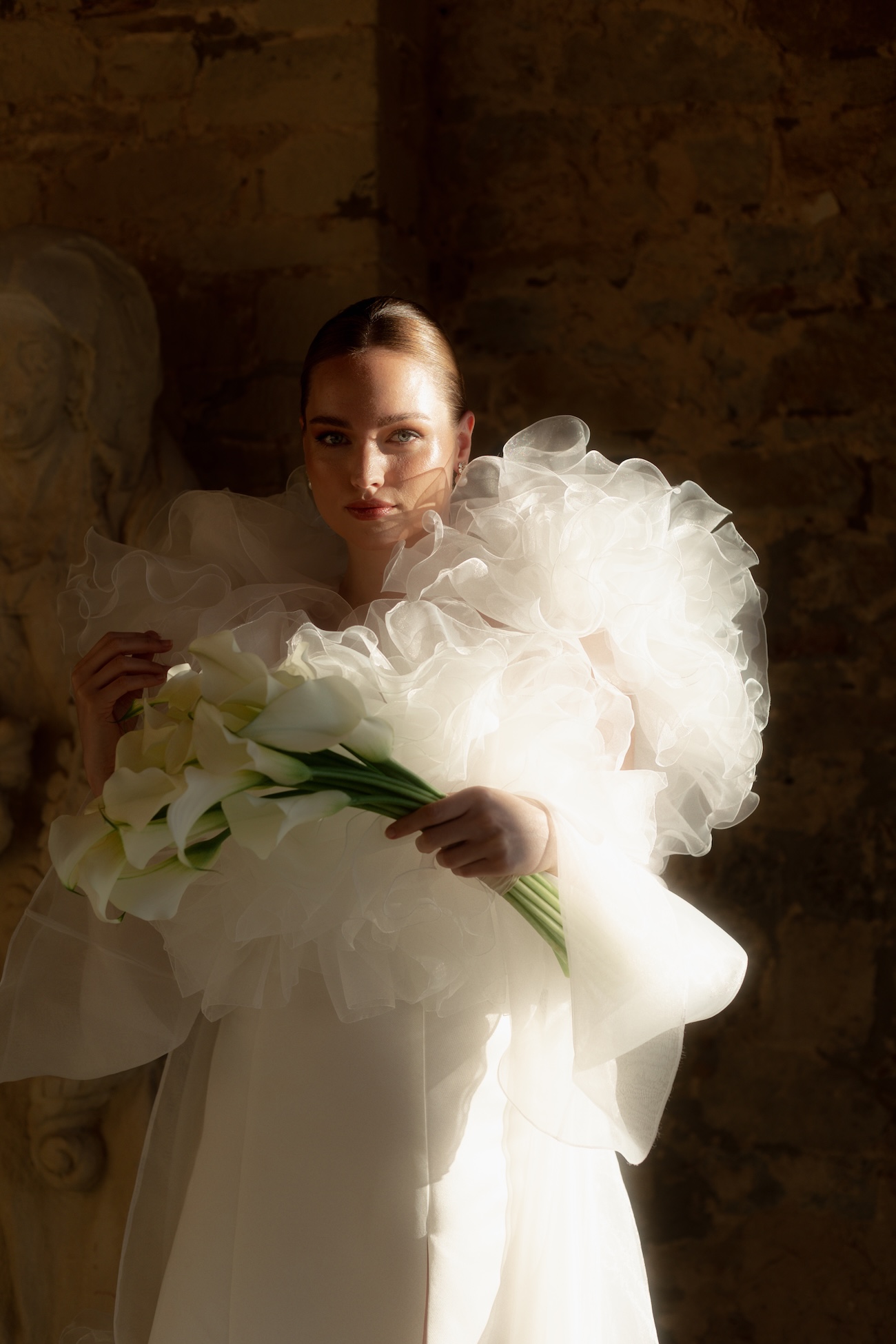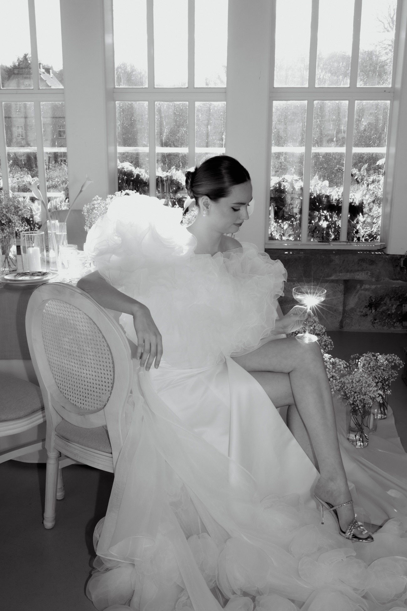 Baignée par la douceur du soleil de novembre, la scénographie se pare de nuances de verts et de tons blanc-beige, soulignées par la chaleur des bougies et de subtils accents couture. Le décor, installé dans la somptueuse Orangerie de Gut Ostenwalde, offre un écrin presque irréel : grandes fenêtres anciennes, briques méditerranéennes et jardin poétique composent un tableau digne d’un conte moderne.