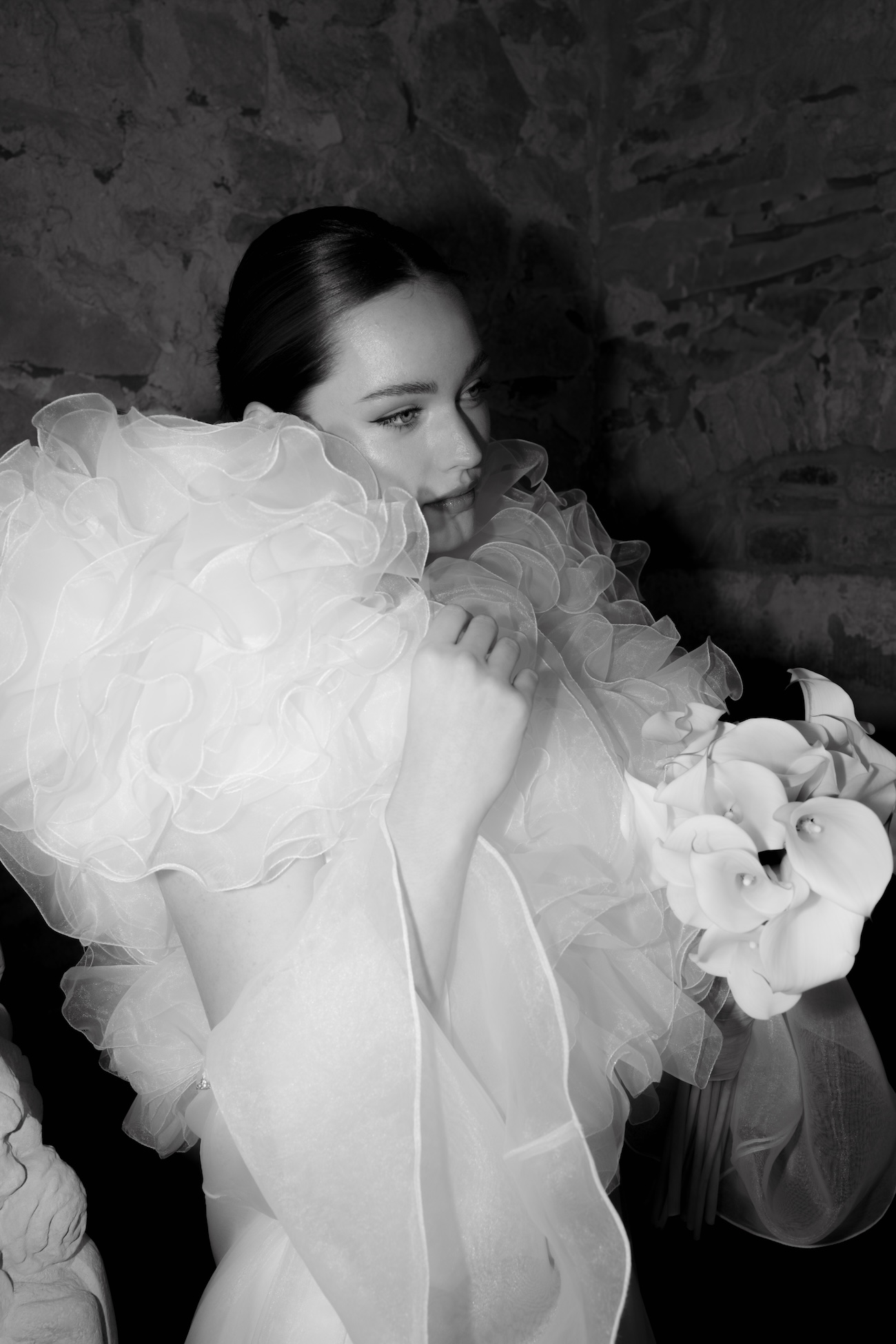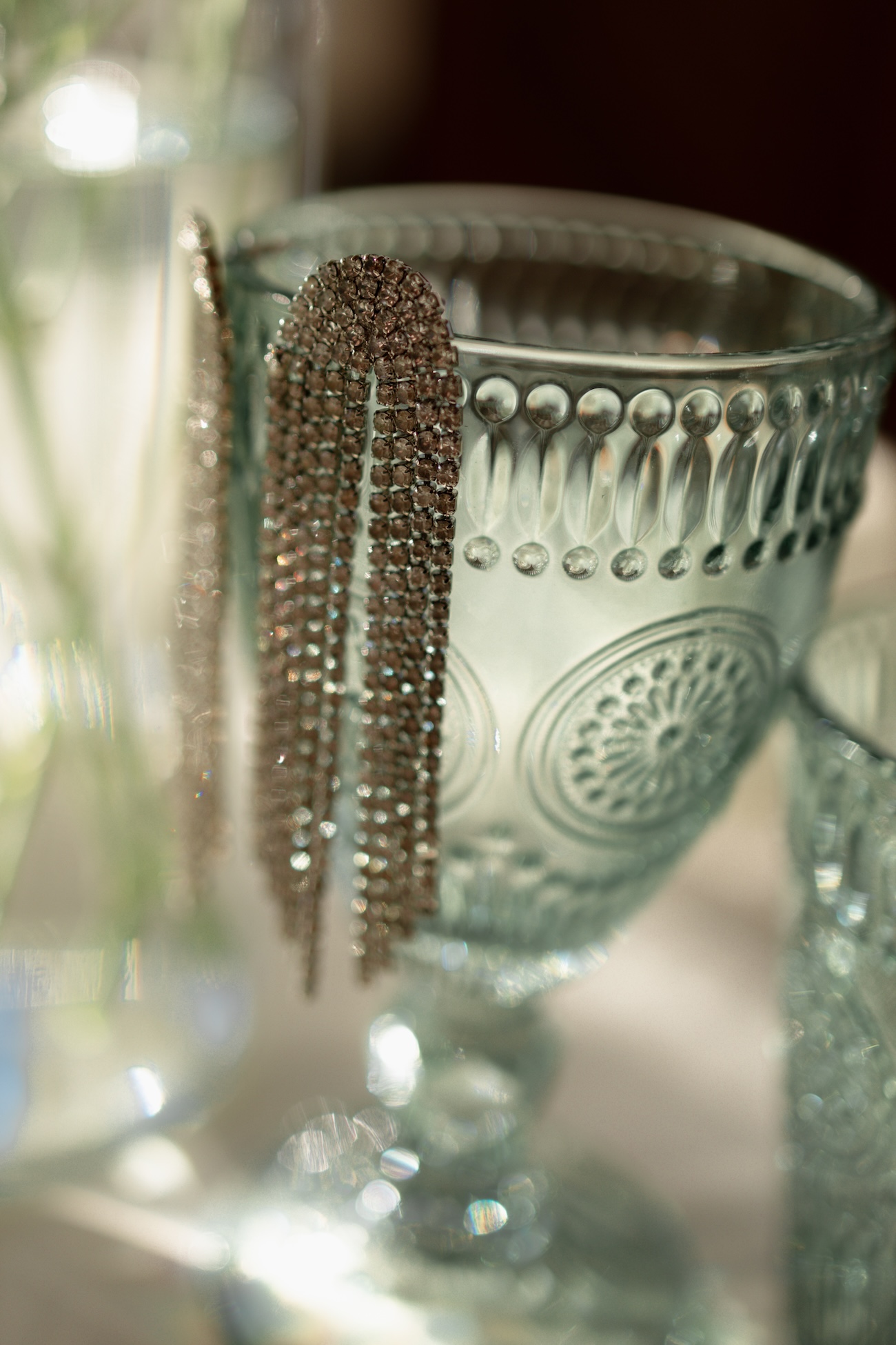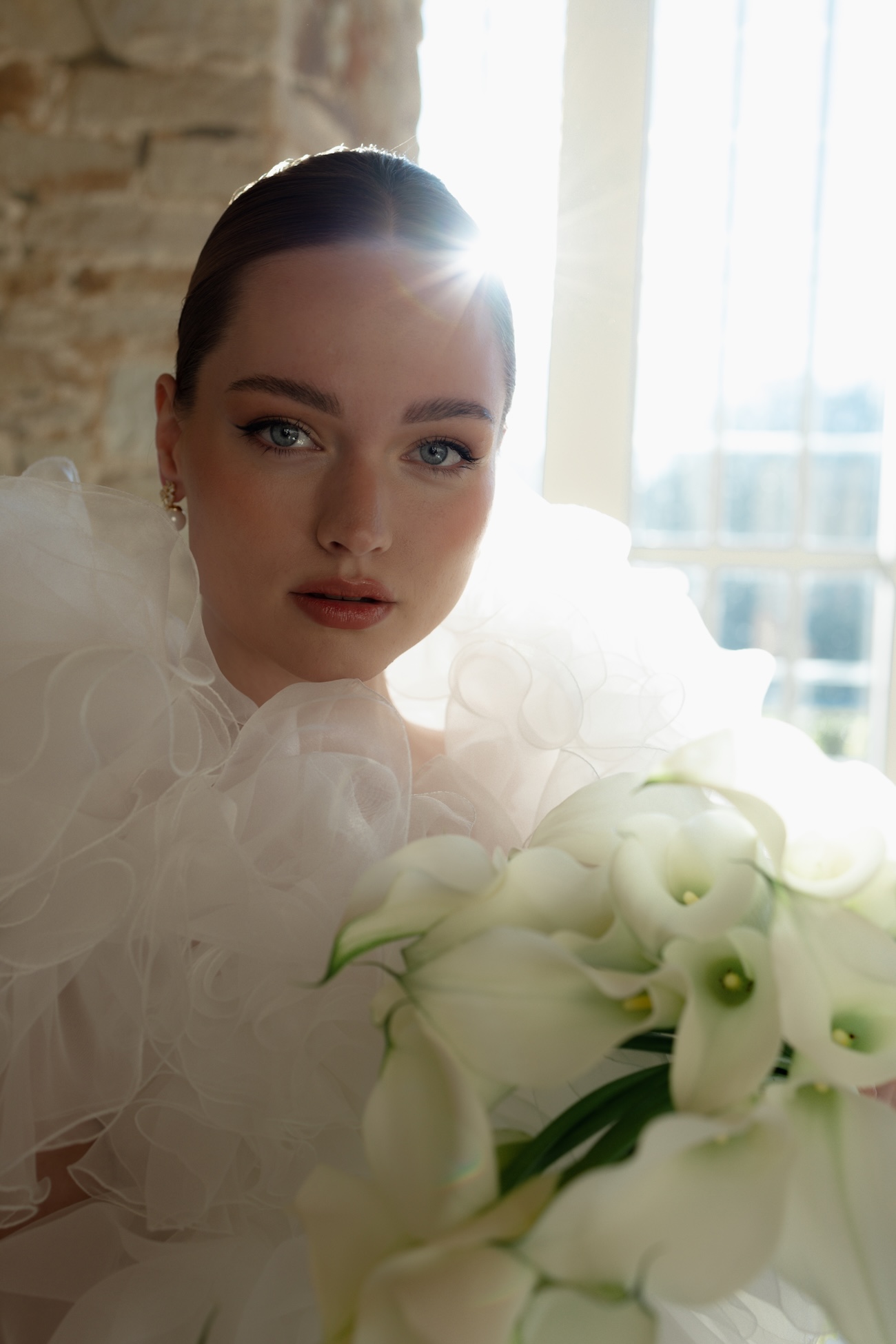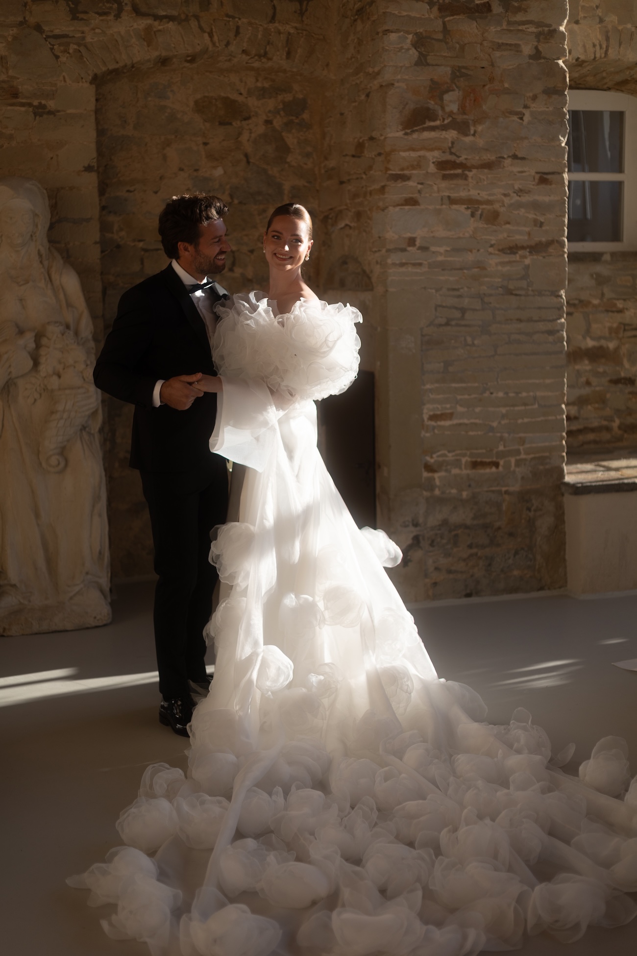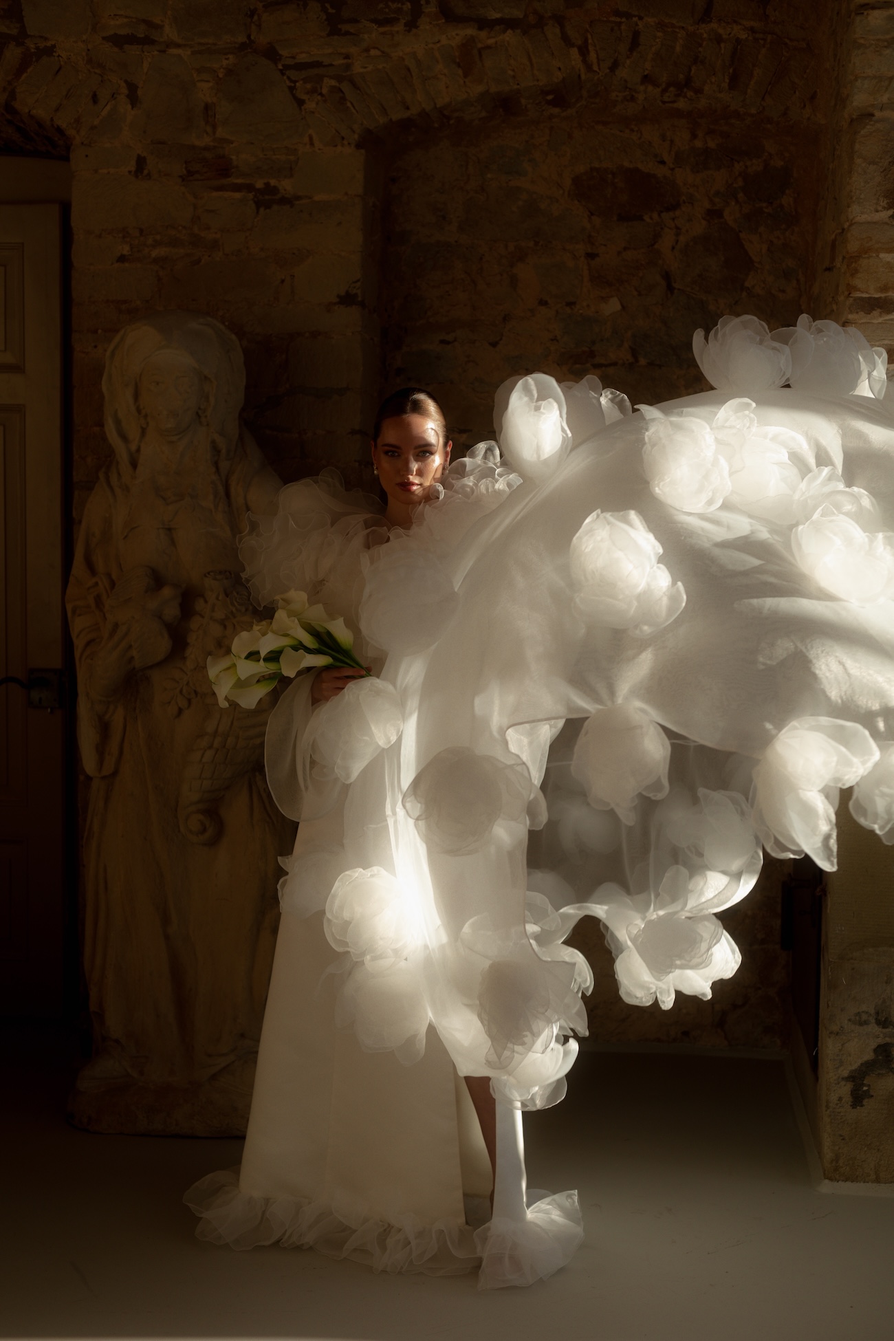 Baignée par la douceur du soleil de novembre, la scénographie se pare de nuances de verts et de tons blanc-beige, soulignées par la chaleur des bougies et de subtils accents couture. Le décor, installé dans la somptueuse Orangerie de Gut Ostenwalde, offre un écrin presque irréel : grandes fenêtres anciennes, briques méditerranéennes et jardin poétique composent un tableau digne d’un conte moderne.