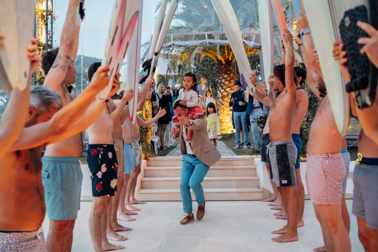« La surprise que nous a fait la maman de mon mari qui nous préparé avec l’aide de nos copains une haie d’honneur de surfeurs comme à Hawaï pour l’arrivée des mariées ».