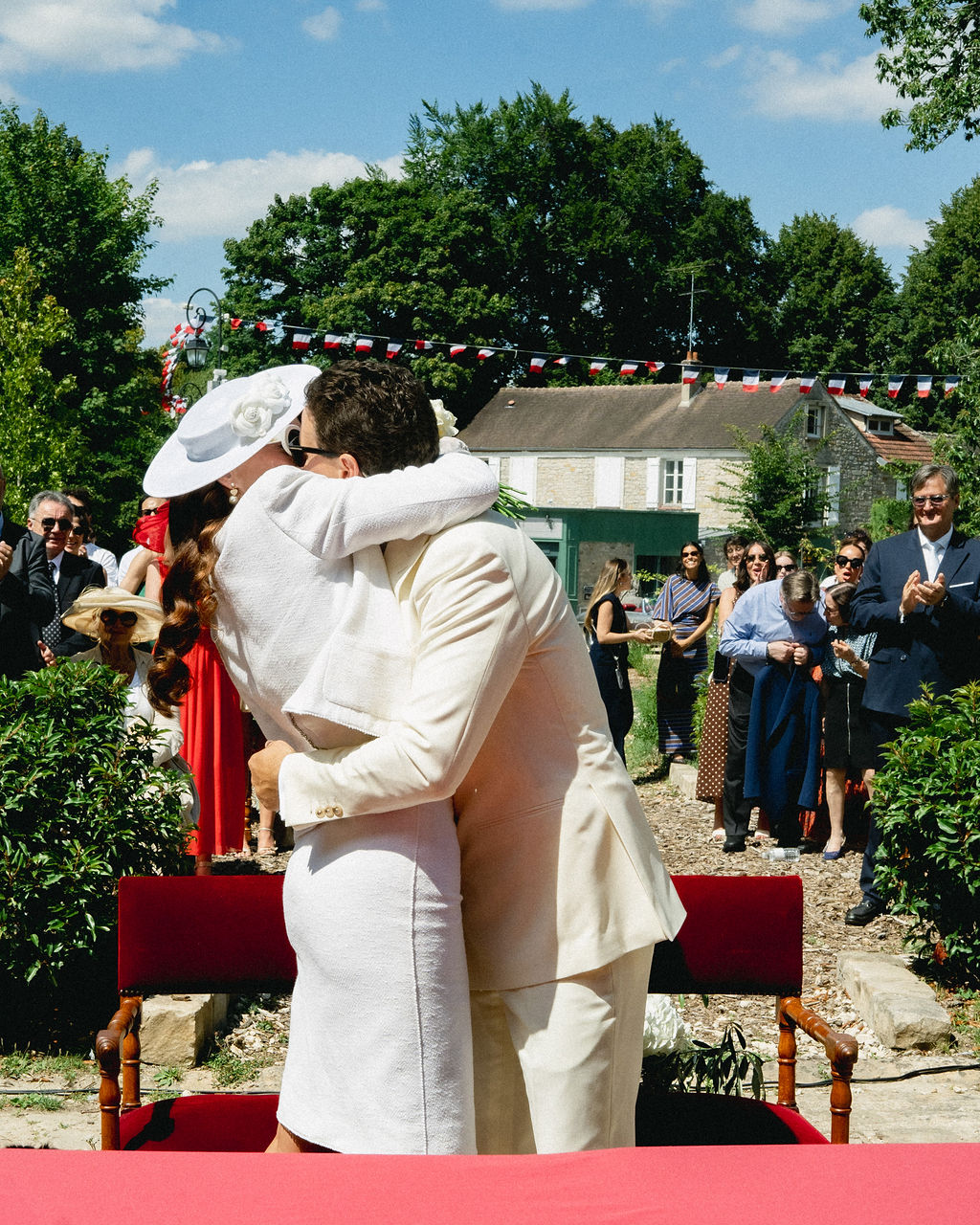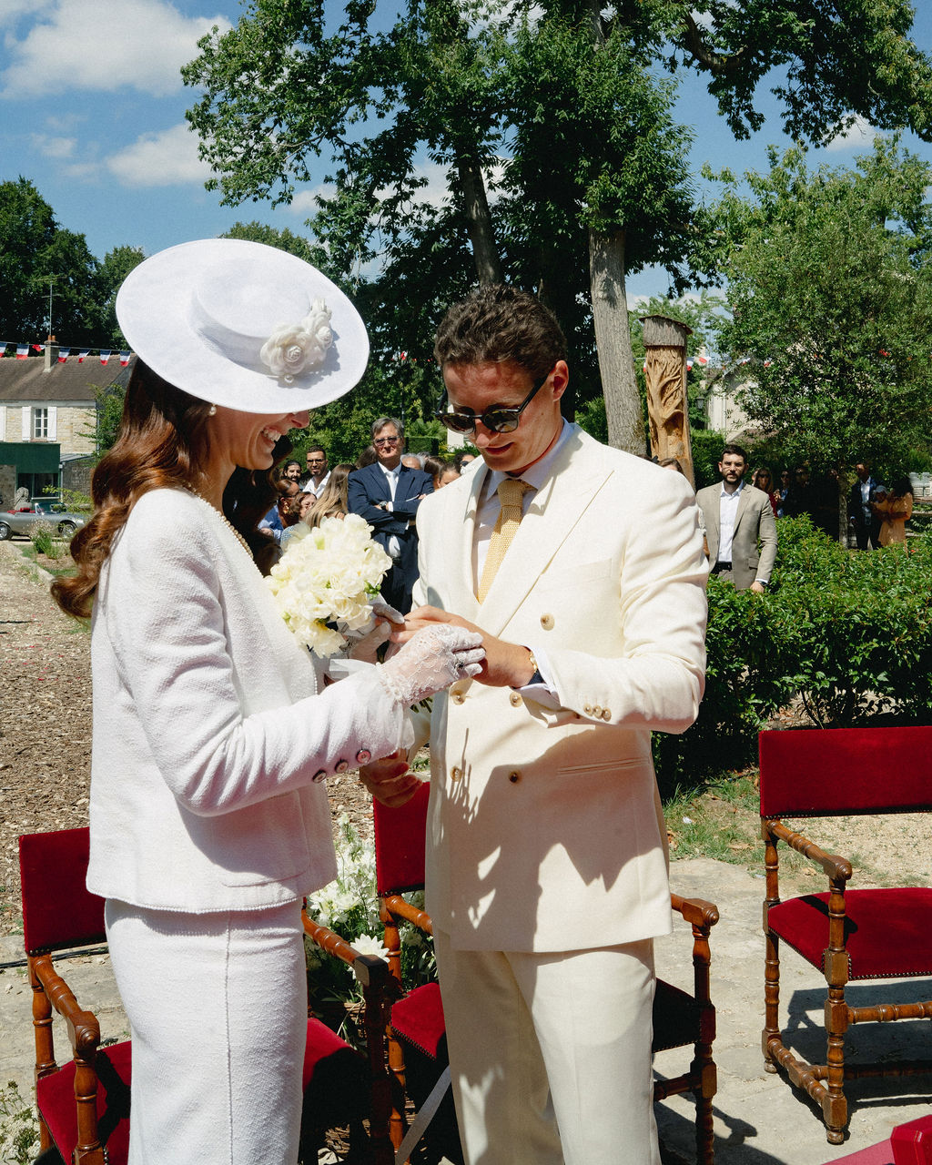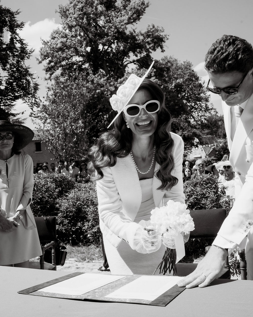 Pour la mairie, je rêvais depuis toujours d’un tailleur Chanel avec un chapeau. Hugo portait un costume croisé blanc avec des lunettes de soleil, très sobre.