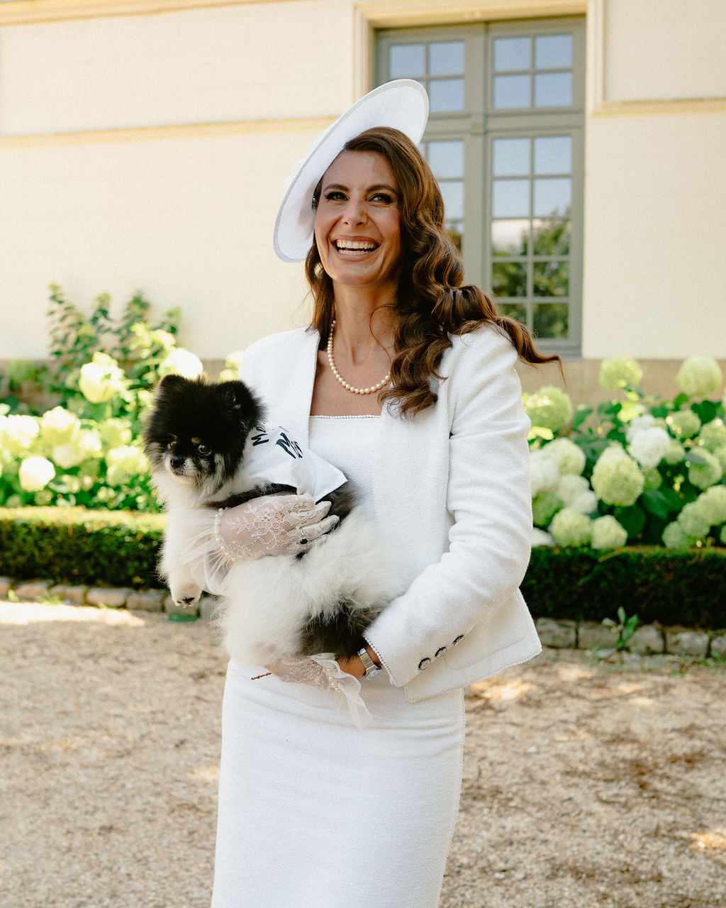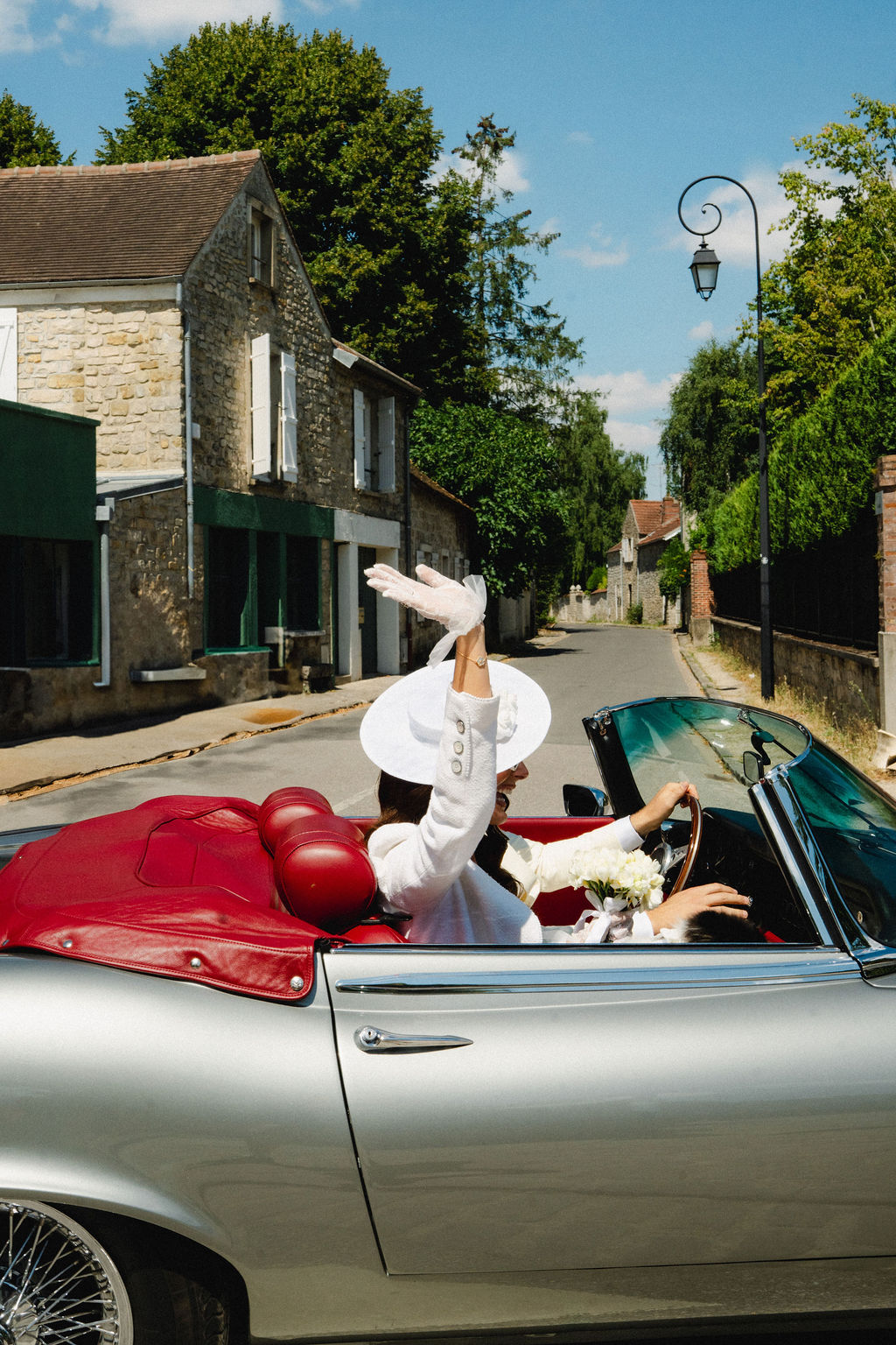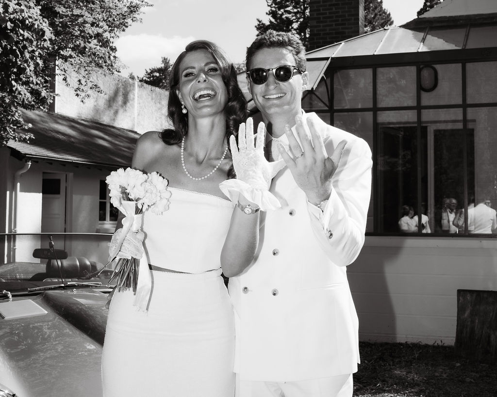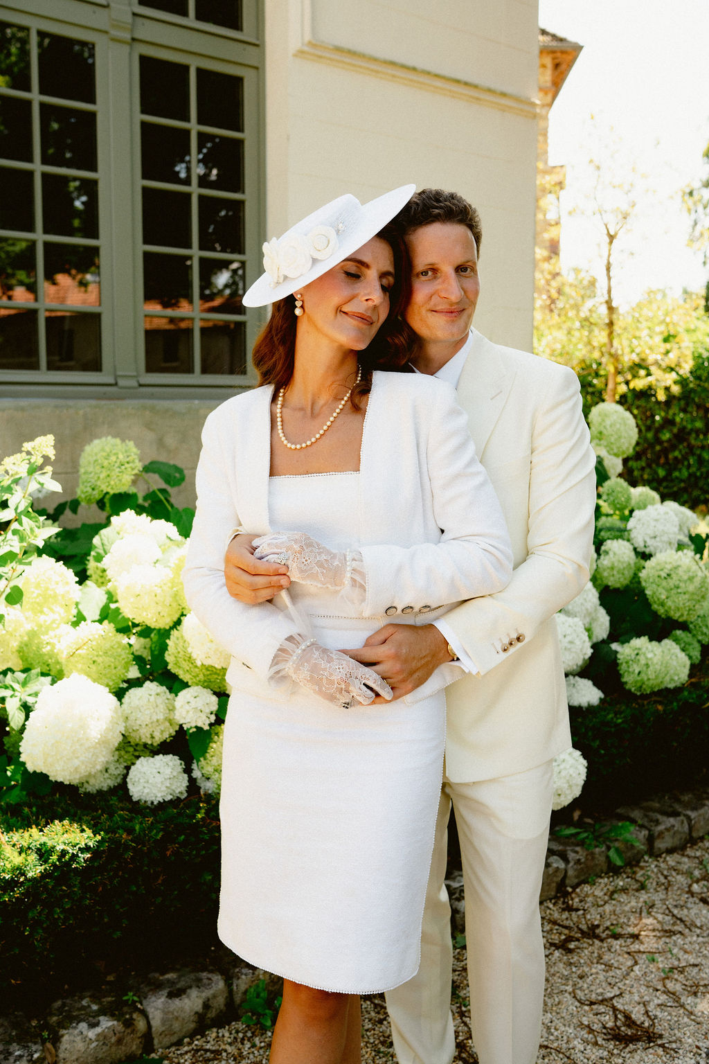 Pour la mairie, je rêvais depuis toujours d’un tailleur Chanel avec un chapeau. Hugo portait un costume croisé blanc avec des lunettes de soleil, très sobre.