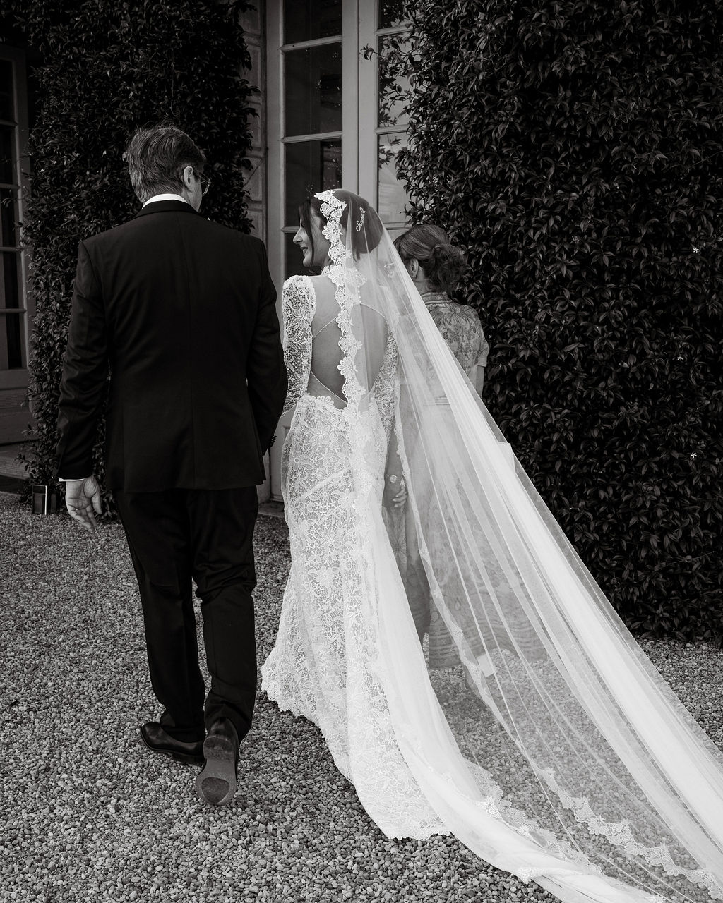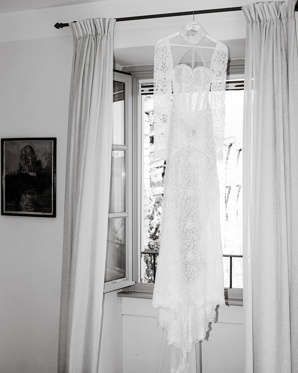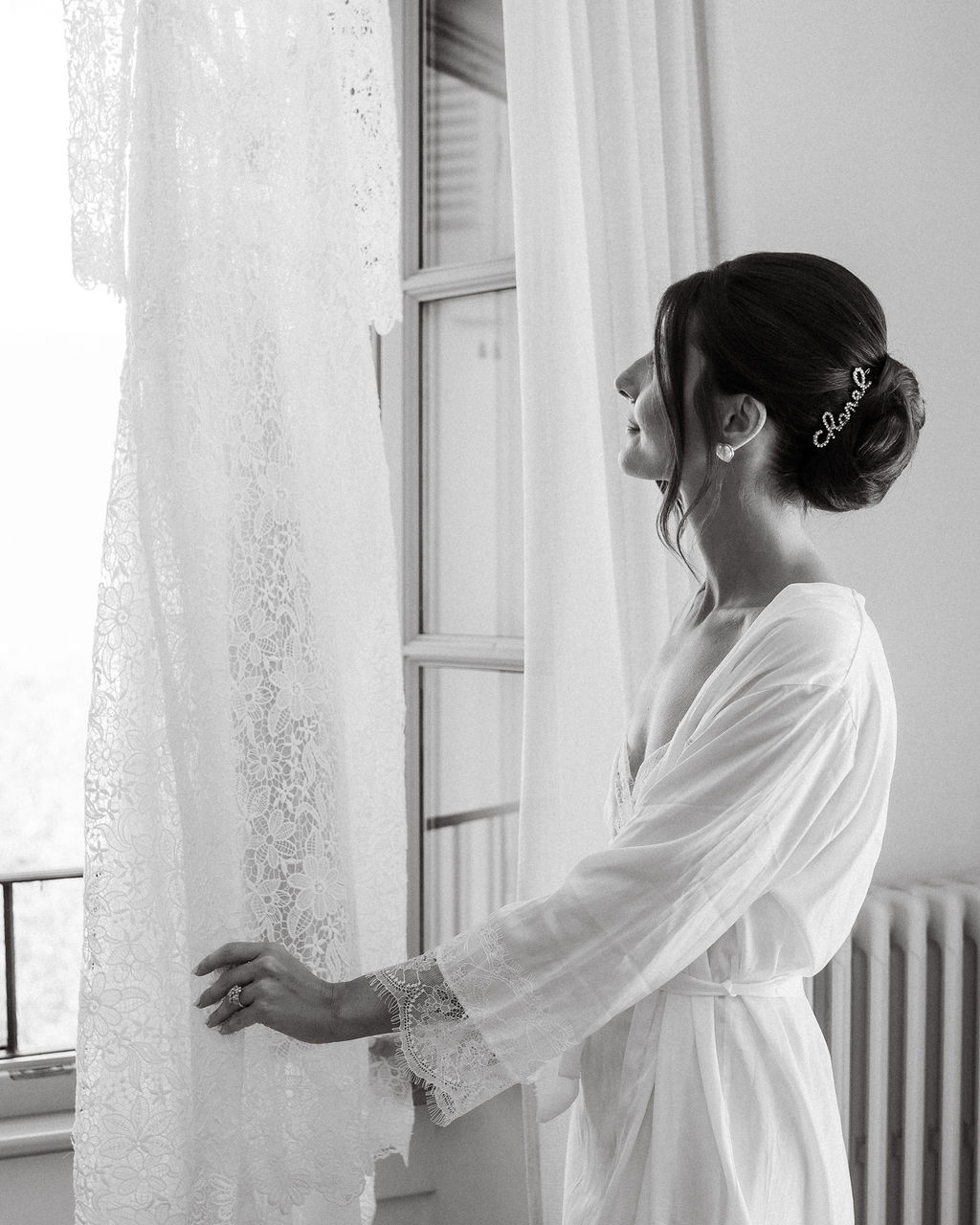 Nous avions des idées très précises. Sobre mais chic. Pour la cérémonie, je voulais une robe travaillée, près du corps, avec un beau décolleté dans le dos. Hugo, lui, voulait un style “James Bond”.