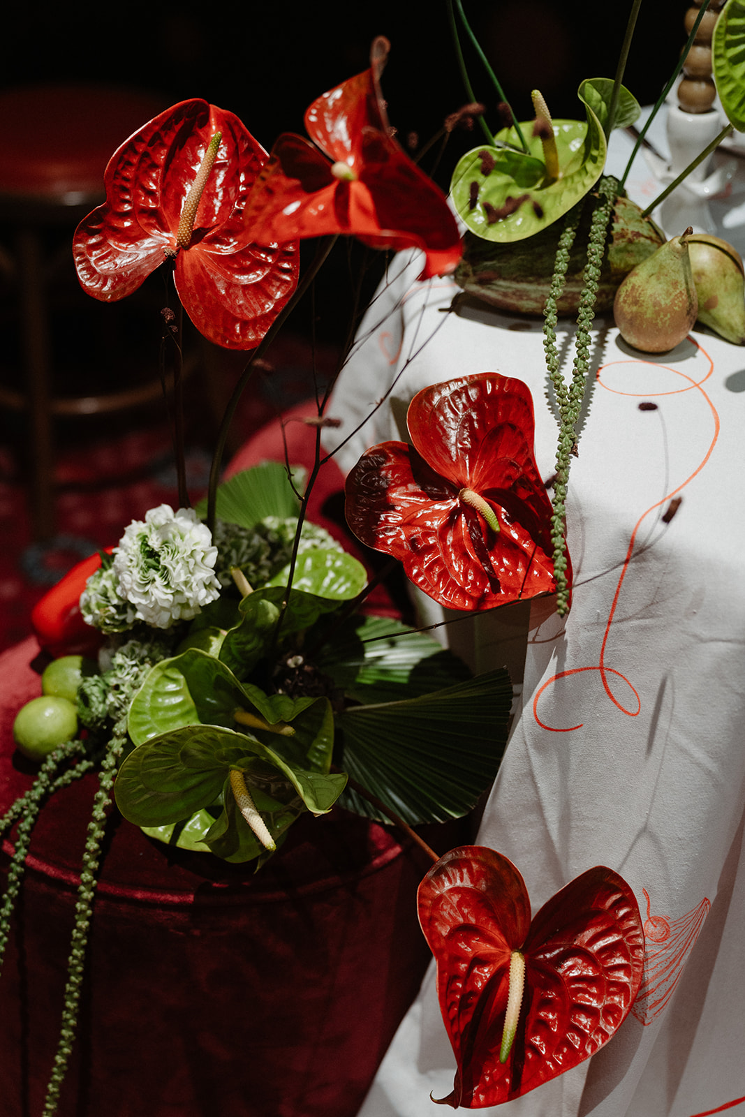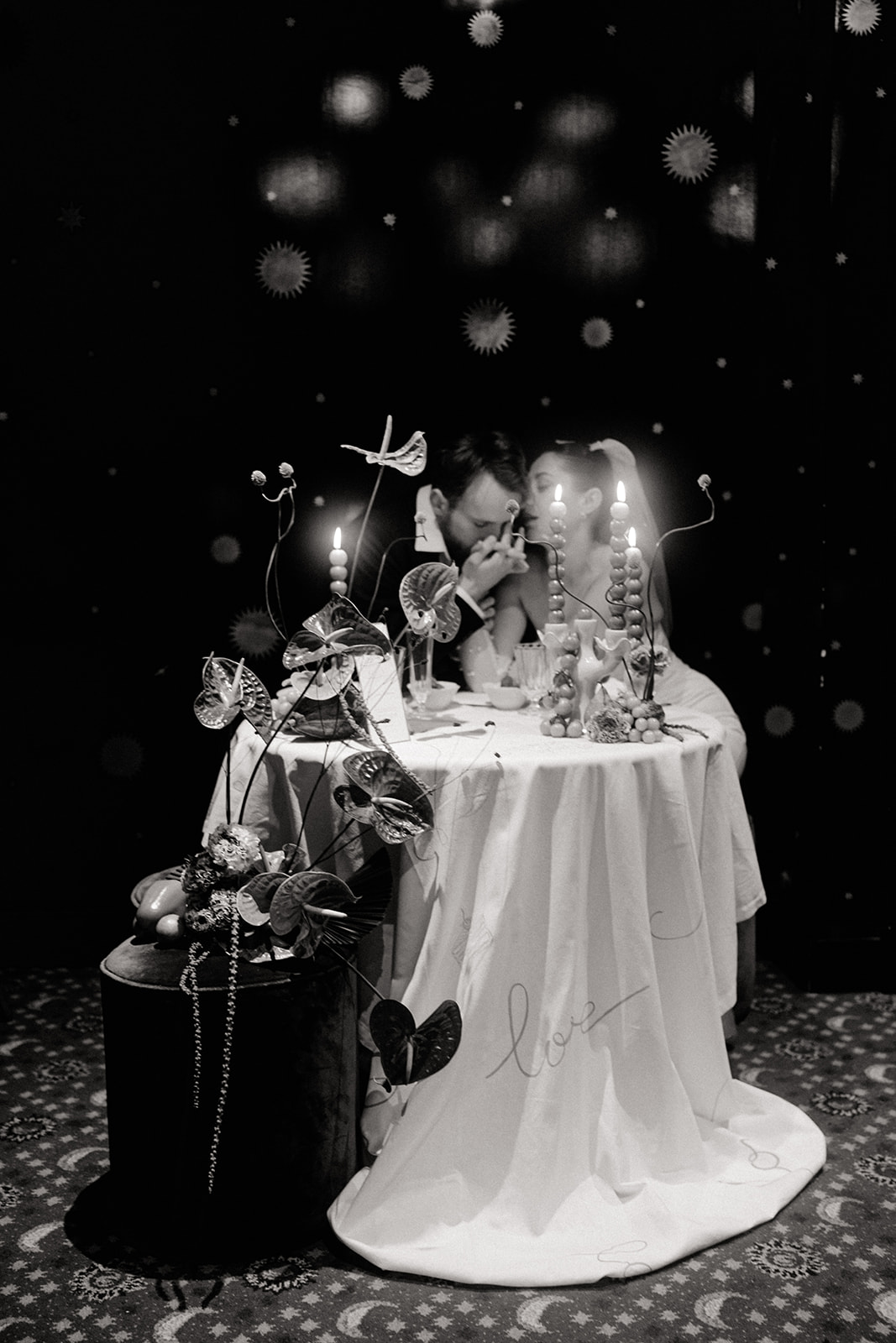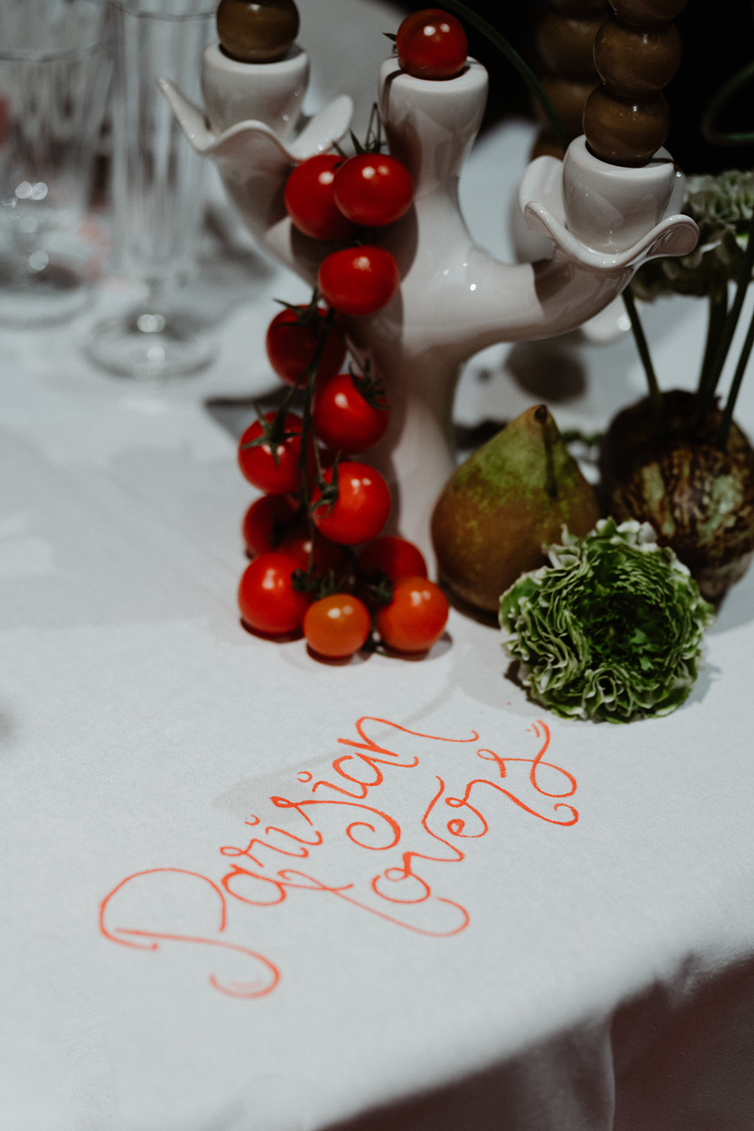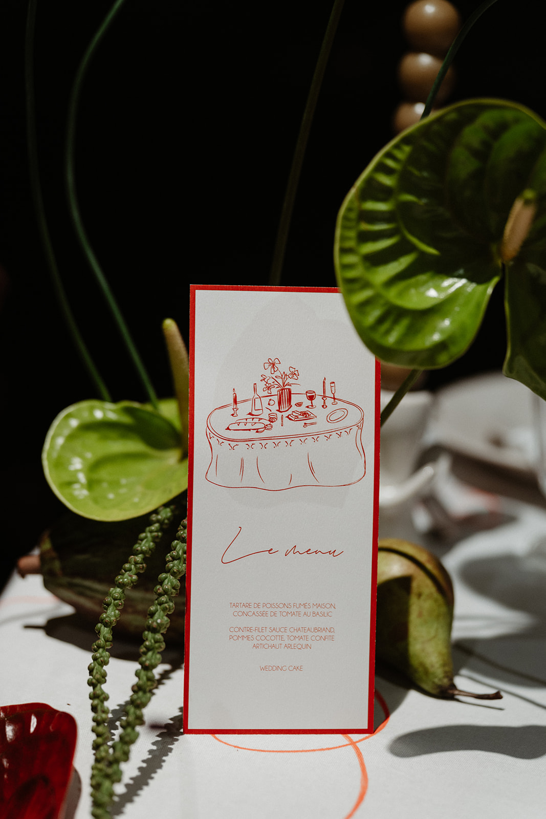 3. Éléments décoratifs : Chaque élément de la scénographie a été soigneusement sélectionné pour renforcer le thème parisien et l’ambiance romantique. Des détails comme des chandeliers vintage, des arrangements floraux délicats avec des Arums, ainsi que des détails au niveau de la Nappe avec des mots D’ Amour calligraphiés à main levé ont été incorporés pour ajouter une touche de modernité osée.