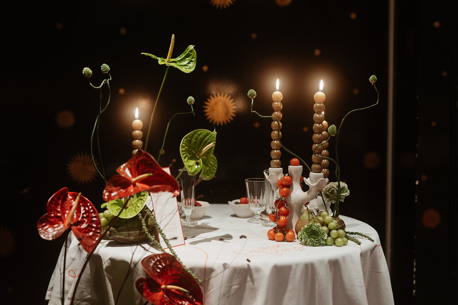 4. Disposition de l’espace : La disposition de l’espace est cruciale pour créer une ambiance immersive. Pour ce shooting, j’ai imaginé une mise en scène intime dans un Speakeasy, avec une table de réception dressée pour deux personnes sur une toile de fond romantique composée d’Argenterie vintage, de chandeliers et des assiettes en porcelaine, des bougies texturées vertes, ainsi que des fruits et des légumes.