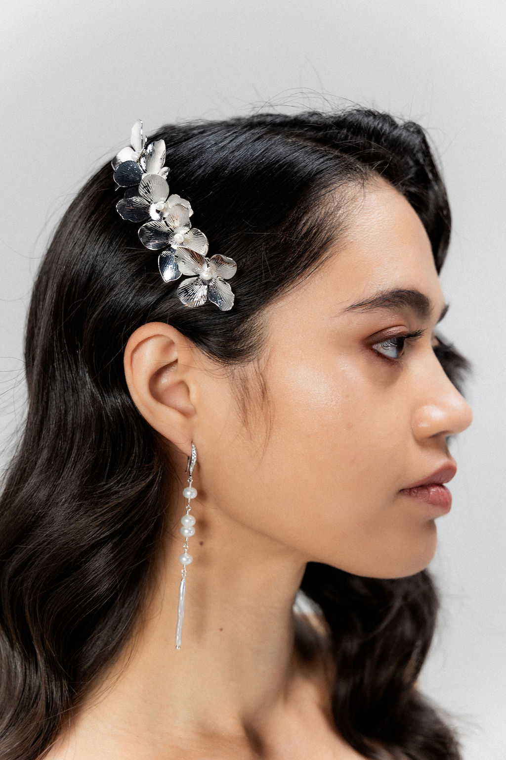 Nous travaillons le laiton doré à l’or fin pour les accessoires cheveux. Pour les bijoux, j’utilise le plaqué or, l’argent 925, le vermeil, les perles d’eau douce naturelles, la nacre facettée ainsi que des zircons blancs ou colorés.