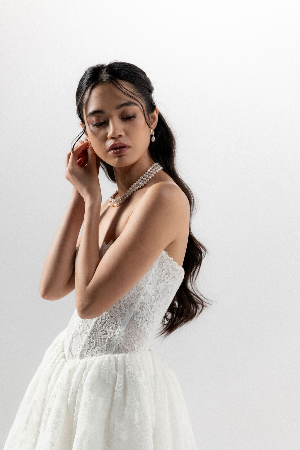 Le mariage porte une dimension symbolique forte. J’aime conserver certains codes – la perle, la lumière, la délicatesse – tout en les interprétant de façon actuelle.