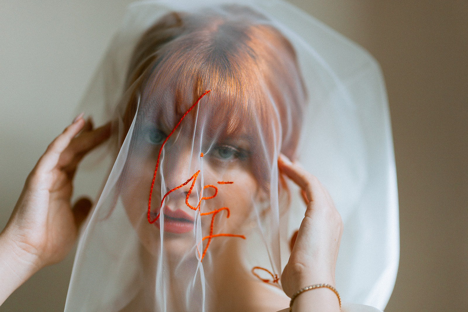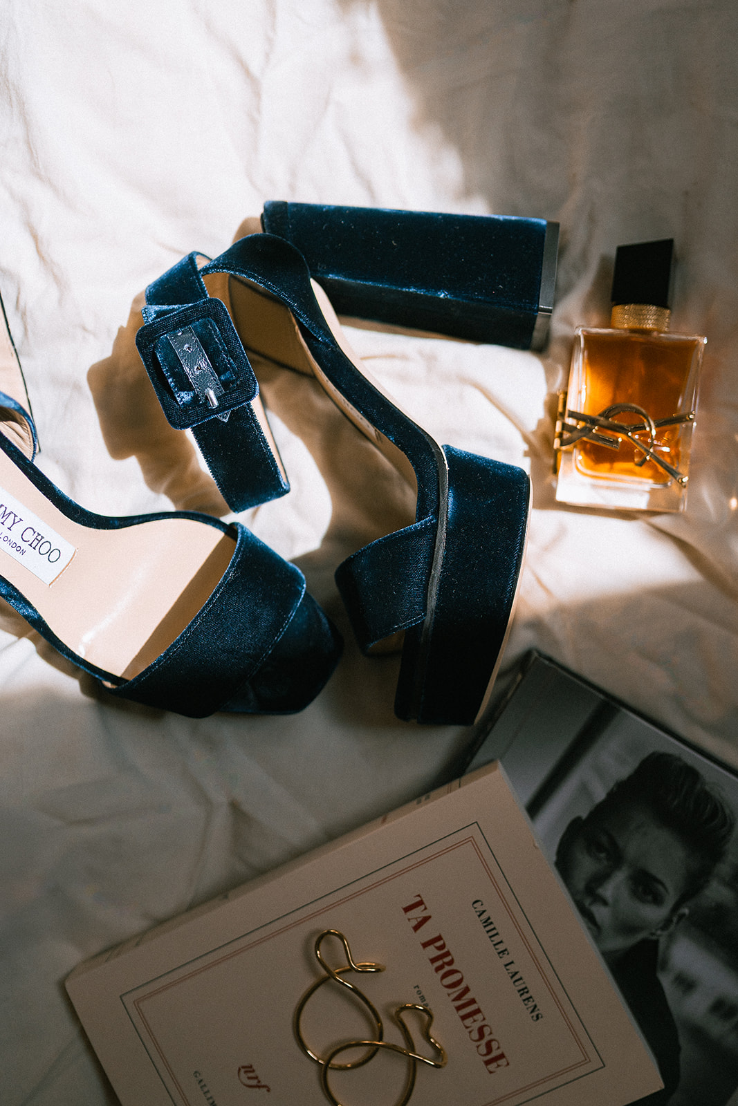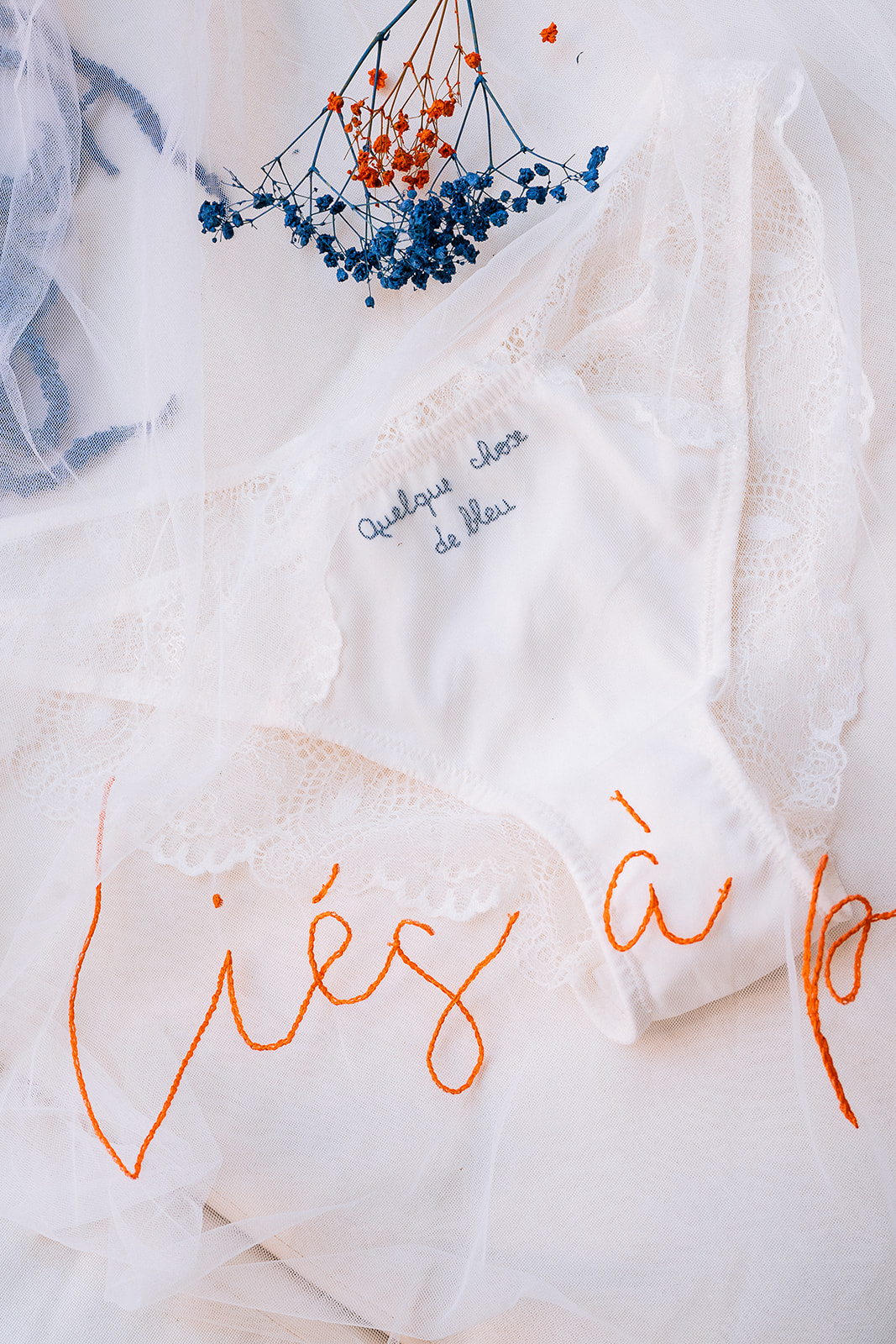 Manon Ponson nous a proposé une petite culotte coup de coeur brodée en bleu, parfaite pour porter sous la robe et les câlins dans la chambre. Et comme c’est sa spécialité, elle a réalisé pour nous un voile mi long brodé des mots « liés à perpétuité » dans les couleurs du mariage. J’adore les touches colorées apportées par les accessoires de la mariée. Et pour la soirée, notre mariée portait aussi des mitaines perlées de sa collection.