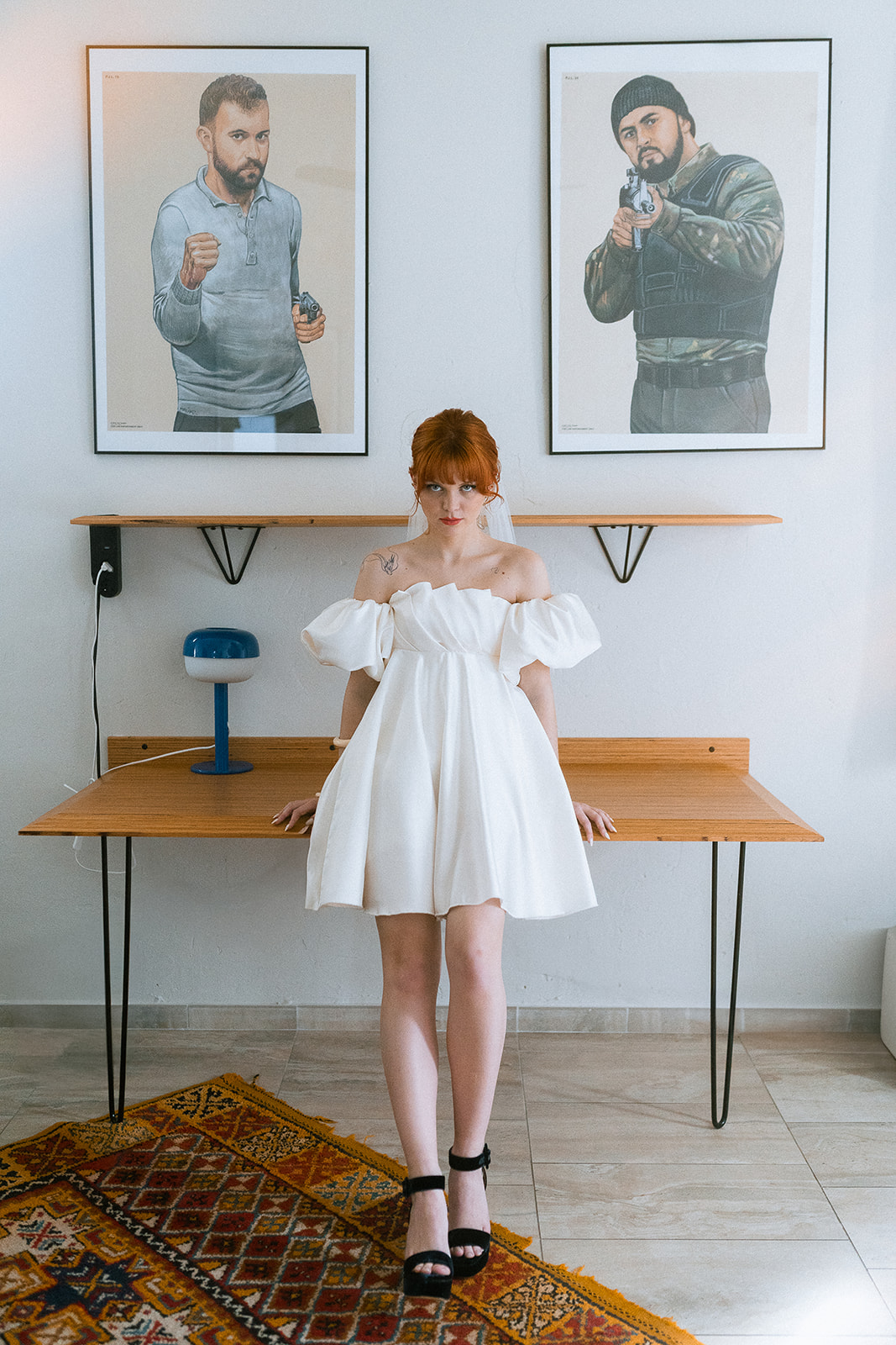 Dès les débuts de l’organisation nous savions que nous voulions une robe courte au look vintage qui rappelle les looks de twiggy ou Jane birkin. Trouver un créateur de la région qui réalise ce style de robe n’a pas été une mince affaire. Et puis avec l’aide de Cathy j’ai découvert Laure, la créatrice marseillaise de Gisèle et Simone qui réalise des robes de mariée sur mesure. Elle avait dans sa collection deux robes mini. La première, qu’elle a upcyclée depuis une ancienne robe longue chinée, a été la robe principale de la journée. La seconde, asymétrique et composée d’une traine pour la soirée.