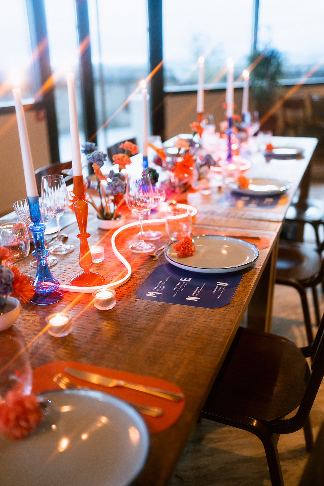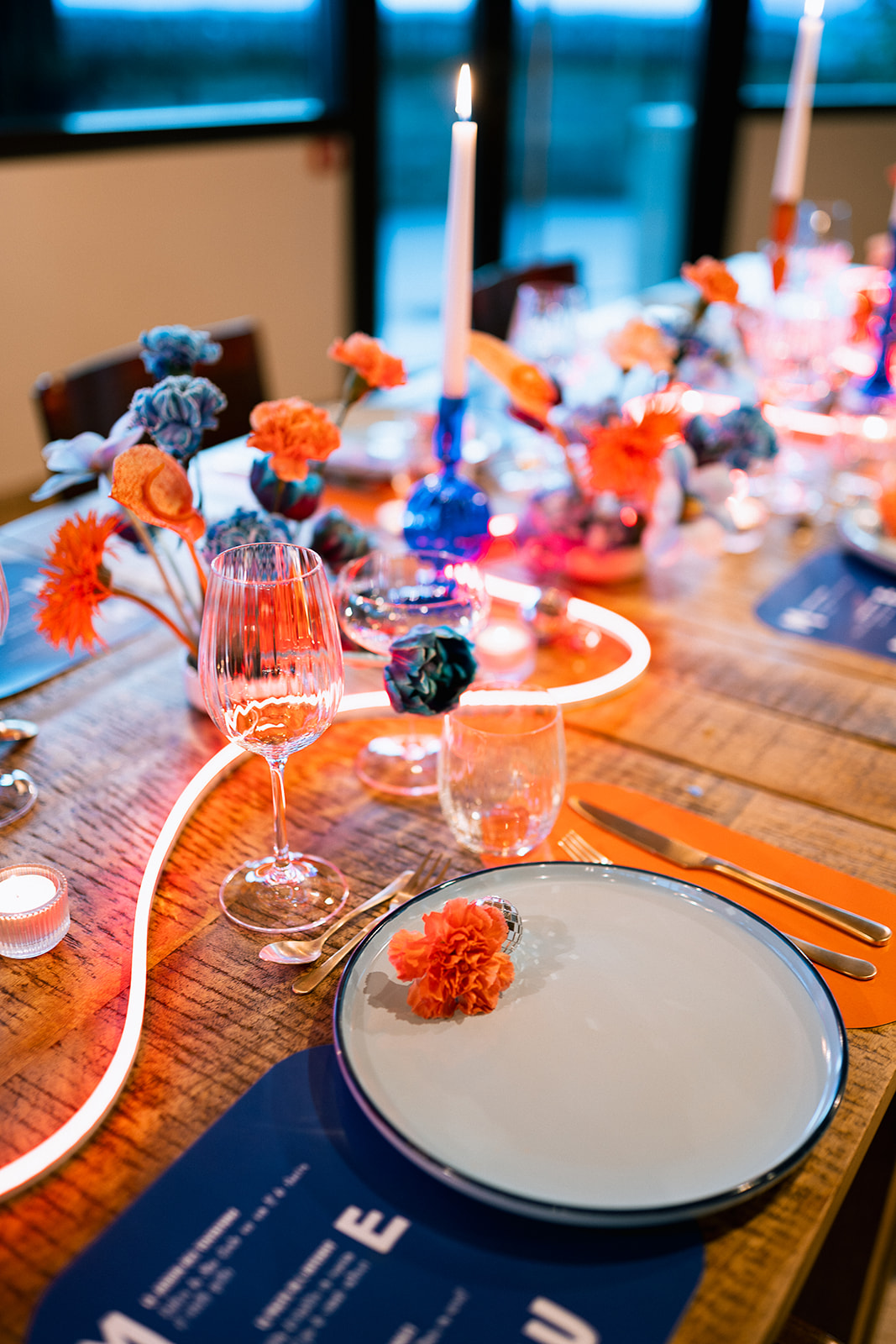 Aussi pour le choix des couleurs de la déco on s’est basé sur les deux teintes qui reviennent le plus parmi certains murs et le mobilier chiné: le bleu et le orange. C’est donc sur cette dualité que Cathy a construit le design du mariage.