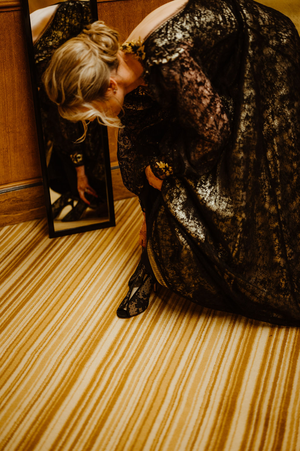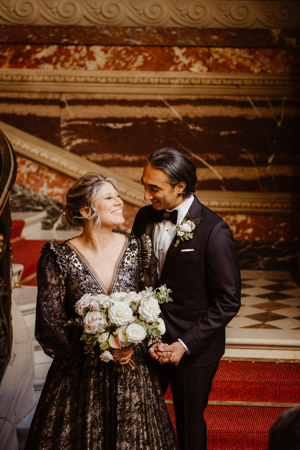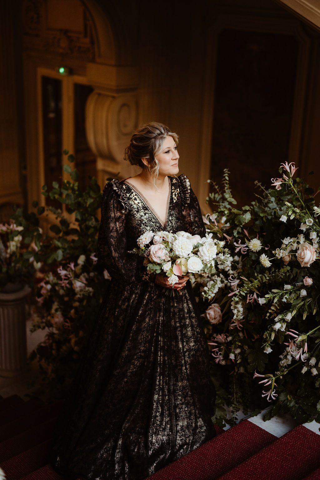 Pour exprimer notre identité et notre singularité, j’ai choisi une robe de mariée noire, une couleur qui, dans certaines traditions indiennes, symbolise la force et la protection. Ce choix était aussi un clin d’œil à mon amour de la mode et à mon désir de briser les conventions.