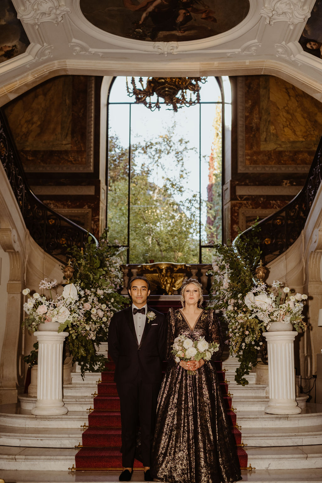 Rahul, quant à lui, portait un smoking classique et élégant, incarnant parfaitement le raffinement et la simplicité à la française. Nous souhaitions que nos tenues reflètent la fusion de nos cultures et de nos personnalités.