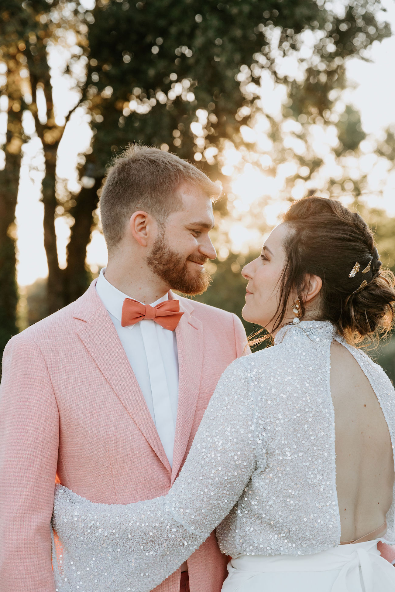 Le second, la séance photo de couple. Nous avions fait le choix de changer de tenue et de coiffure entre le cocktail et le dîner. Une fois les nouvelles tenues enfilées et mise en beauté effectuées, nous nous sommes retrouvés sous les objectifs de Margot et Clémentine pour un first look en toute intimité. Loin de l’agitation de la journée, ce moment de découverte était mémorable.