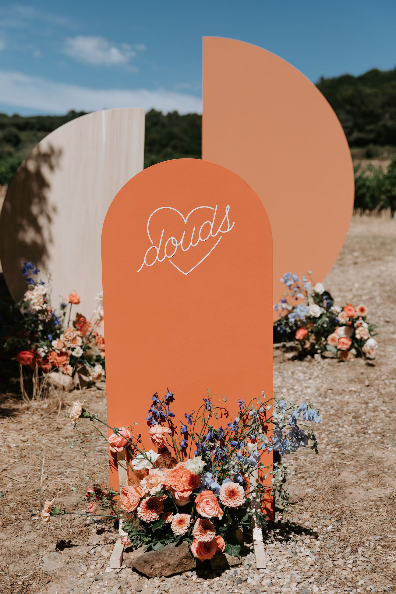 Nous avons ensuite utilisé cette palette que nous avons décliné sur la papeterie ainsi que la signalétique que nous avons réalisé nous-même — ayant un goût et une pratique professionnelle du graphisme. Nous avons néanmoins fait réaliser notre logo personnalisé « Douds » reprenant le surnom donné à notre couple par Jean André, un artiste que nous apprécions tous les deux et par lequel nous avions déjà hésité à nous faire tatouer. Nous avons ainsi conçu nos différents supports de communication nous-mêmes : save the date, faire part pour les cérémonies civile et laïque, livrets de cérémonie, menus, remerciements, enveloppes personnalisées ainsi que les emballages de nos cadeaux invités.
