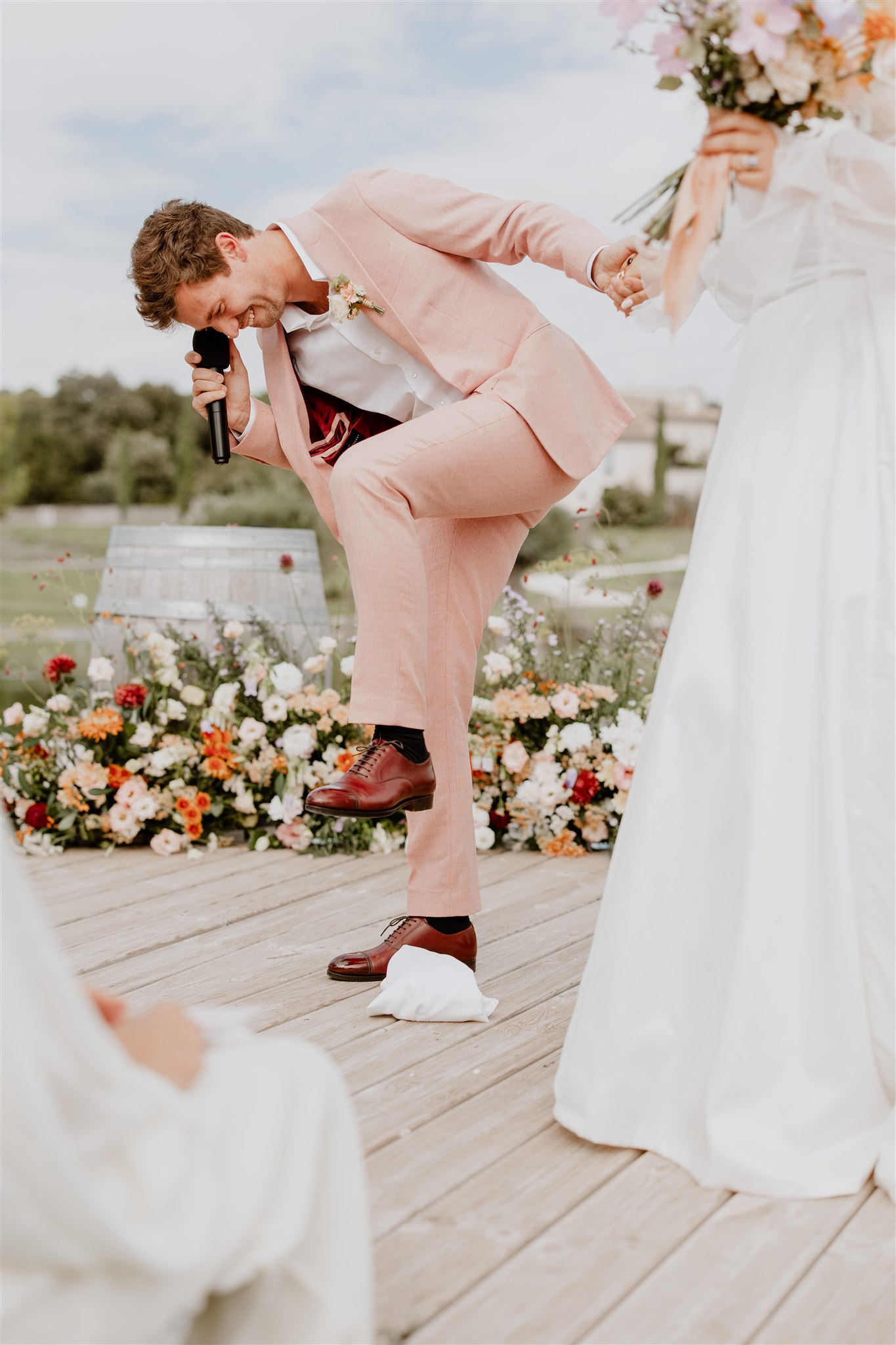 Pour le costume de Julien, le choix a été osé ! Il cherchait un costume un peu plus décontracté et unique, à son image. Après avoir regardé le lin pour aller avec le lieu, le tissu rose proposé par Blandin&Delloye l’a conquis, et il a bien eu raison il était superbe. Pas de cravate, pas de noeud pap’, mais un col de chemise inversé, très stylé.