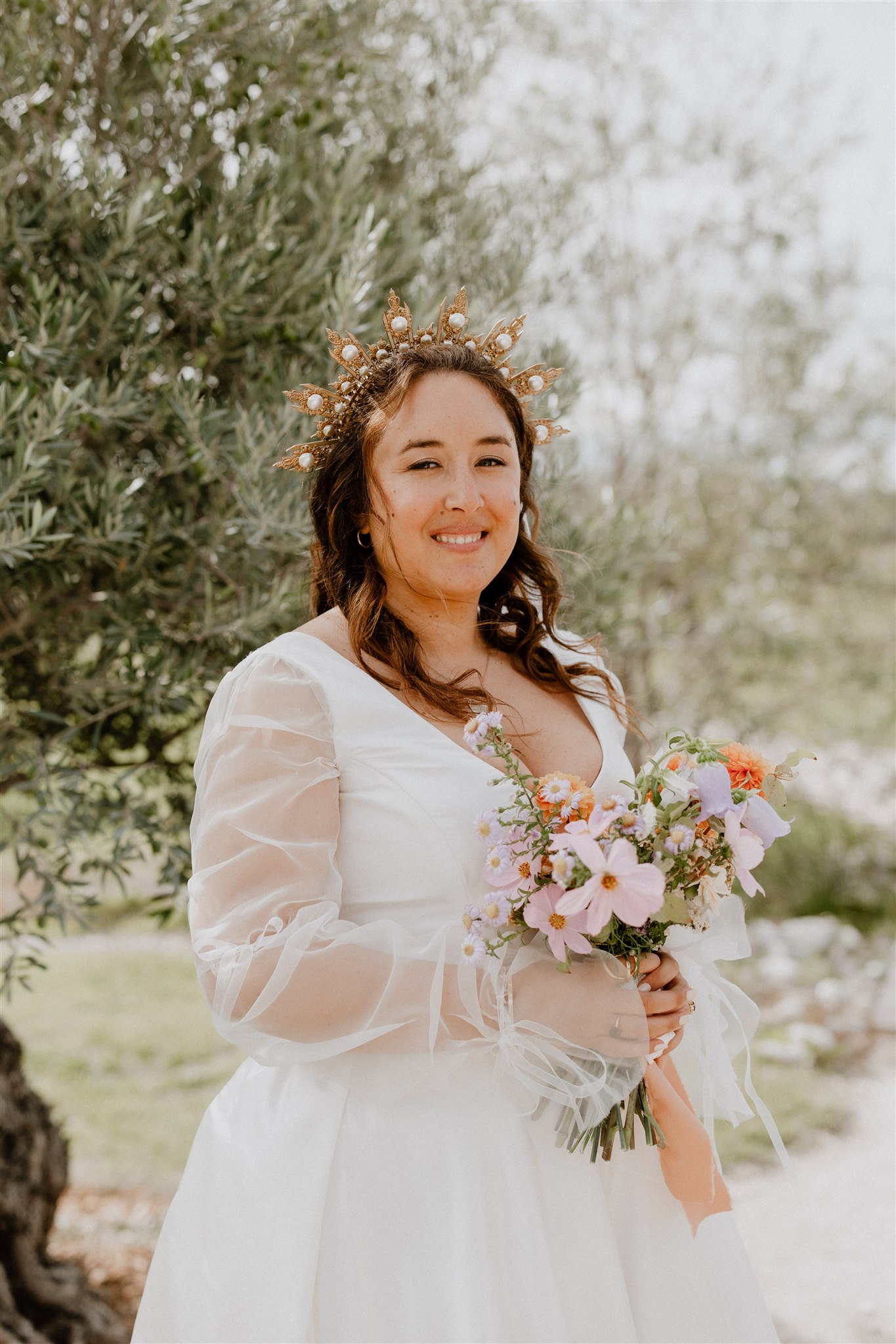 La tante de Raphaelle faisant des robes de mariée, ça a été assez facile. Après beaucoup d’essayages dans des boutiques classiques, Raphaelle avait une idée assez claire de ce qu’elle voulait. Une robe de princesse, avec une longue traîne, c’est pas souvent qu’on peut se le permettre. Comme le lieu et l’ambiance du mariage était plutôt naturel et décontracté, Raphaelle voulait rester simple sur le tissu vu que la robe était imposante en elle-même. Les manches en organza avec des liens à nouer pour ajouter un peu de modernité et de légèreté… et une couronne !