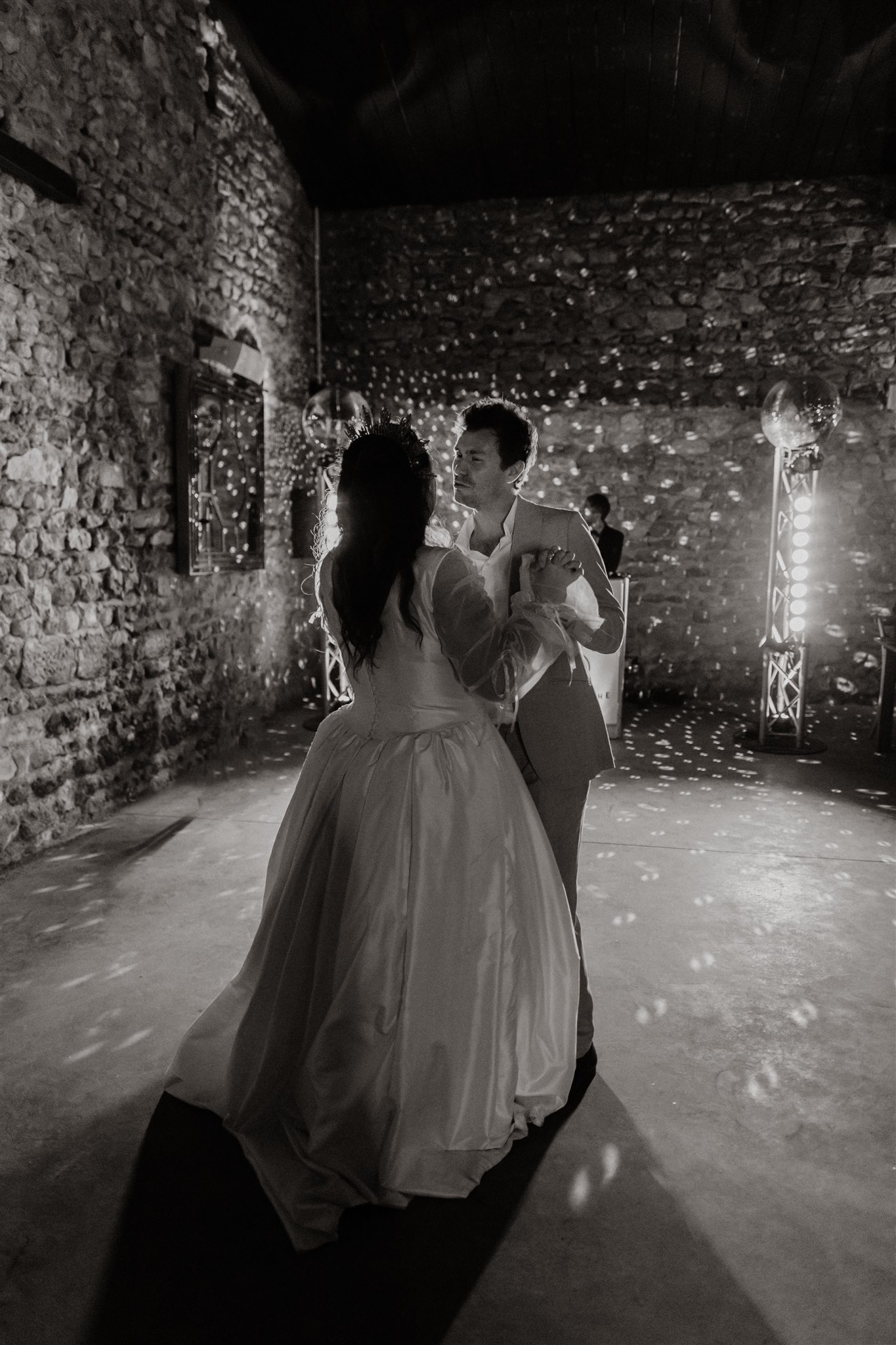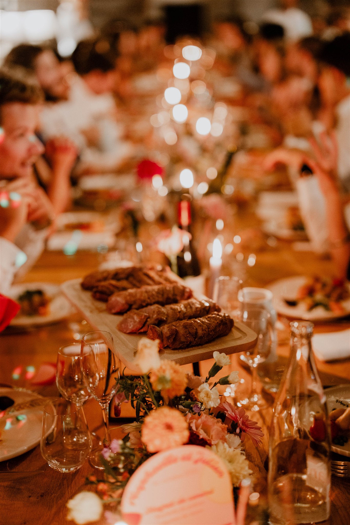 Puis on a bien mangé entre un encas au bord du lac, puis le cocktail dans la cour intérieure avec le DJ et son bar à vinyles, et enfin on s’est mis à table assez tôt pour pouvoir arriver plus vite sur la piste de danse, jusqu’au bout de la nuit. On a aussi pris un mixologue qui nous a fait des cocktails personnalisés quand on a ouvert la piste de danse : un pour Julien, un pour Raphaelle, et un non-alcoolisé pour leur chat Berlioz : les invités ont adoré !