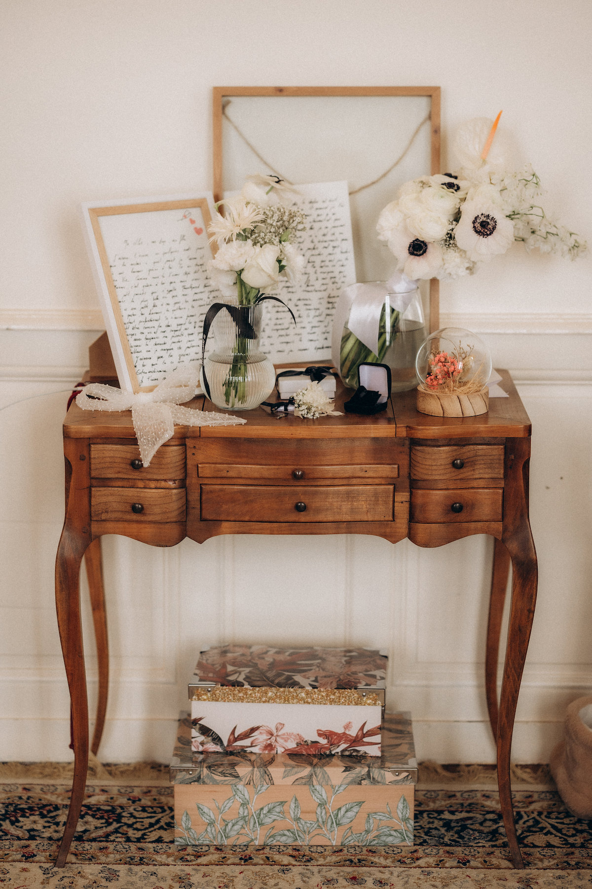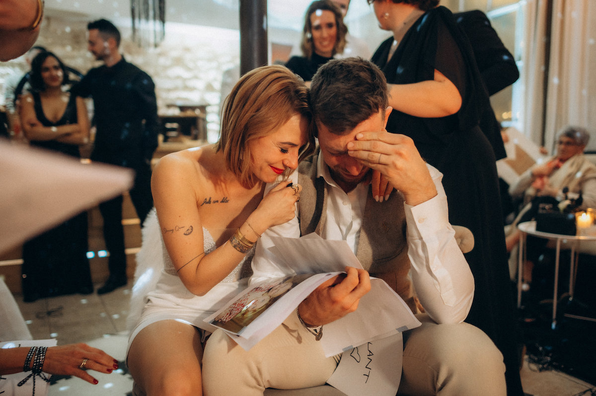 Notre fille, Lilas, a reçu une lettre de son papa pendant mes préparatifs dans la suite nuptiale. Elle n’a pas réussi à la lire immédiatement, submergée par l’émotion et s’est mise à pleurer. Elle savait que cette lettre était un témoignage d’amour. Après quelques minutes, elle s’est installée sur le canapé, avec entre ces petites mains, ce grand papier. C’était un moment puissant car je sais à quel point les mots la touche. Cet instant restera gravé dans ma mémoire pour toujours.
