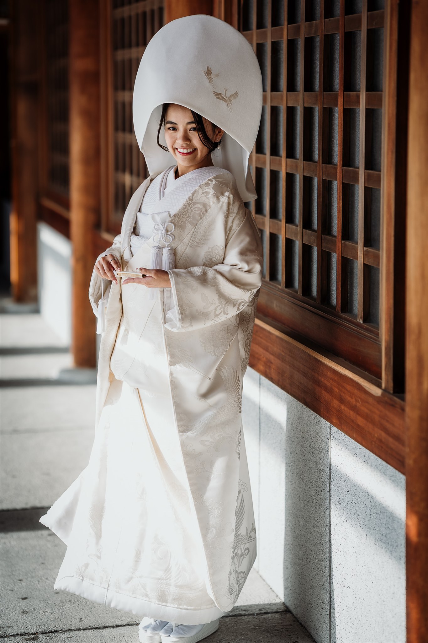 Qui dit mariage japonais dit kimono ! Le shiromuku (le kimono blanc de la mariée) était incontournable pour Yuka, avec des accents dorés dans les accessoires. Pour Julien, nous avons choisi un montsukihakama (le kimono du marié) en évitant le bleu marine traditionnel et en misant sur des couleurs vives, blanc et or..