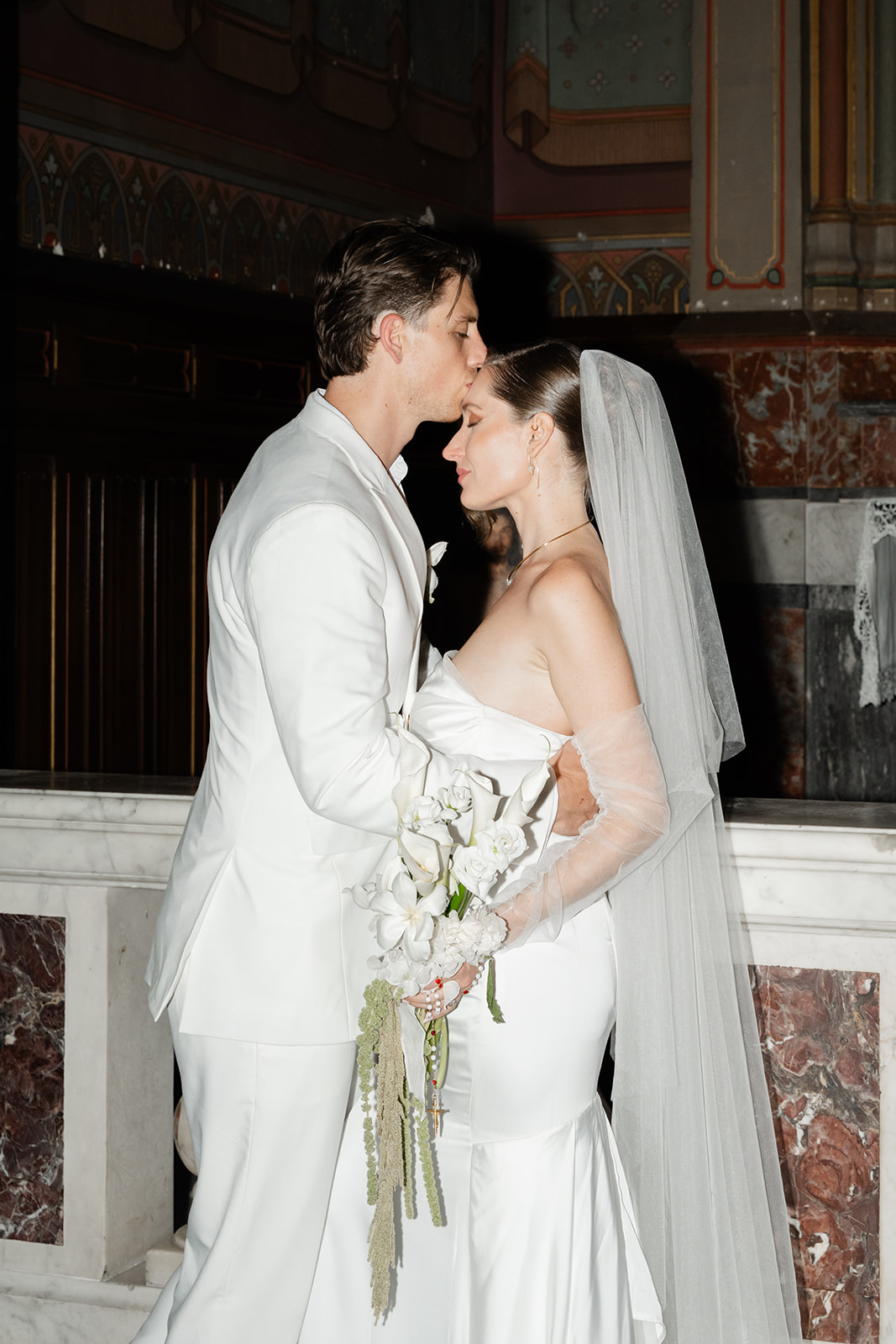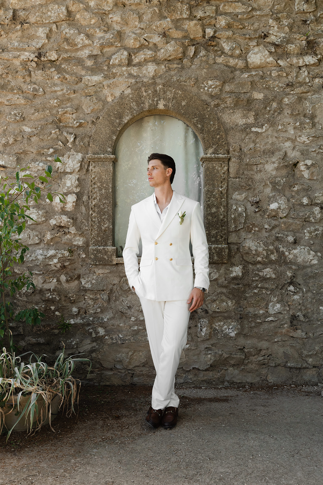 Pour la cérémonie religieuse, Paco portait un costume croisé blanc, moderne et raffiné, sublimé par des boutons dorés.