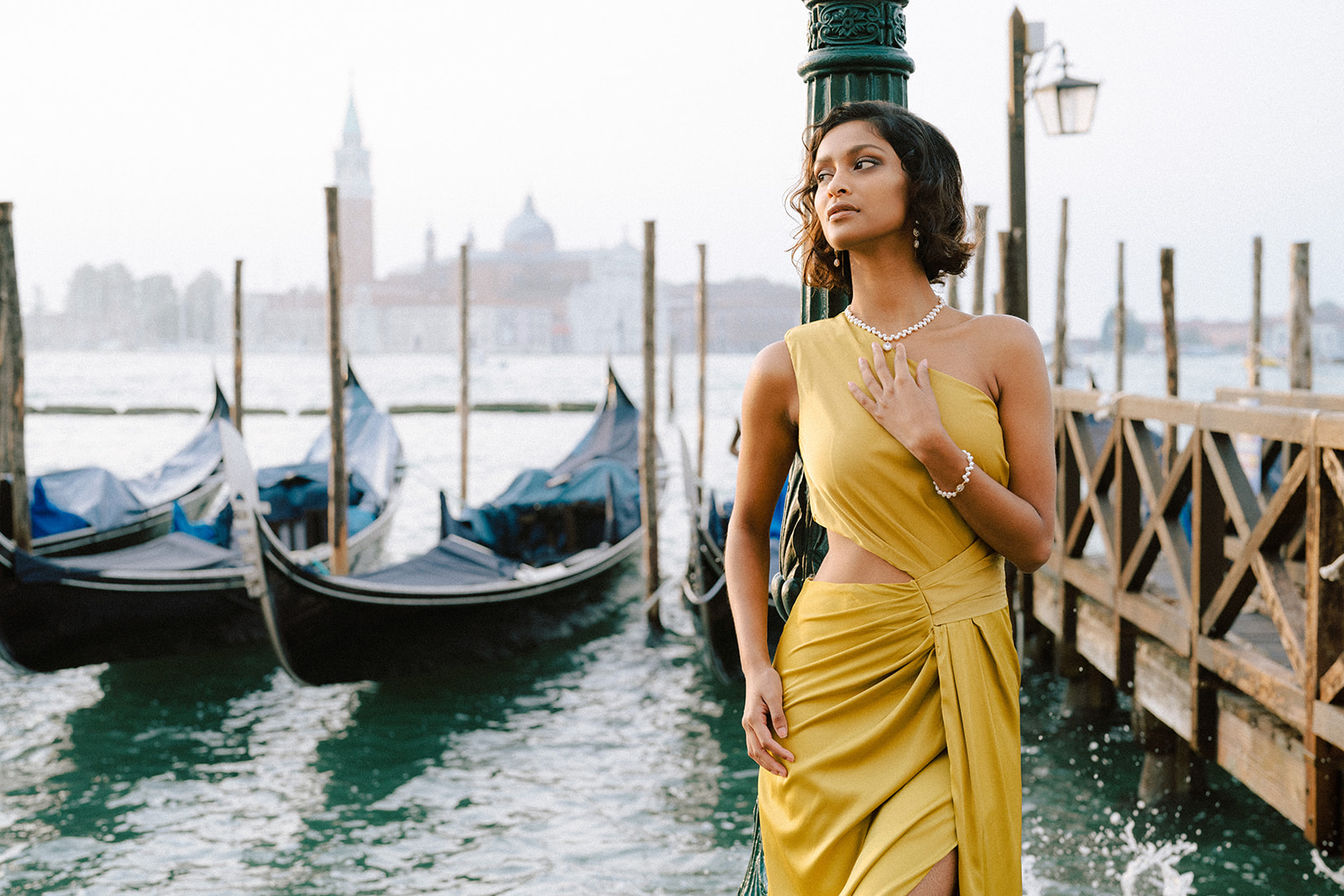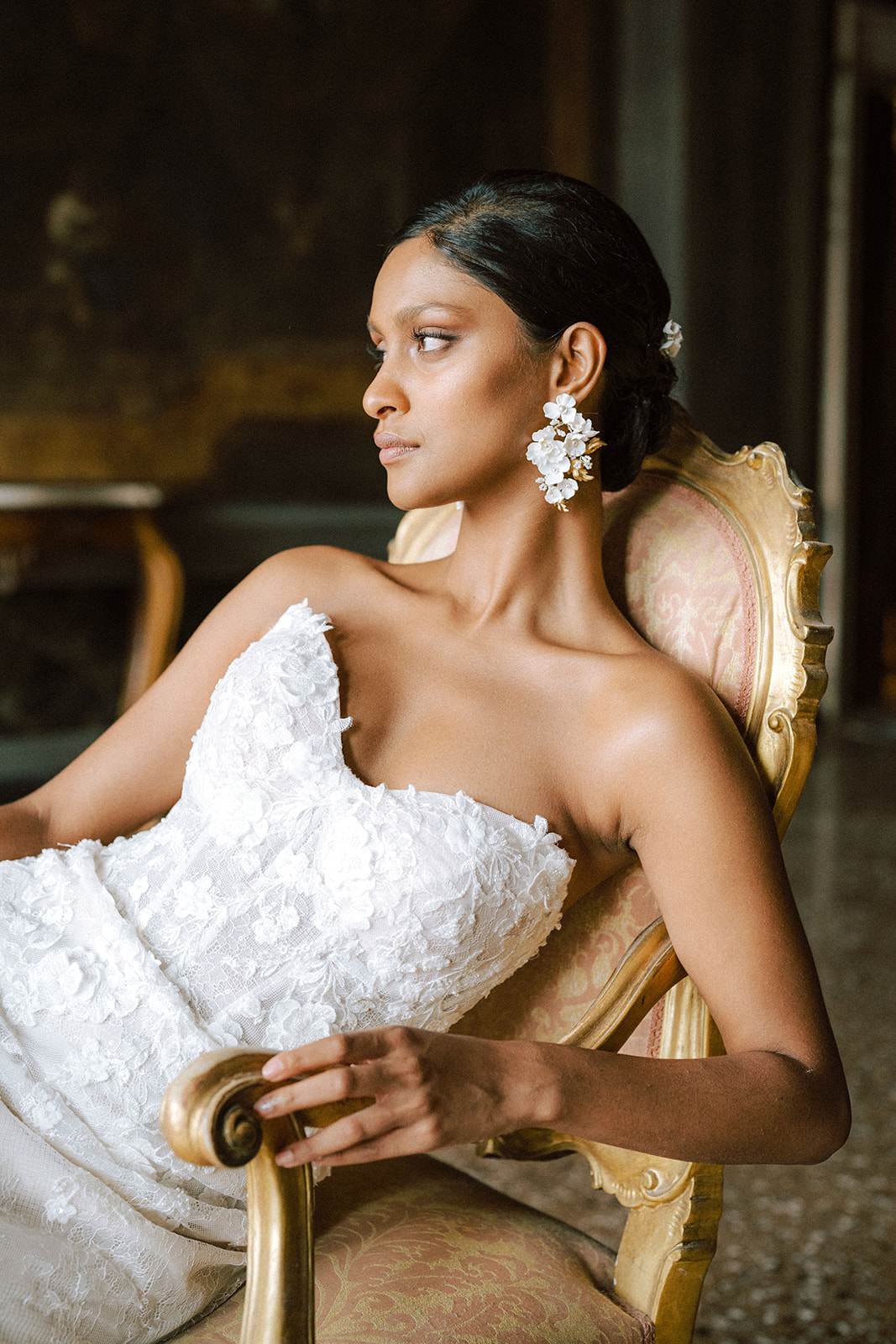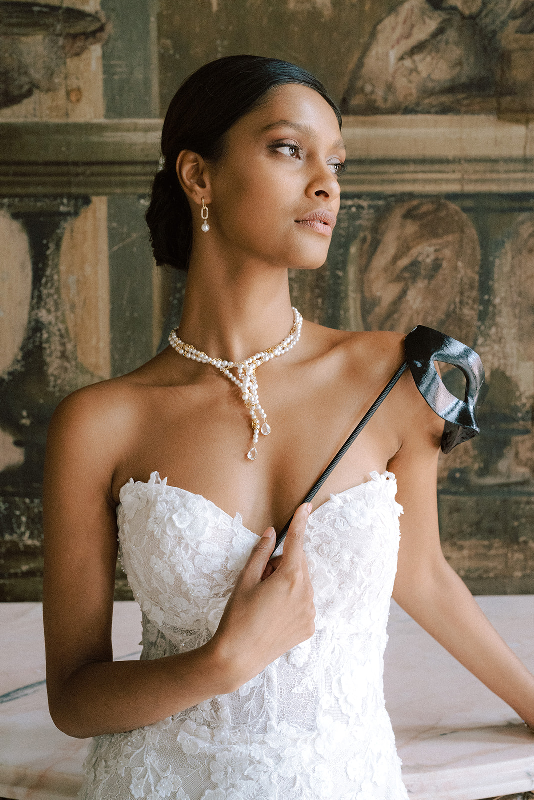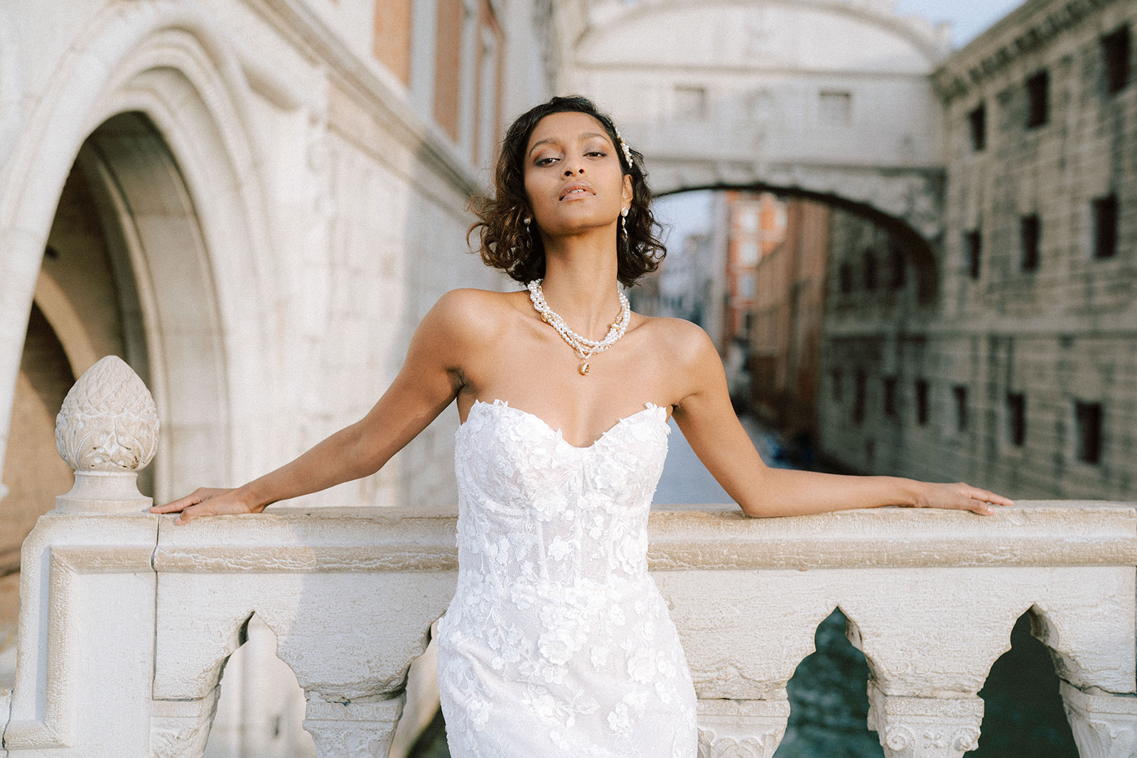 Pour traduire cette vision, je souhaitais une mise en scène à la fois romantique et théâtrale. Chaque détail a été pensé pour faire écho à l’élégance vénitienne : des bijoux délicats et lumineux pour le jour, des accessoires plus audacieux et scintillants pour la nuit.