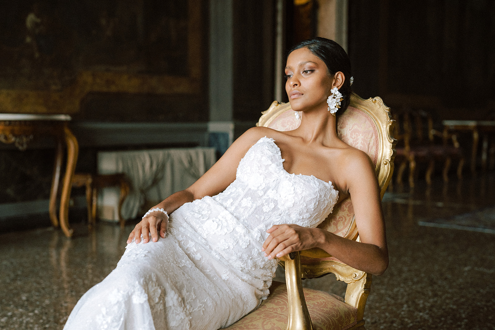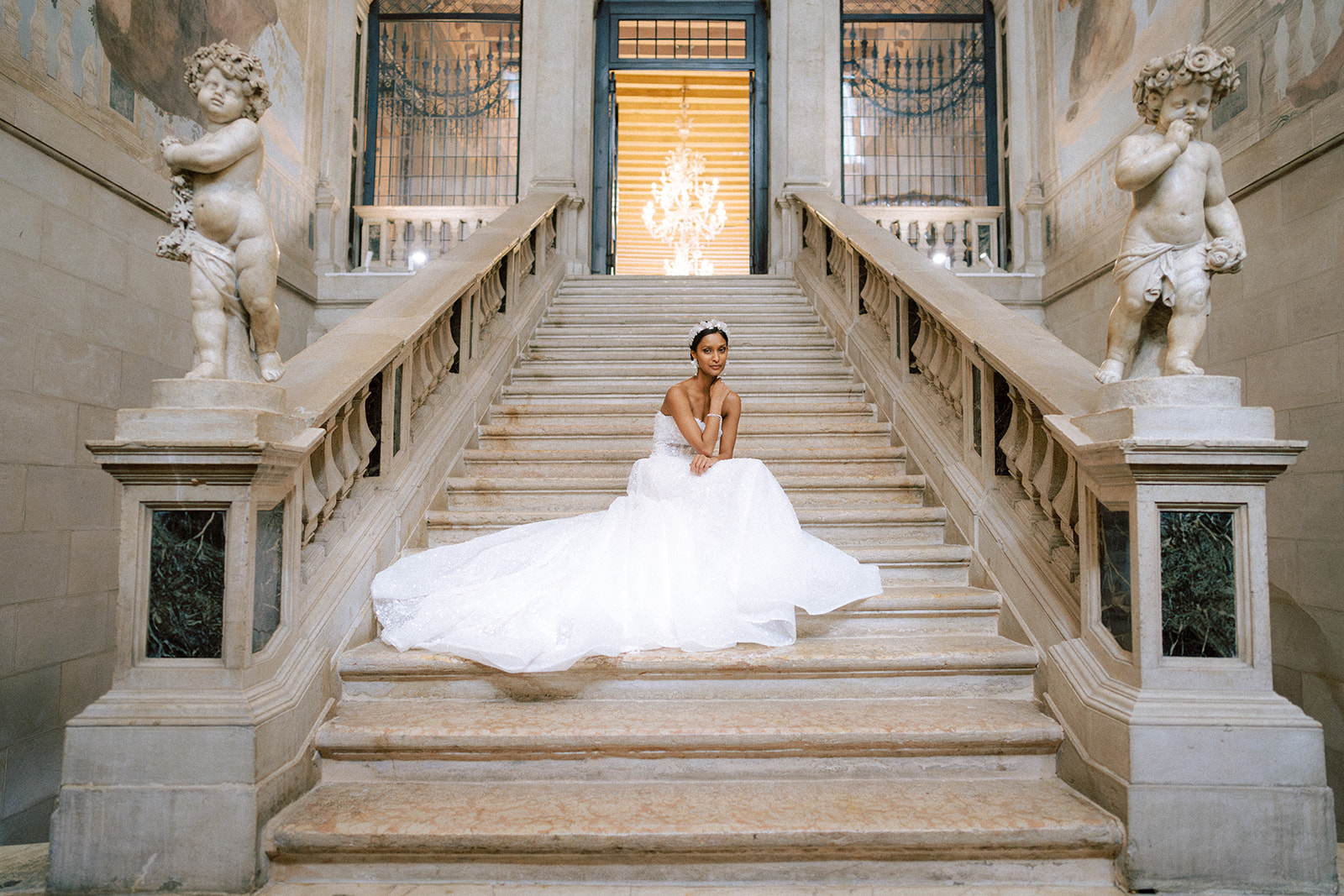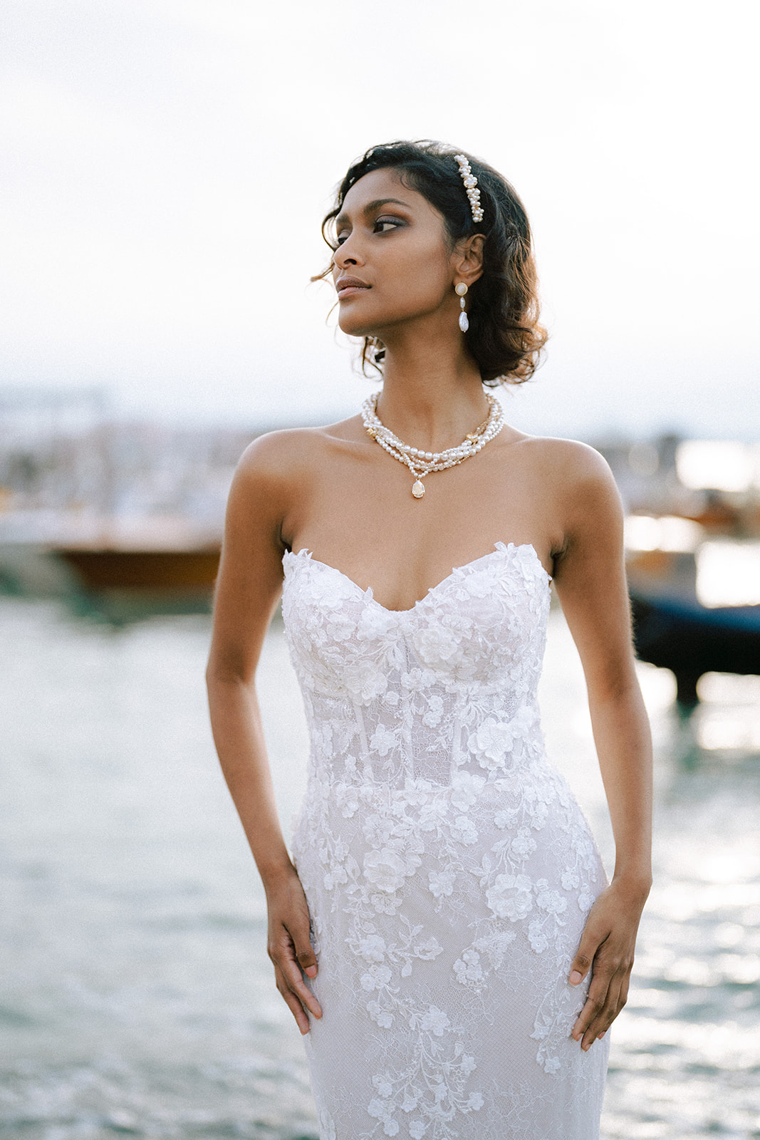 Pour traduire cette vision, je souhaitais une mise en scène à la fois romantique et théâtrale. Chaque détail a été pensé pour faire écho à l’élégance vénitienne : des bijoux délicats et lumineux pour le jour, des accessoires plus audacieux et scintillants pour la nuit.