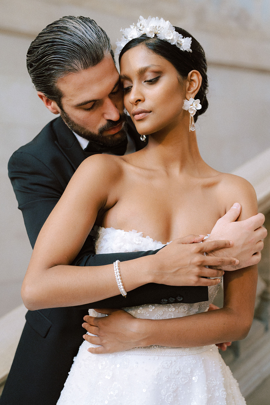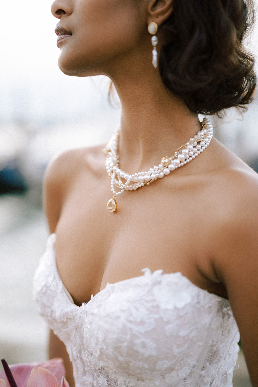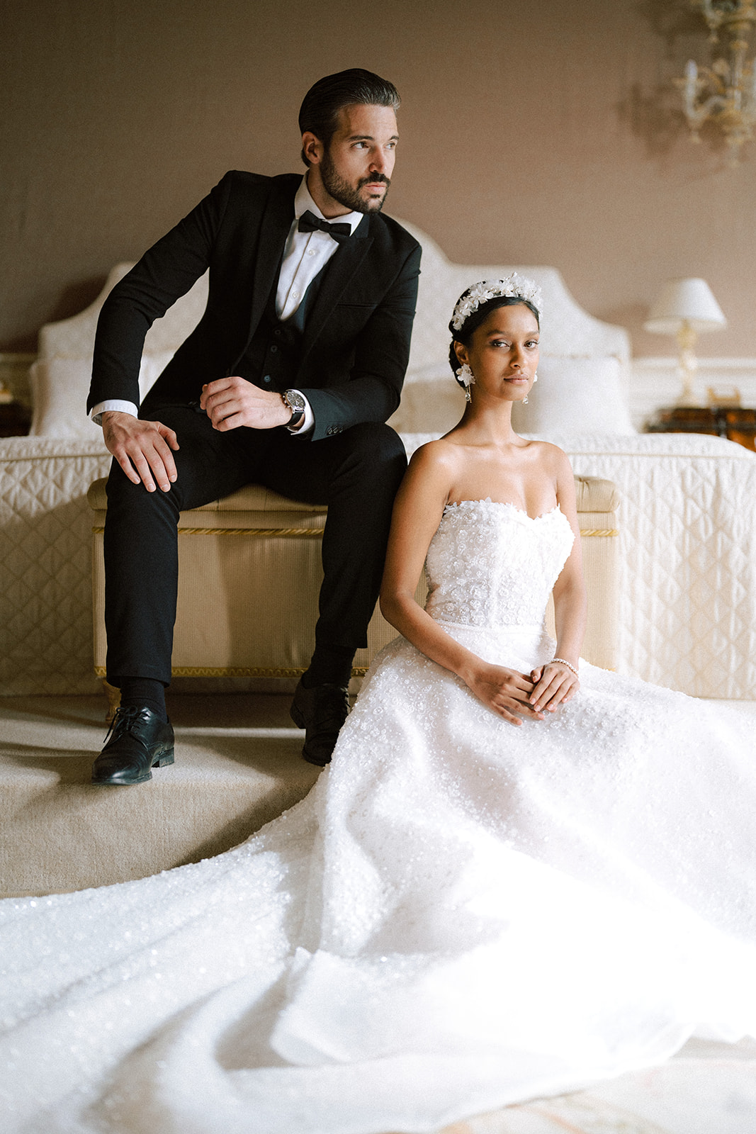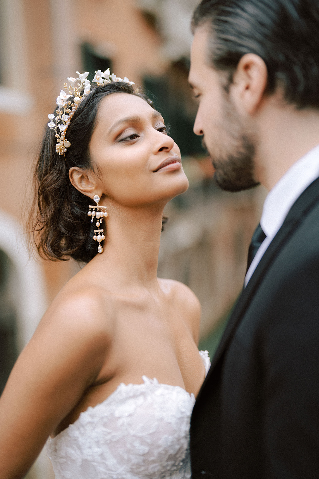Pour traduire cette vision, je souhaitais une mise en scène à la fois romantique et théâtrale. Chaque détail a été pensé pour faire écho à l’élégance vénitienne : des bijoux délicats et lumineux pour le jour, des accessoires plus audacieux et scintillants pour la nuit.