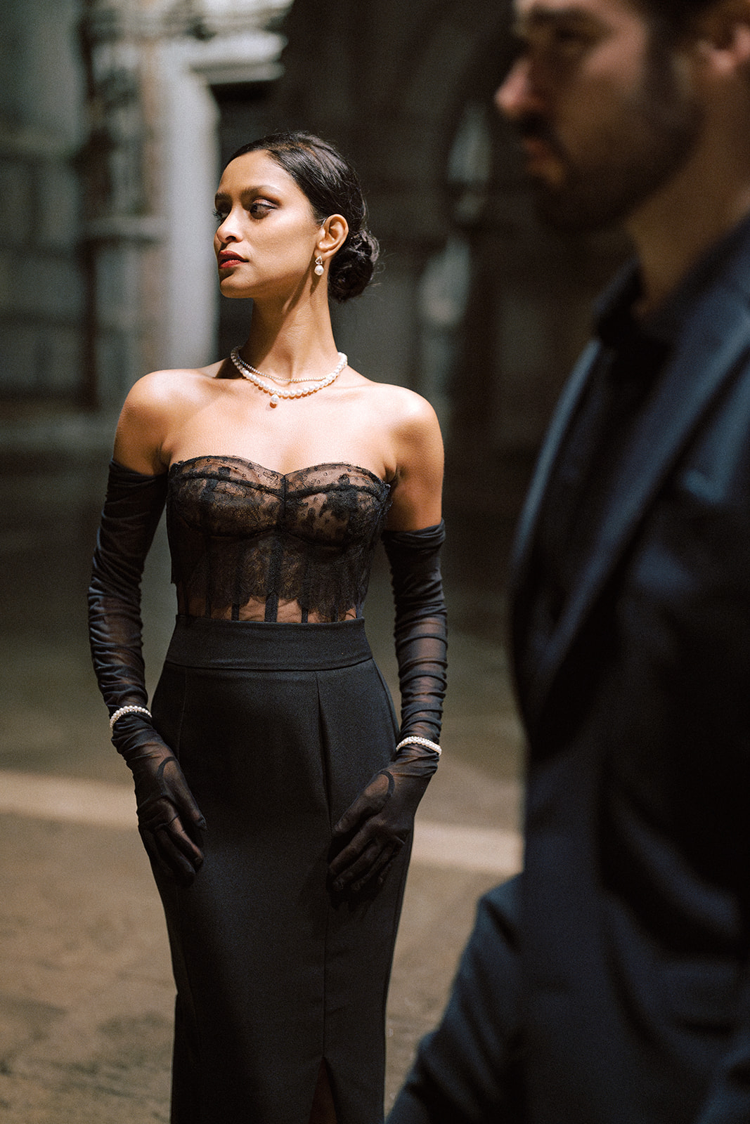 Les robes ont été soigneusement choisies pour accompagner cette narration visuelle : des créations élégantes et sensuelles de la boutique Mary Mariées pour les promenades diurnes, et une robe spectaculaire et envoutante signée Atelier Julien Mathys pour les prises de vue nocturnes. L’univers floral a également joué un rôle essentiel, avec des bouquets raffinés imaginés par Véronique Lorre, qui ont apporté une touche poétique et sensuelle à l’ensemble.