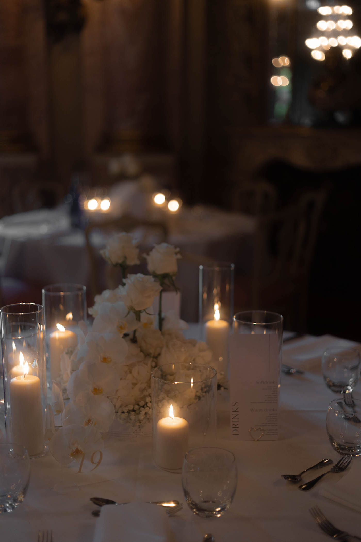 Comme notre lieu était le point fort du mariage, nous voulions que la décoration soit plutôt simple. Nous avons donc décidé de décorer dans des tons crème et blanc. Nos fleurs étaient un mélange d’orchidées blanches et crème et de nombreuses bougies étaient particulièrement importantes pour nous afin de créer une atmosphère chaleureuse et romantique.