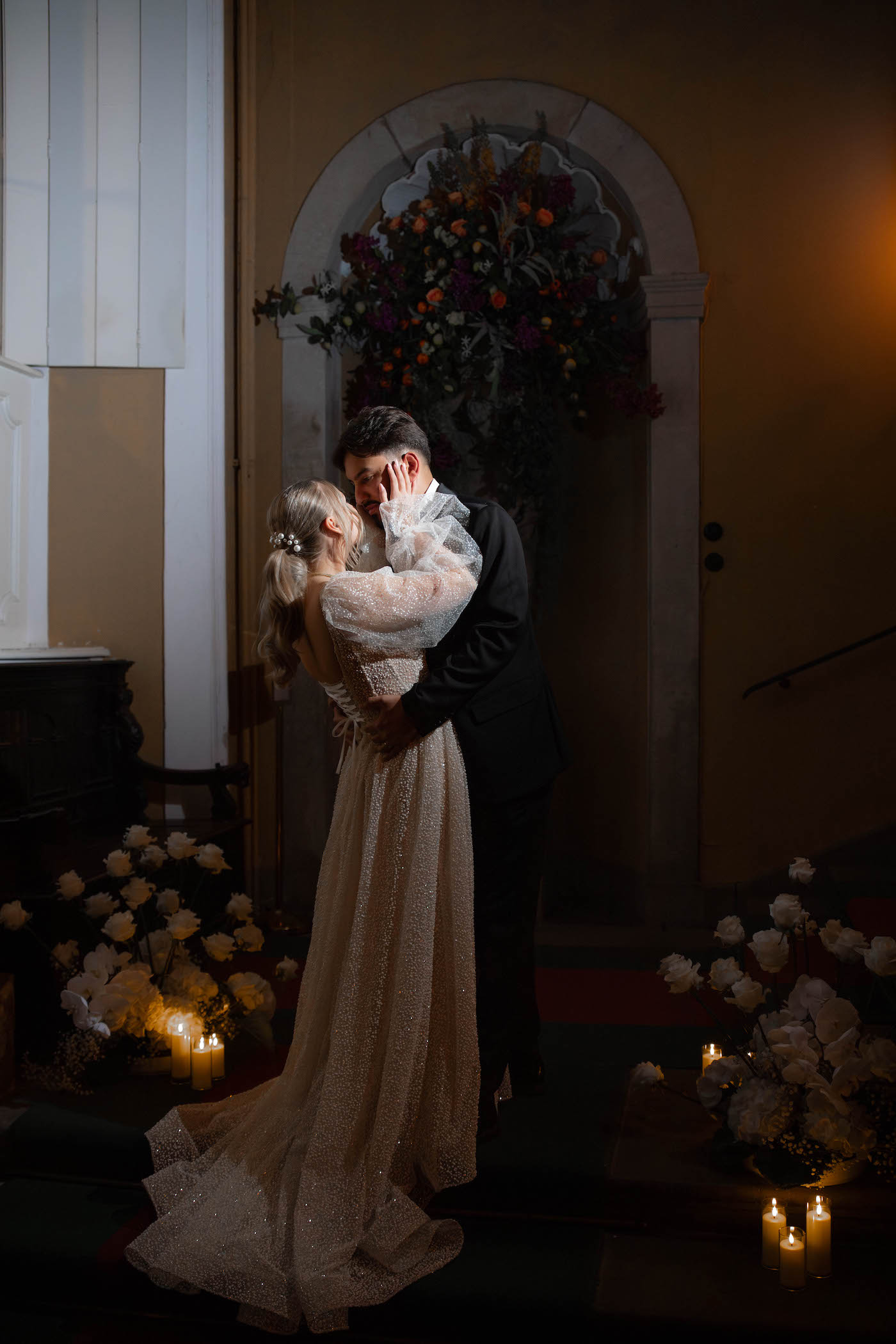 Classe, mais unique. La robe de mariée de Jowita Palais Blanc, connue pour une célèbre émission de télévision allemande, scintillait sur chaque centimètre et seul le sourire de Linda pouvait éclipser cette étincelle. Avec le mélange de flash direct, d’éclairage ambiant aux bougies et de lustres offrant une lumière magique, cette robe était le choix parfait pour cette atmosphère de château.