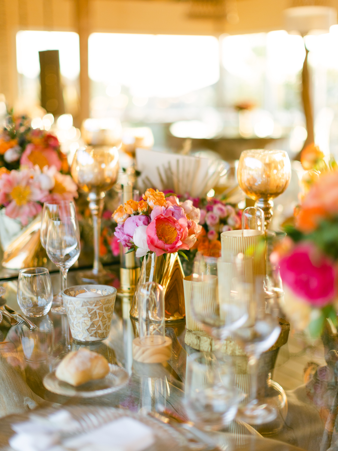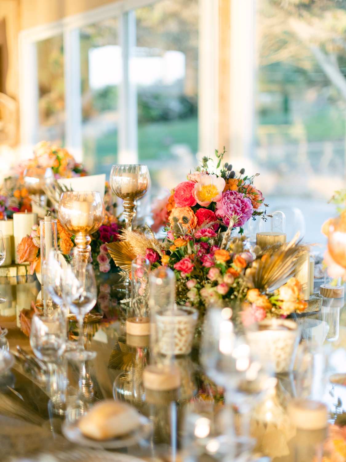 Pour la soirée, nous souhaitions une décoration florale plus festive et colorée. Je me suis inspirée des défilés Dior avec ses couleurs orangées, roses, dorées auxquelles ont été ajoutées bon nombre de bougies qui donnaient l’illusion d’un un feu d’artifice floral.