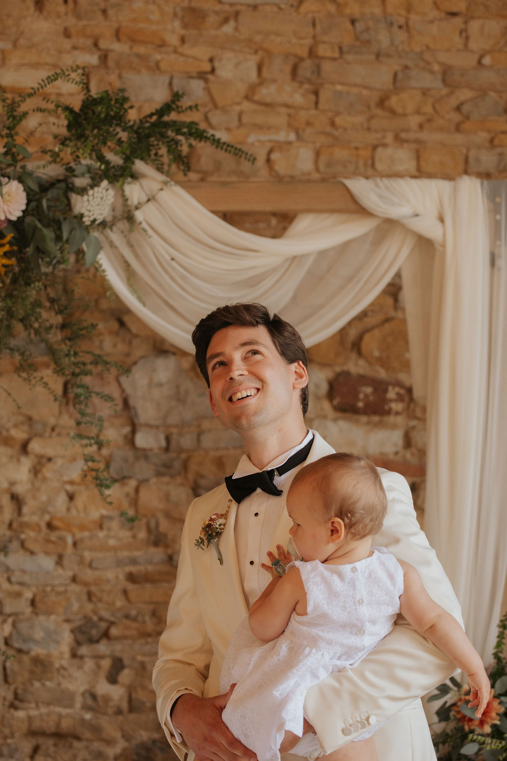 Philippe a choisi un costume de chez Fursac, avec la veste crème. C’était un choix audacieux pour lui mais nous n’avons aucun regret.