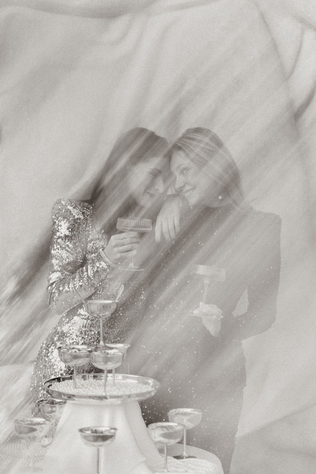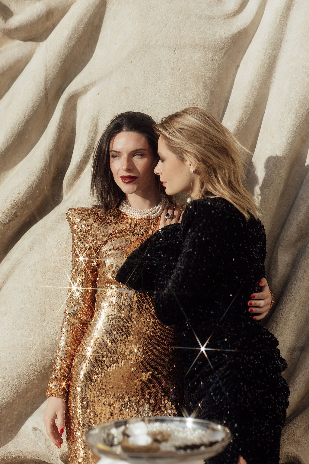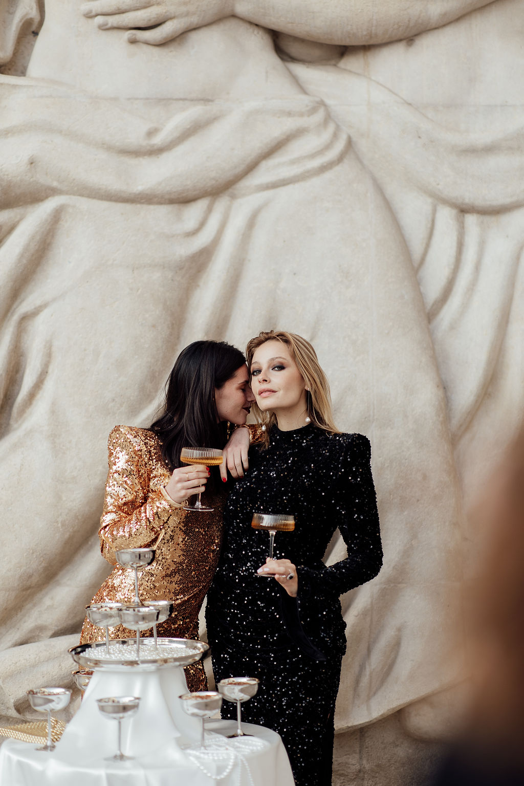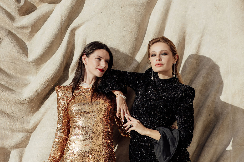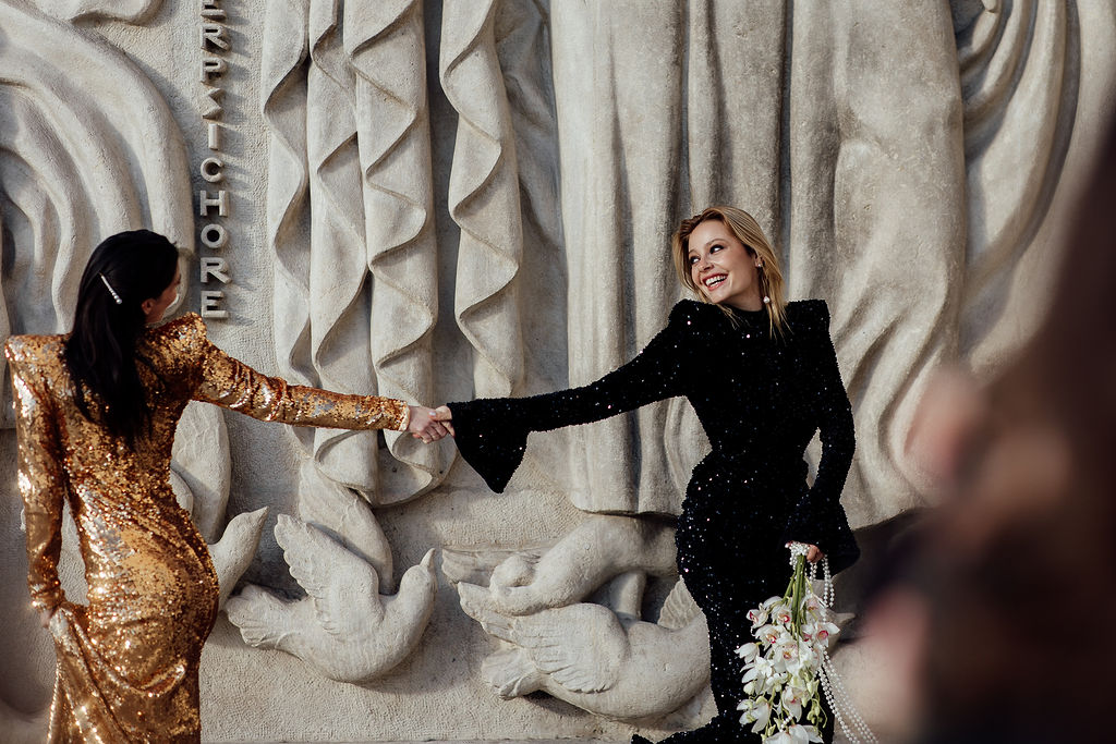 Tout est parti d’un mot : briller. Nous voulions créer une ambiance où l’éclat n’était pas seulement esthétique, mais aussi émotionnel. L’idée d’un mariage qui ose, qui célèbre la joie, la liberté et l’audace a guidé toute la direction artistique. Nous avons mêlé textures dorées, matières lumineuses, jeux de reflets et touches de paillettes pour évoquer un univers festif, presque électrique. Le Palais de Tokyo, avec son aura artistique, nous a ensuite inspiré une mise en scène qui glisse entre modernité et glamour, entre élégance épurée et exubérance maîtrisée. Le couple de femmes, véritable cœur du shooting, a impulsé la dimension inclusive et vibrante du concept : deux personnalités solaires, complices, dont l’amour nous a naturellement orientés vers une esthétique joyeuse et affirmée.