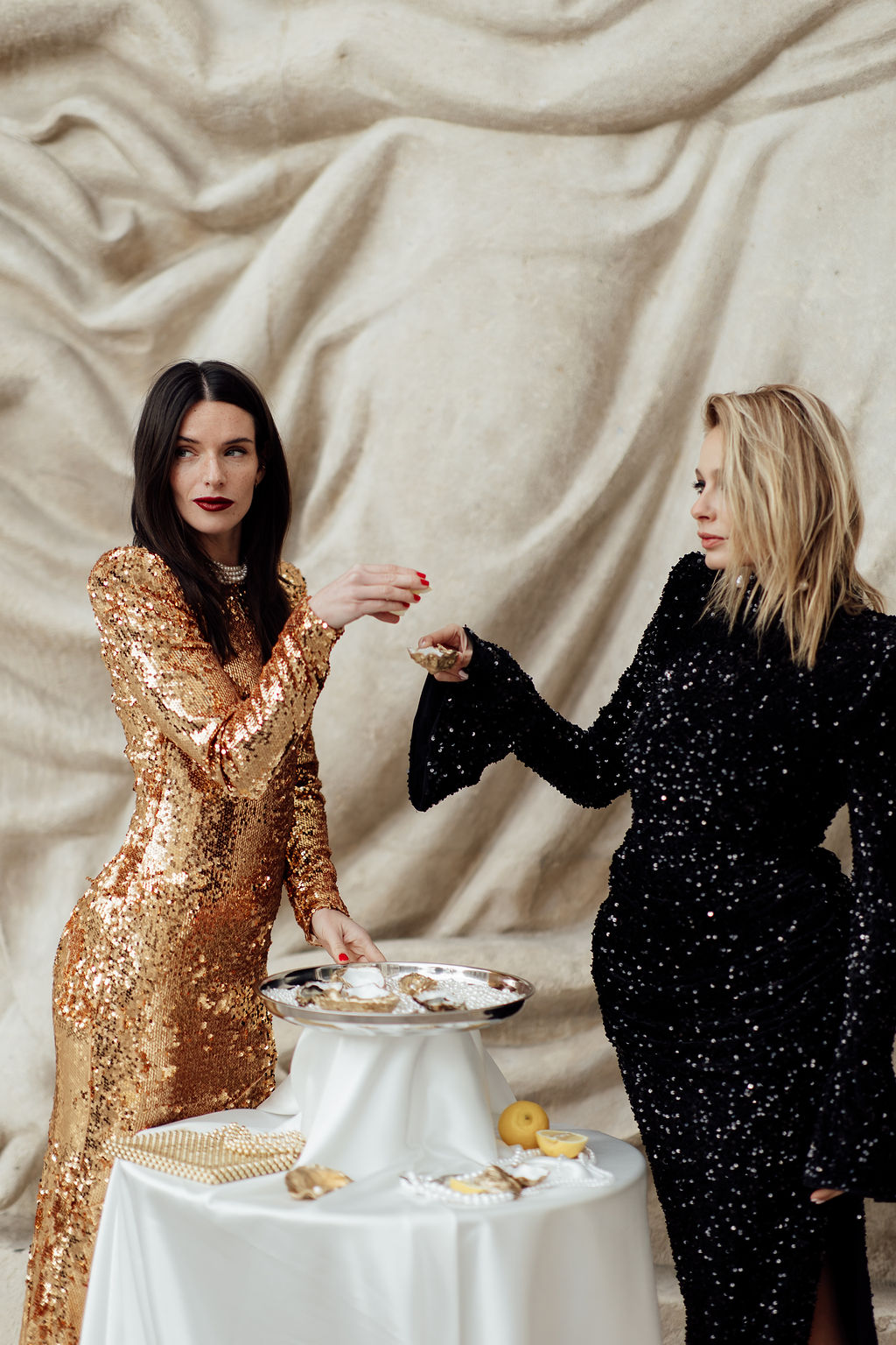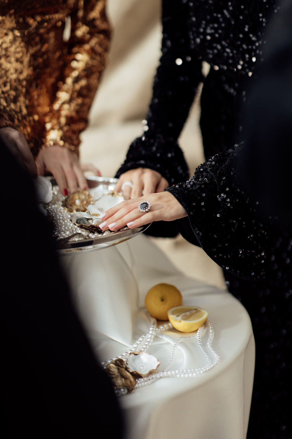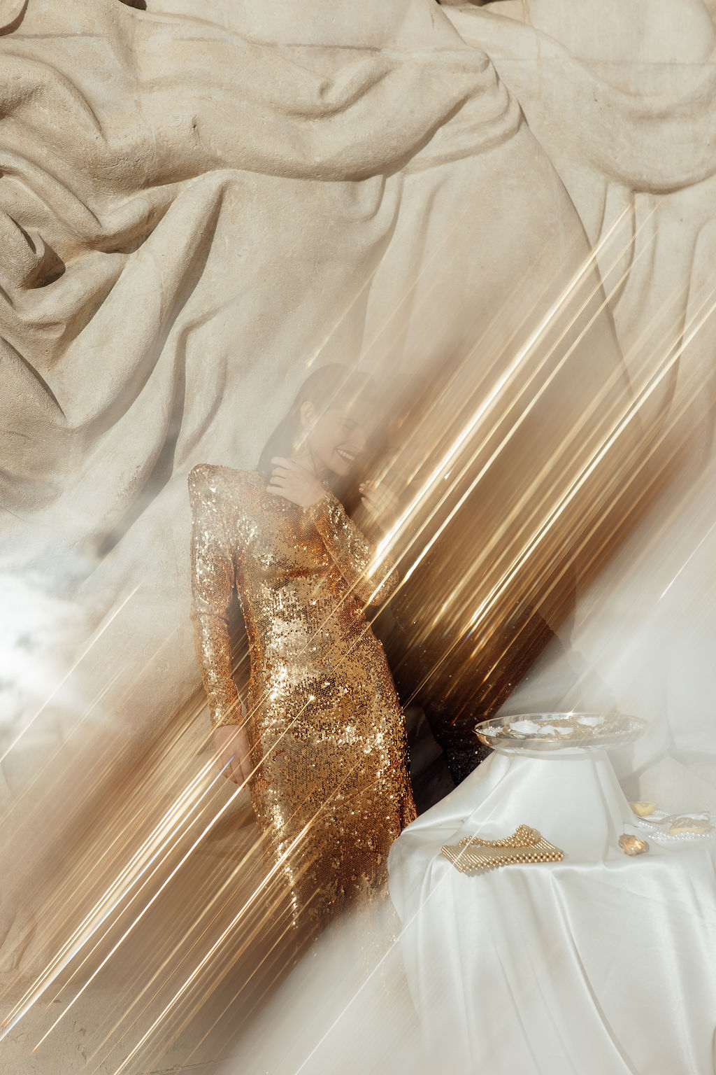 Tout est parti d’un mot : briller. Nous voulions créer une ambiance où l’éclat n’était pas seulement esthétique, mais aussi émotionnel. L’idée d’un mariage qui ose, qui célèbre la joie, la liberté et l’audace a guidé toute la direction artistique. Nous avons mêlé textures dorées, matières lumineuses, jeux de reflets et touches de paillettes pour évoquer un univers festif, presque électrique. Le Palais de Tokyo, avec son aura artistique, nous a ensuite inspiré une mise en scène qui glisse entre modernité et glamour, entre élégance épurée et exubérance maîtrisée. Le couple de femmes, véritable cœur du shooting, a impulsé la dimension inclusive et vibrante du concept : deux personnalités solaires, complices, dont l’amour nous a naturellement orientés vers une esthétique joyeuse et affirmée.