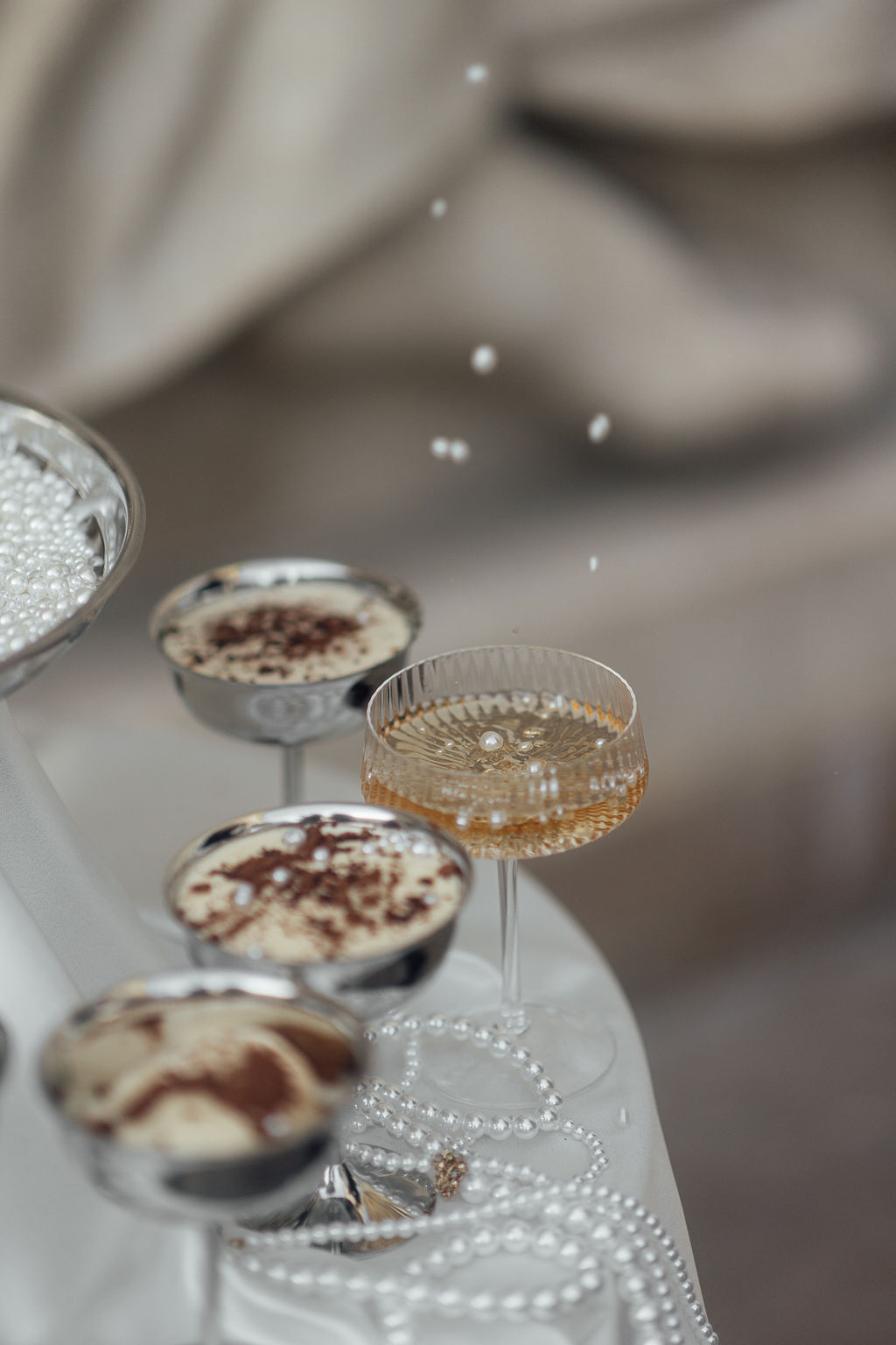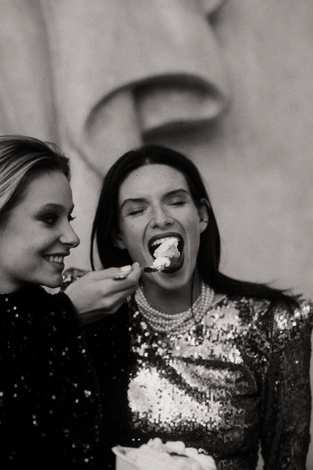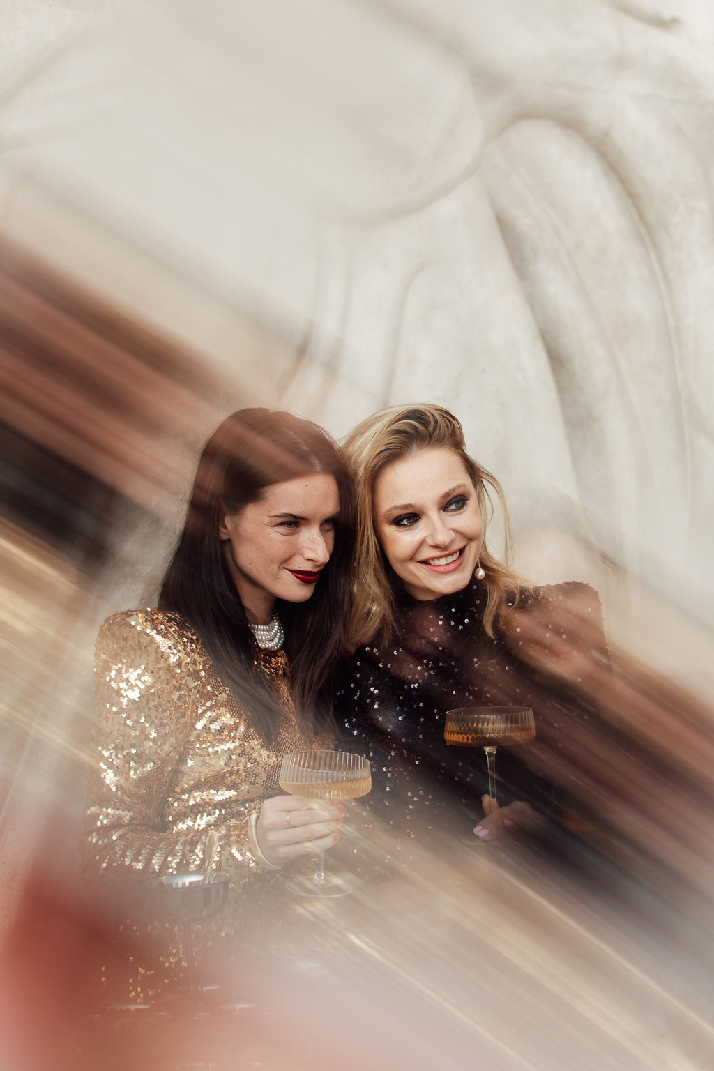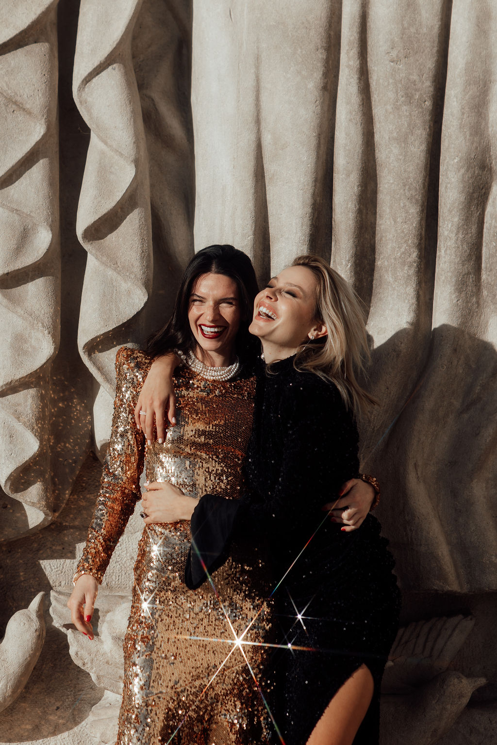 Tout est parti d’un mot : briller. Nous voulions créer une ambiance où l’éclat n’était pas seulement esthétique, mais aussi émotionnel. L’idée d’un mariage qui ose, qui célèbre la joie, la liberté et l’audace a guidé toute la direction artistique. Nous avons mêlé textures dorées, matières lumineuses, jeux de reflets et touches de paillettes pour évoquer un univers festif, presque électrique. Le Palais de Tokyo, avec son aura artistique, nous a ensuite inspiré une mise en scène qui glisse entre modernité et glamour, entre élégance épurée et exubérance maîtrisée. Le couple de femmes, véritable cœur du shooting, a impulsé la dimension inclusive et vibrante du concept : deux personnalités solaires, complices, dont l’amour nous a naturellement orientés vers une esthétique joyeuse et affirmée.