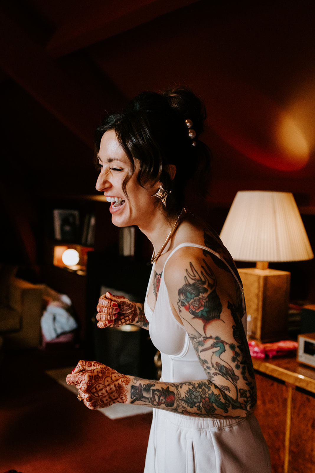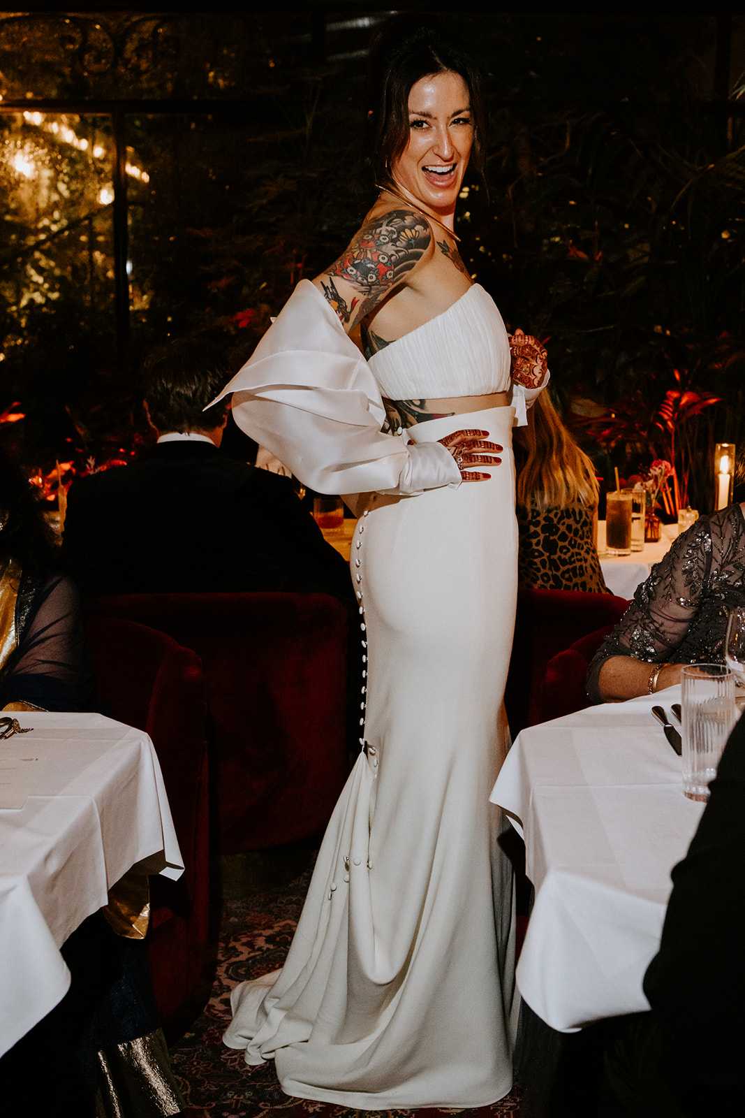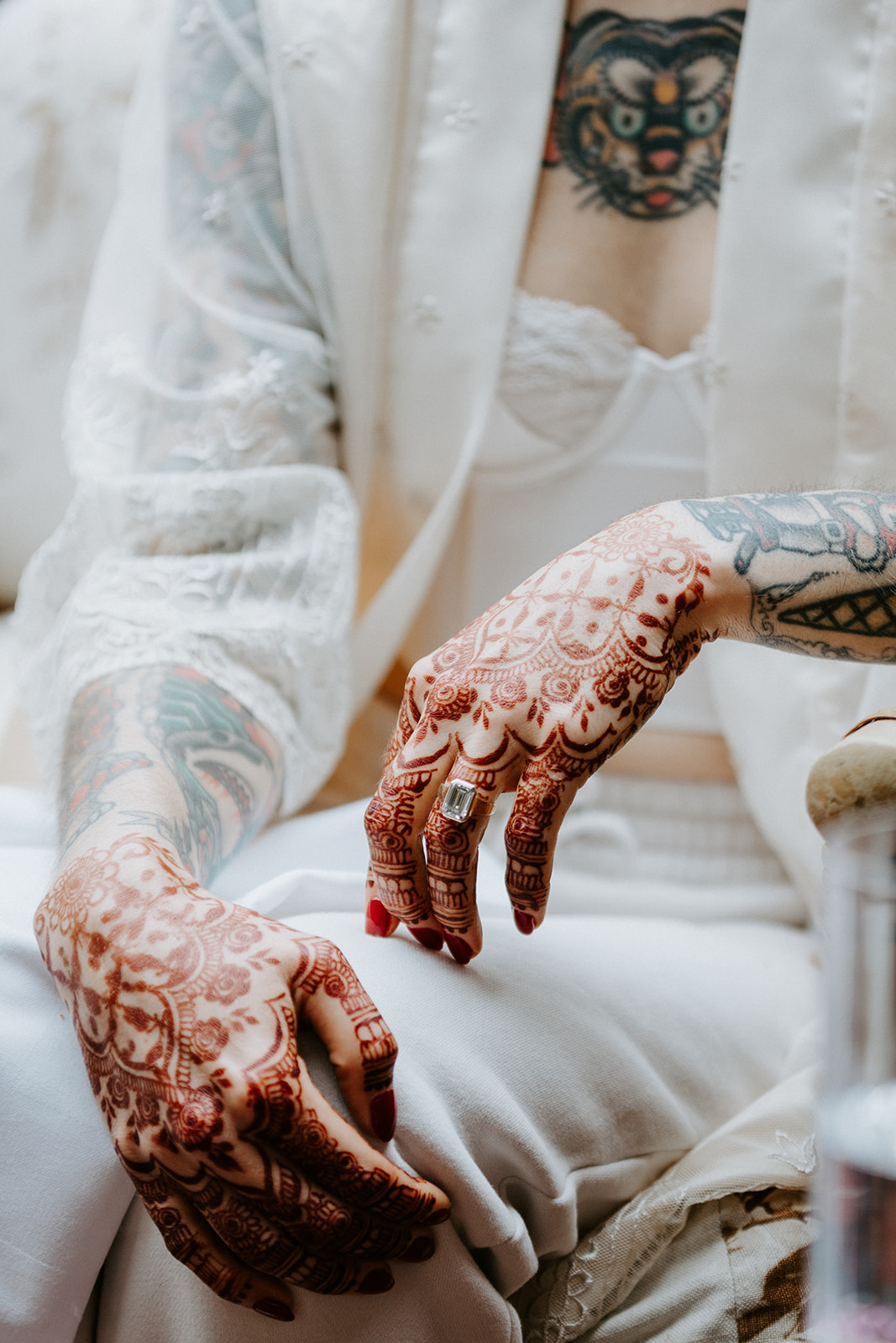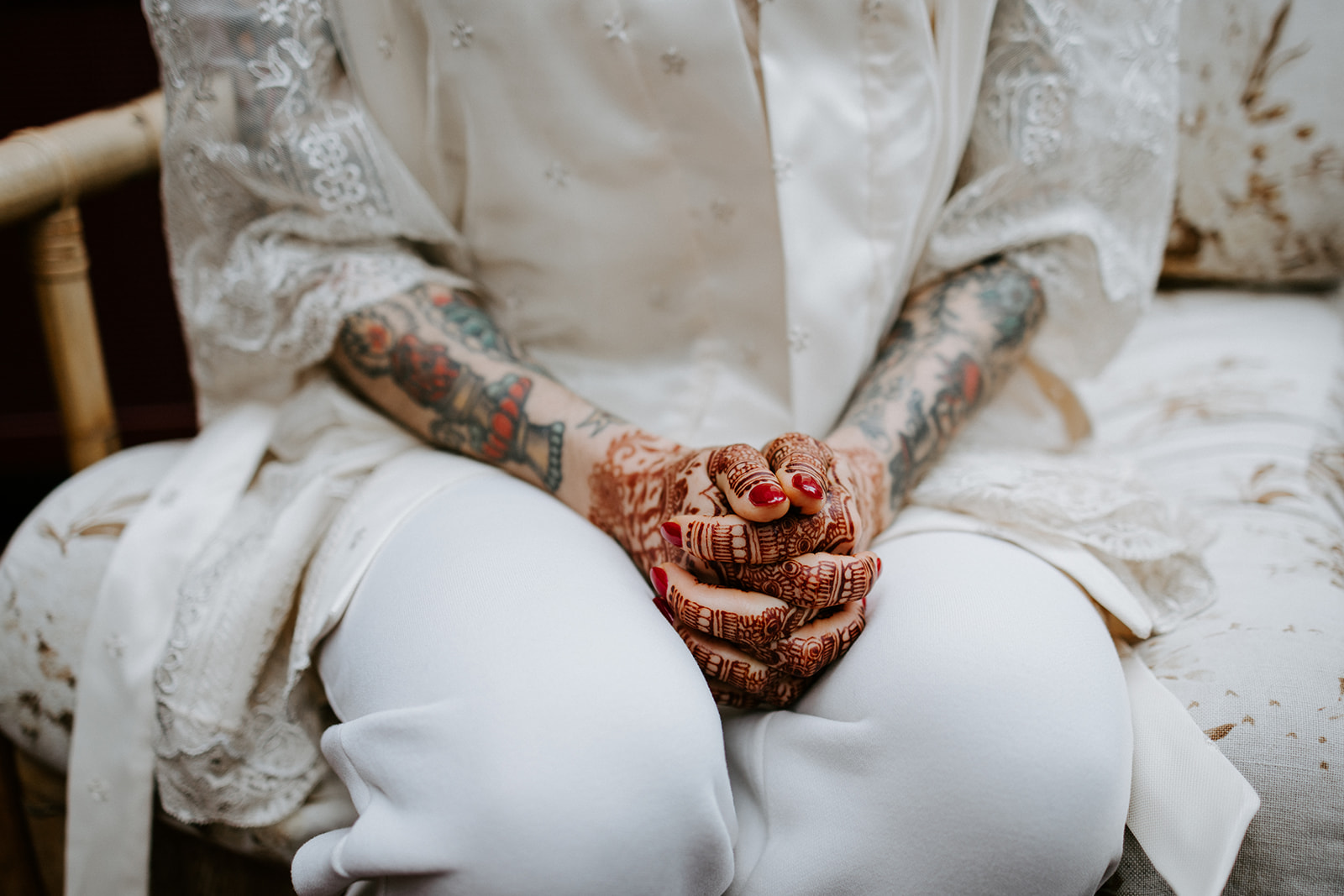 Mitesh : Peu de sentiments sont plus agréables qu’un costume parfaitement taillé. Vanessa de Commonwealth Proper m’a guidée à travers toutes les options pour concrétiser ma vision. Je voulais quelque chose de classique et d’intemporel, mais avec un petit plus. Ils travaillent en étroite collaboration avec un tatoueur pour créer des doublures sur mesure à l’intérieur du costume. Quand j’ai vu le style traditionnel américain du travail du tatoueur, cela m’a rappelé les tatouages de Nancy, et j’ai su que c’était parfait. Mes boutons de manchette étaient un cadeau de Nancy, pour notre mariage à Philadelphie, chez nous, un mois avant Paris. La montre est une IWC Portugieser Calendrier Perpétuel. Son élégance discrète s’accordait parfaitement avec ma tenue et mon style. Nancy adore aussi les phases de lune.