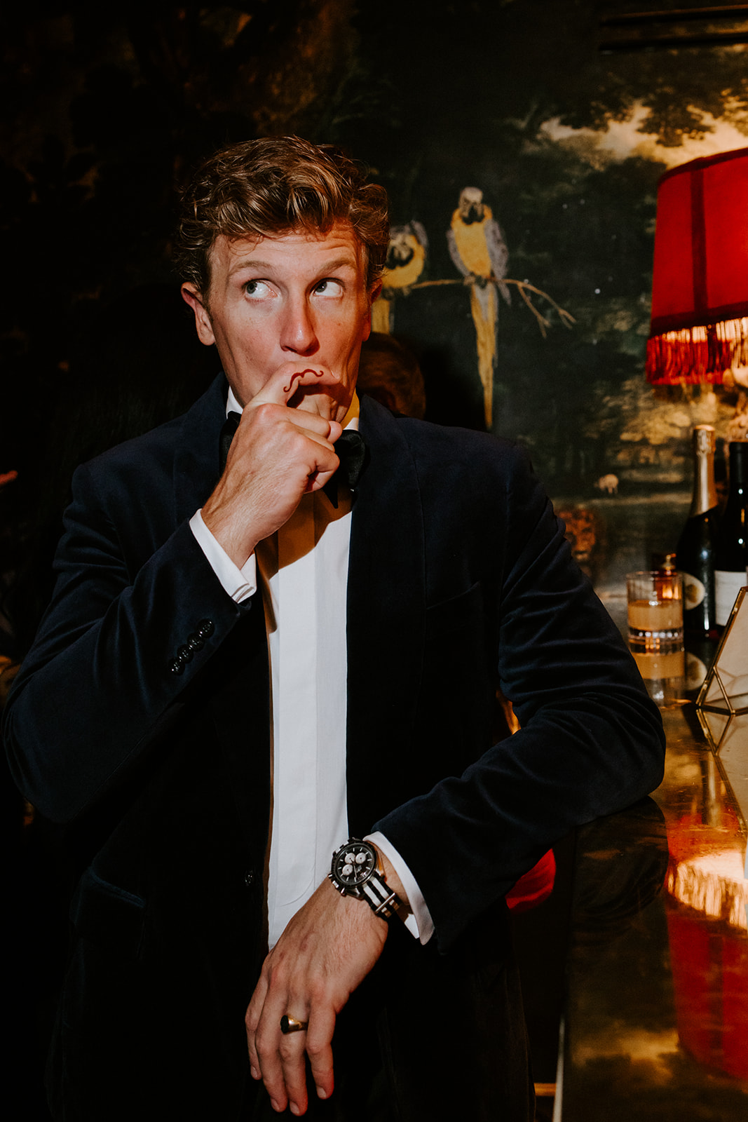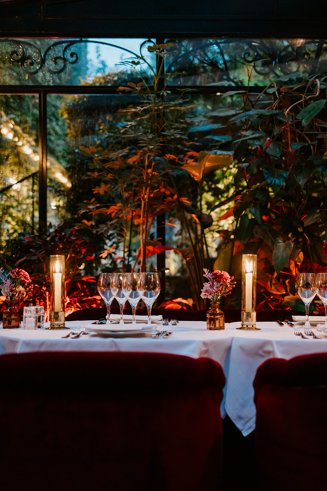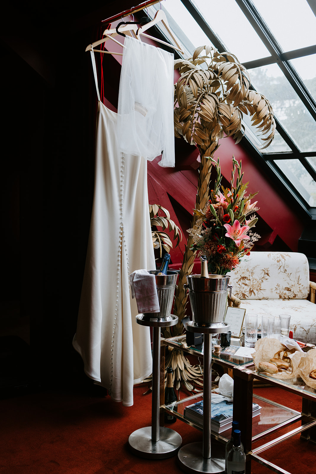 L’un des atouts majeurs de l’Hôtel Particulier et du bar « Le Très Particulier » réside dans son design. L’espace parle de lui-même ; aucune modification ni ajout n’a donc été nécessaire pour créer l’ambiance recherchée. Aucun détail n’a été négligé, du sol noir et blanc aux chaises colorées et au papier peint aux tons de pierres précieuses. Même les salles de bains sont chics ! Pour le bouquet, je voulais quelque chose d’imposant, de couleur pierre précieuse et de spectaculaire, et l’hôtel a pu me l’offrir.