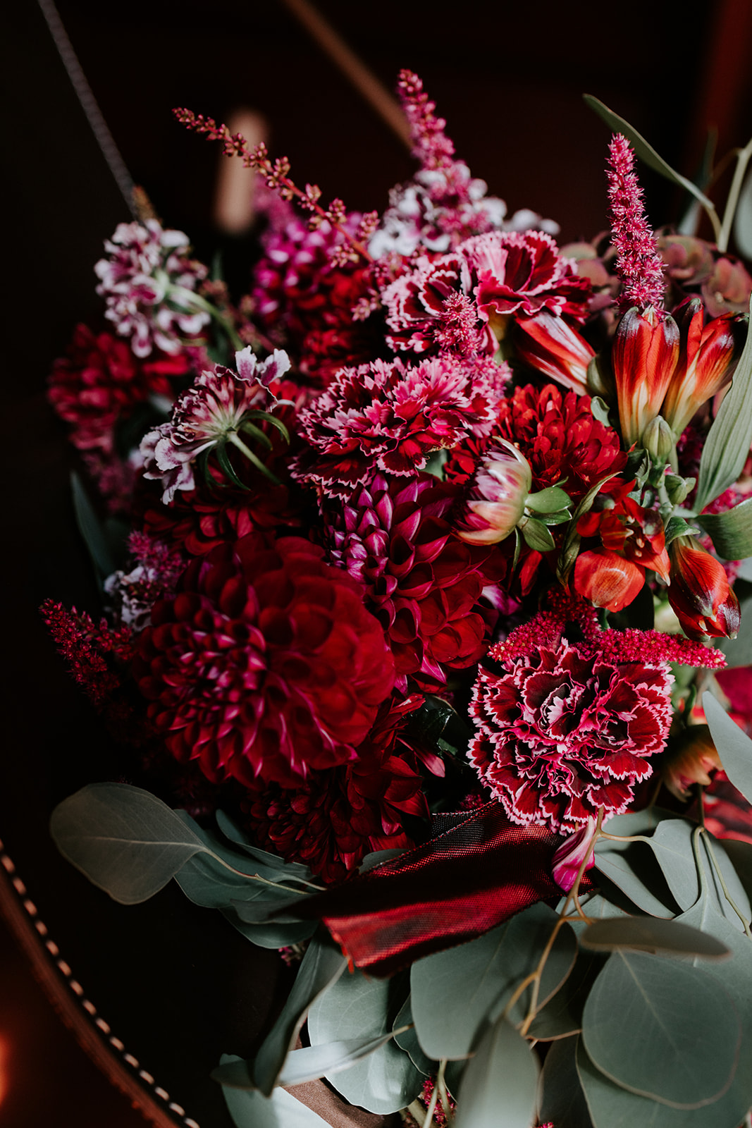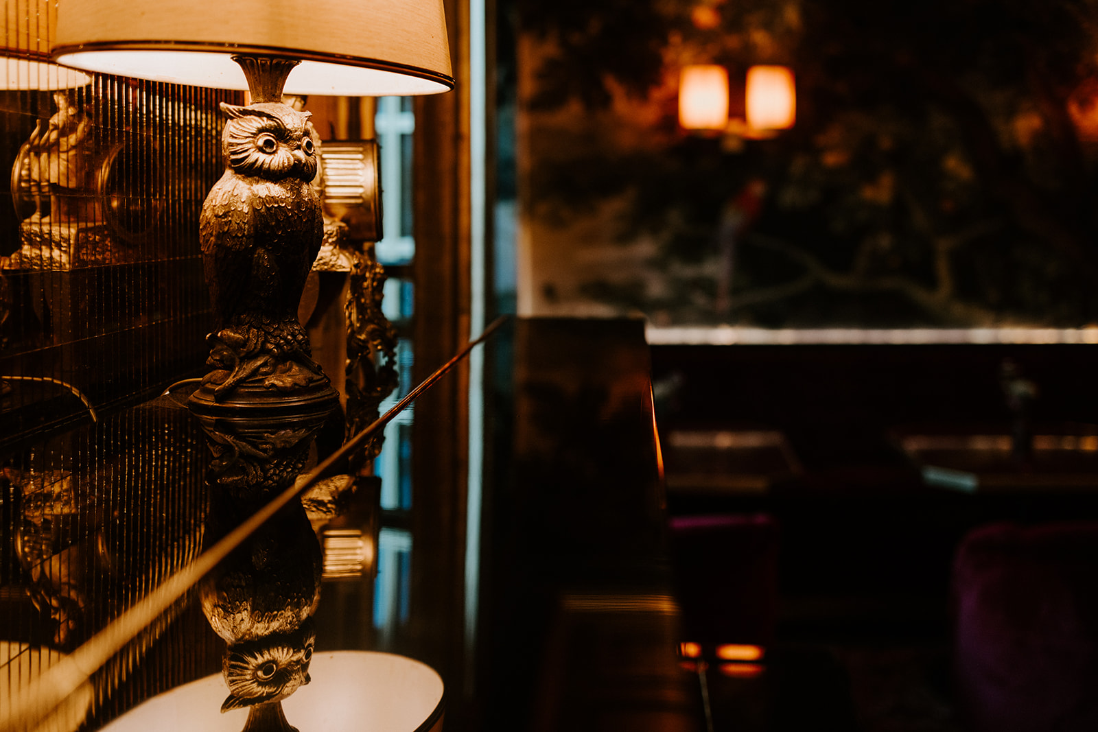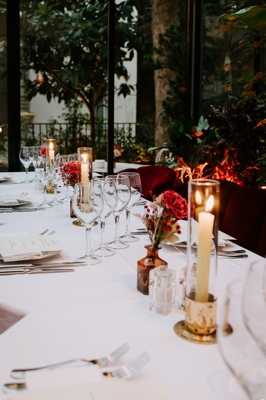 L’un des atouts majeurs de l’Hôtel Particulier et du bar « Le Très Particulier » réside dans son design. L’espace parle de lui-même ; aucune modification ni ajout n’a donc été nécessaire pour créer l’ambiance recherchée. Aucun détail n’a été négligé, du sol noir et blanc aux chaises colorées et au papier peint aux tons de pierres précieuses. Même les salles de bains sont chics ! Pour le bouquet, je voulais quelque chose d’imposant, de couleur pierre précieuse et de spectaculaire, et l’hôtel a pu me l’offrir.