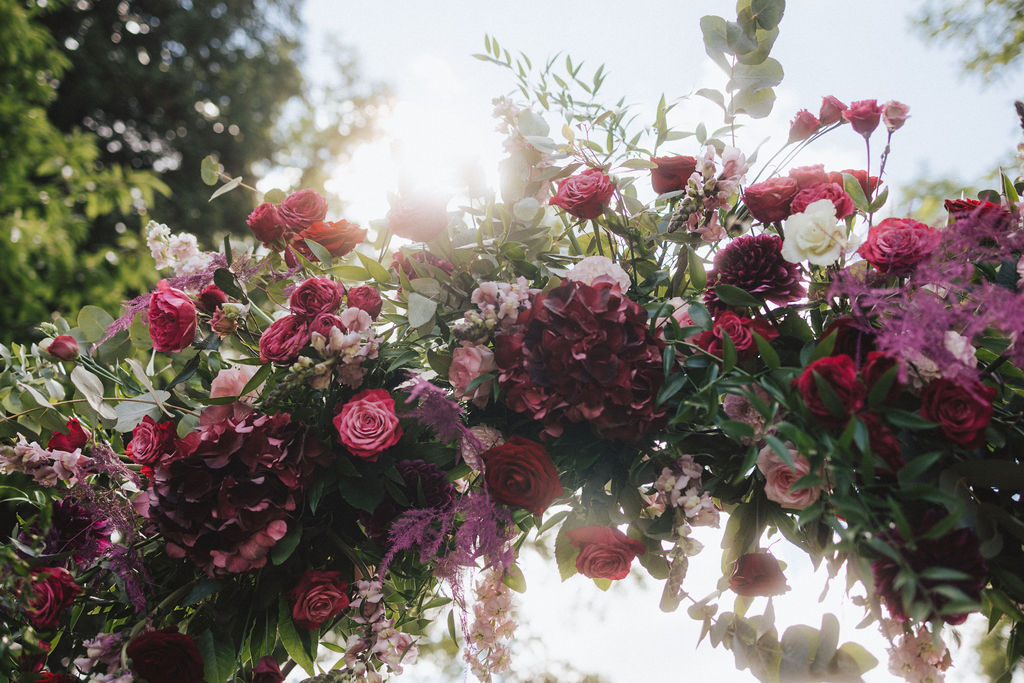 Le principal élément de conception de la cérémonie et de la réception était la simplicité. J’ai trouvé beaucoup d’inspiration dans le concept traditionnel des mariages. Tout comme ma robe s’est inspirée de la fin des années 1950, notre esthétique du mariage l’était également. Les fleurs seraient notre seule décoration et nous avons choisi des couleurs vives, rouge, rose et violet, pour contraster avec le blanc.