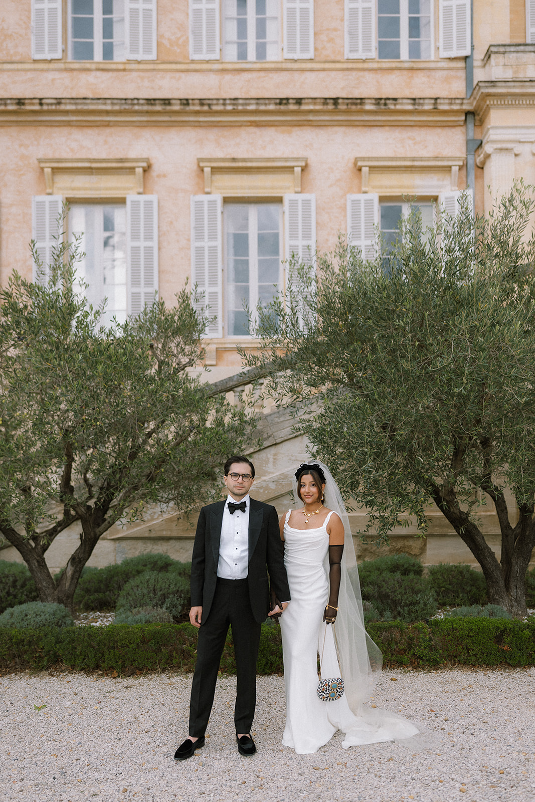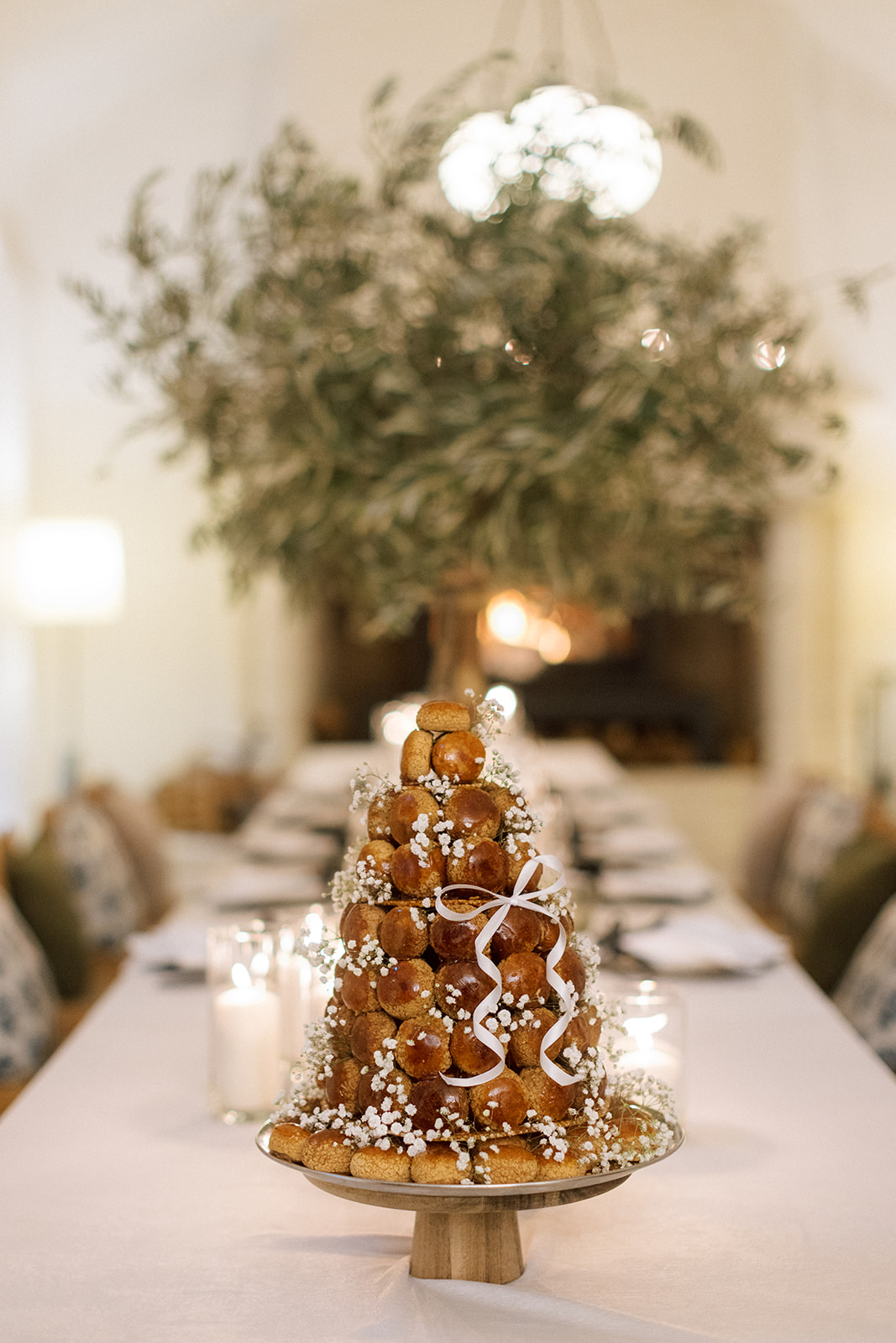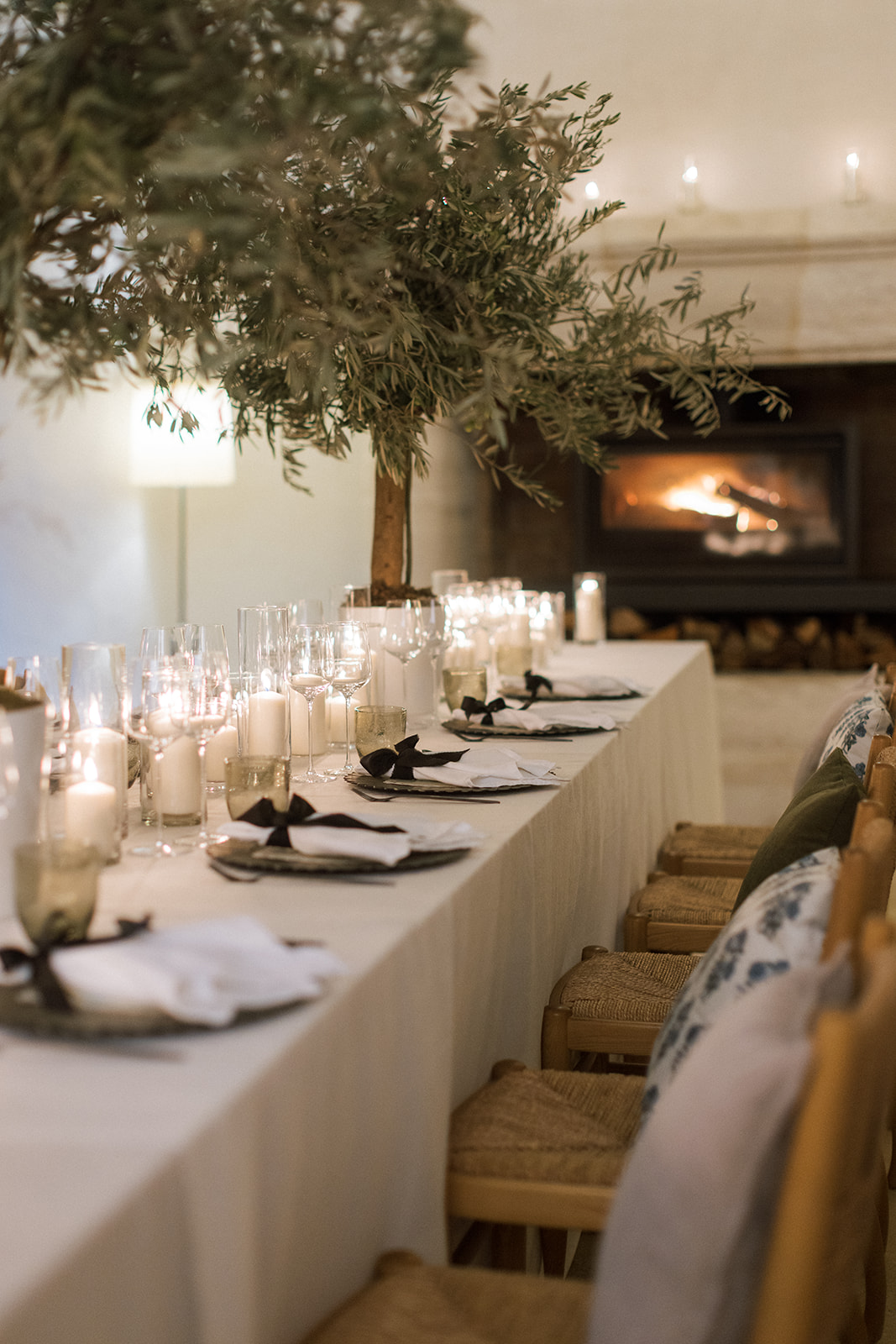 En raison de la beauté naturelle du lieu, nous savions que nous voulions garder une décoration simple. Nous avons également opté pour des tenues de mariage sobres et classiques. Nous nous sommes inspirés d’un style provençal vintage, avec une touche de glamour à l’ancienne, et avons utilisé des teintes de vert pour mettre en valeur les oliviers, qui seraient la pièce maîtresse de notre table du dîner de mariage.