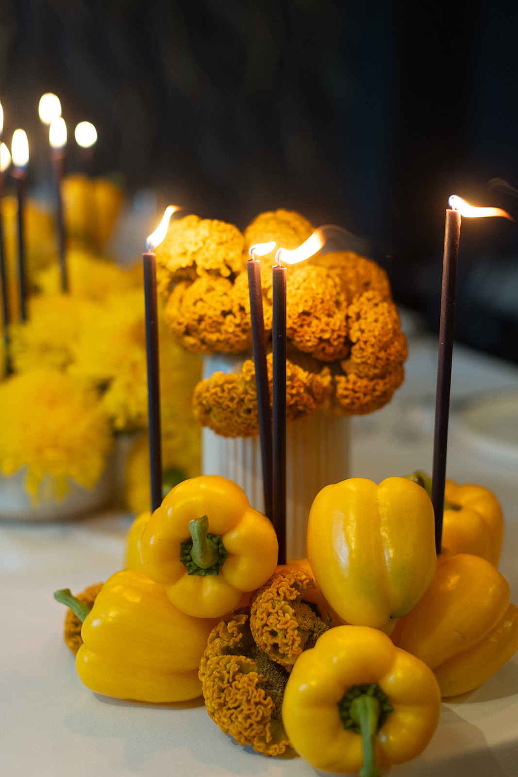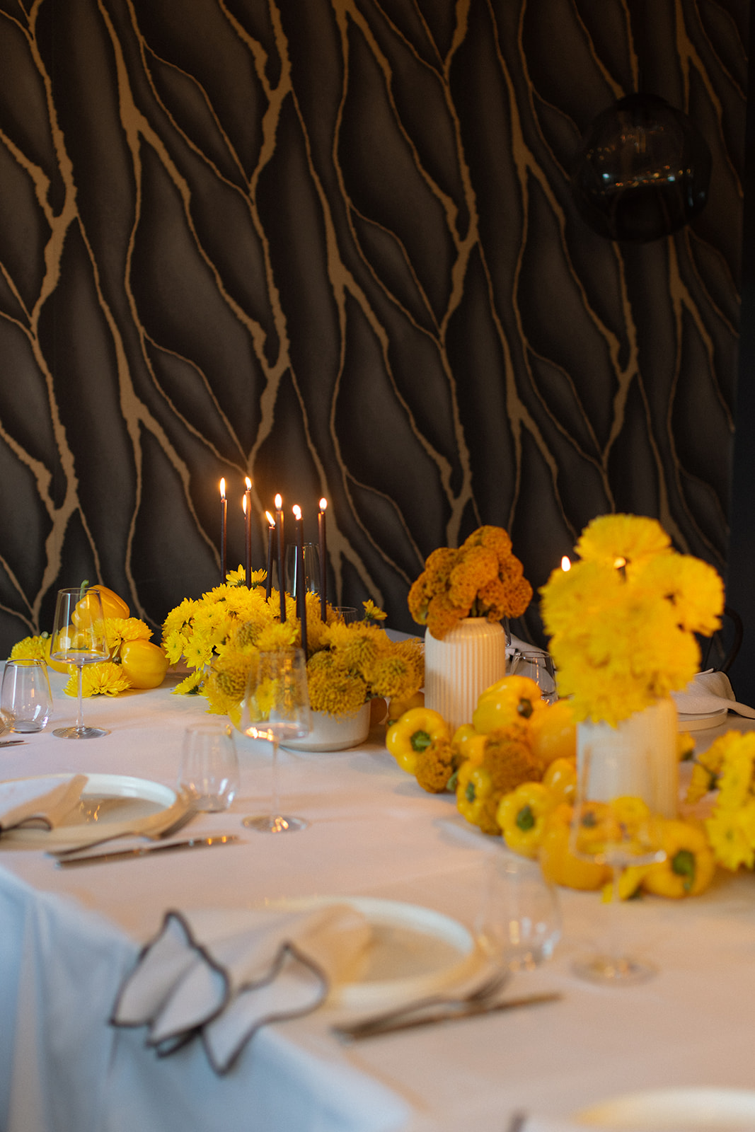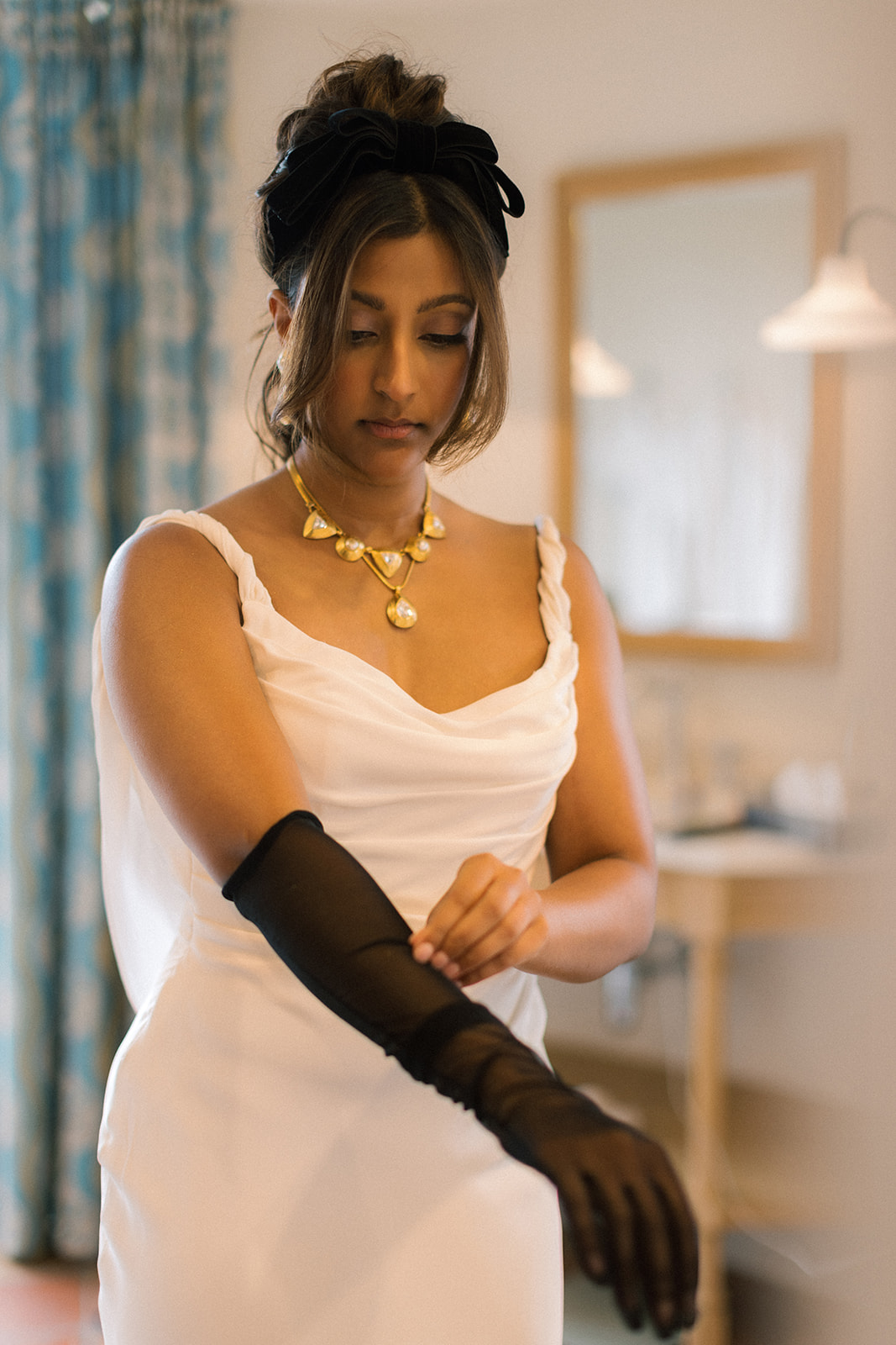 En raison de la beauté naturelle du lieu, nous savions que nous voulions garder une décoration simple. Nous avons également opté pour des tenues de mariage sobres et classiques. Nous nous sommes inspirés d’un style provençal vintage, avec une touche de glamour à l’ancienne, et avons utilisé des teintes de vert pour mettre en valeur les oliviers, qui seraient la pièce maîtresse de notre table du dîner de mariage.