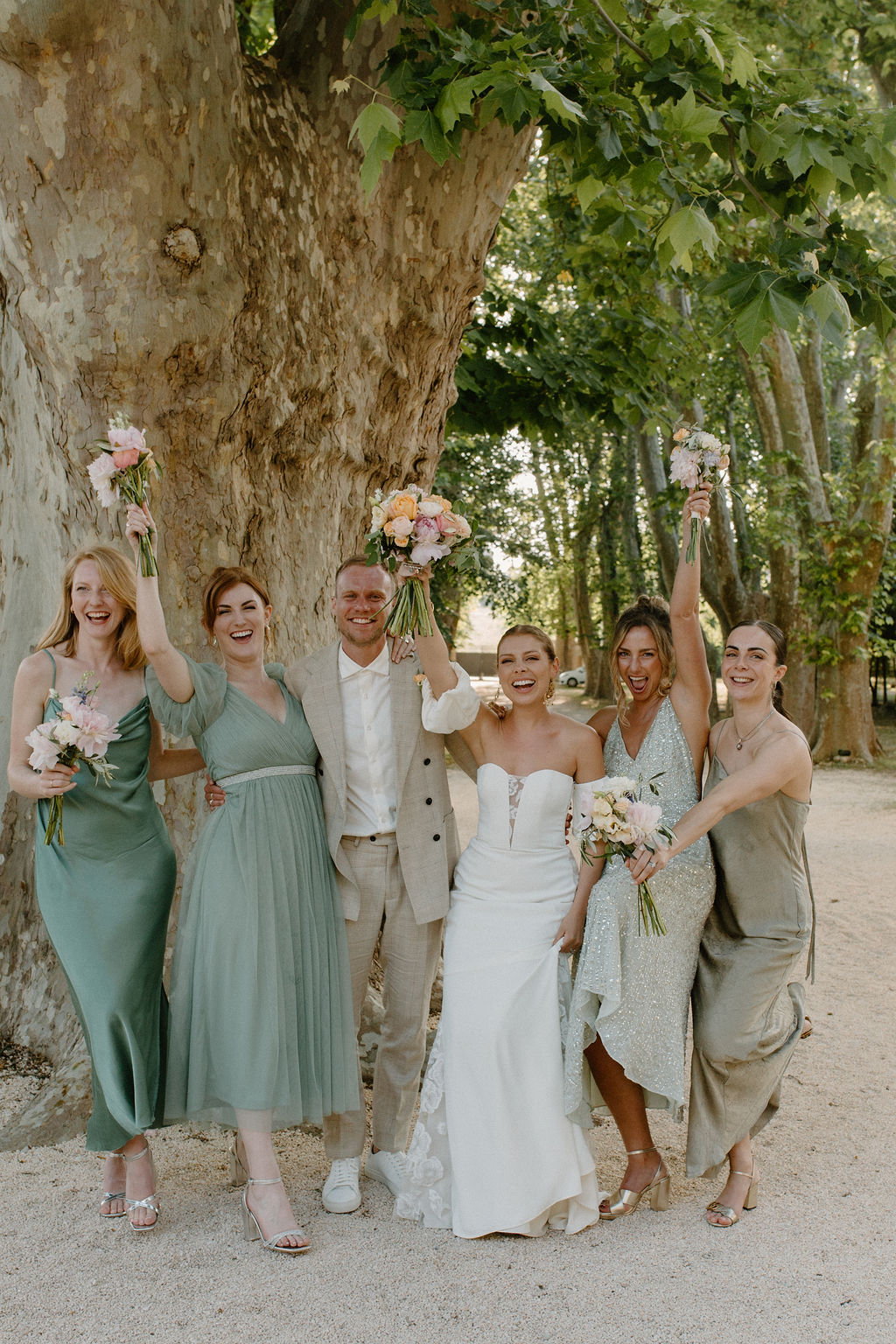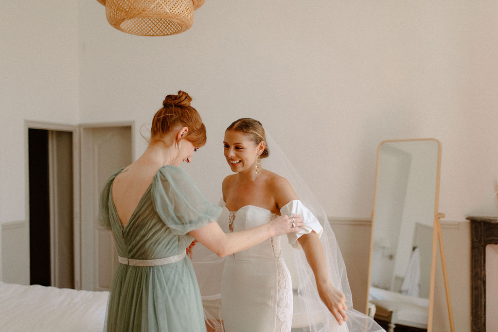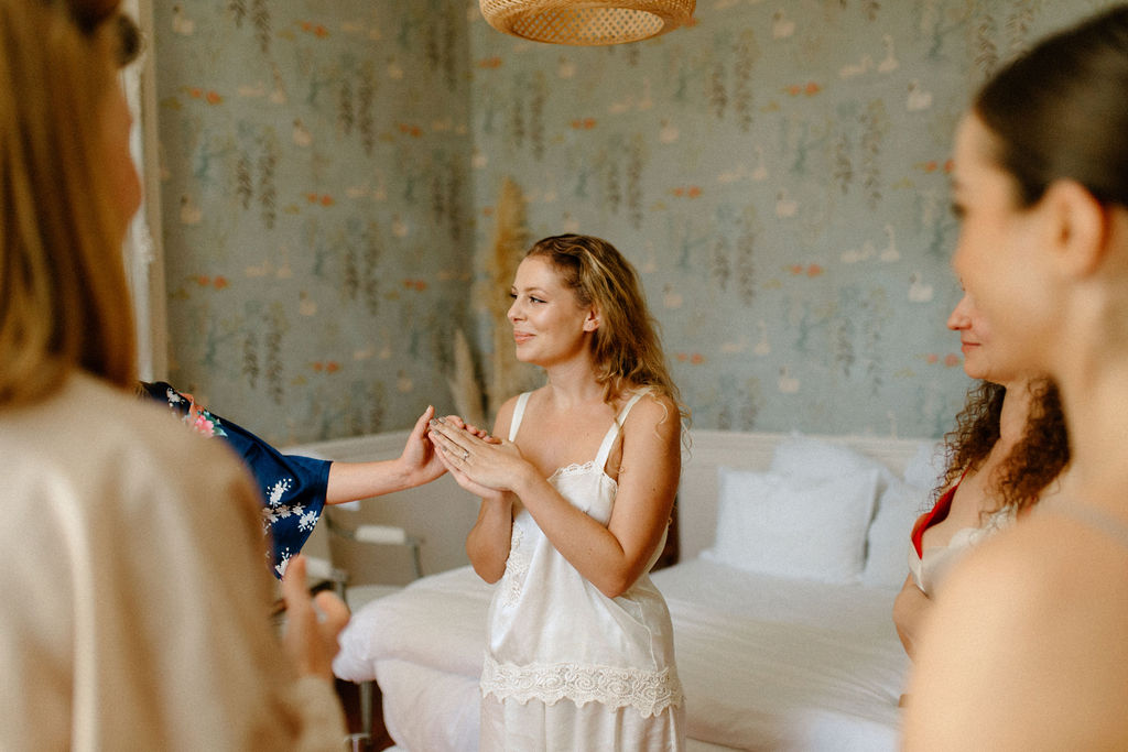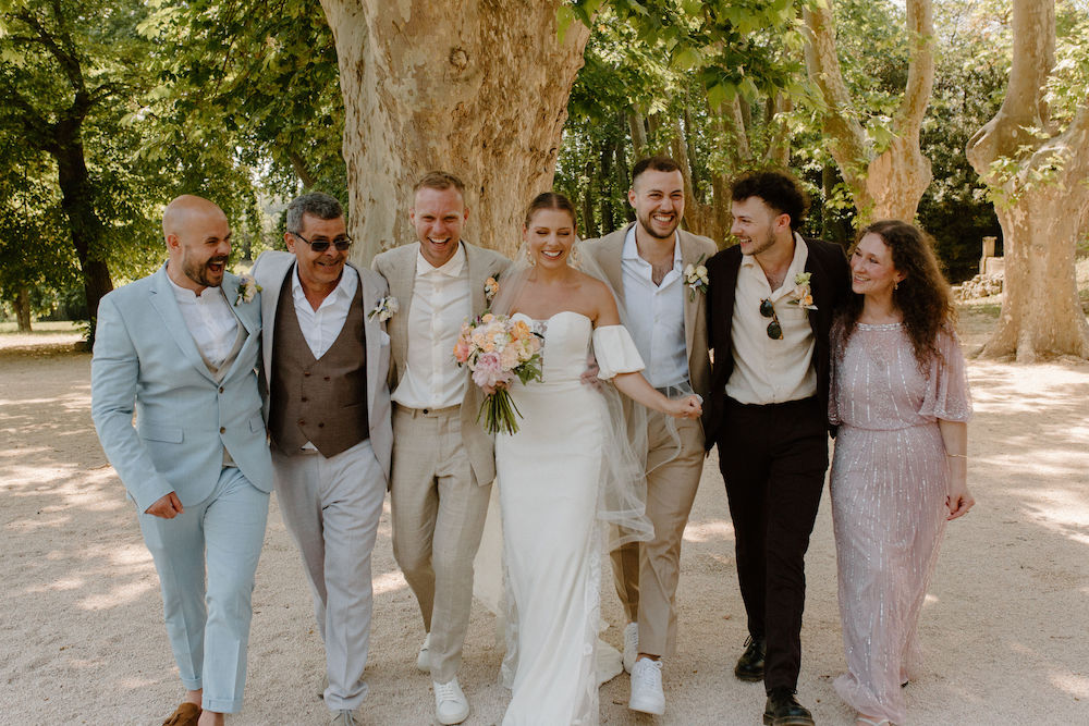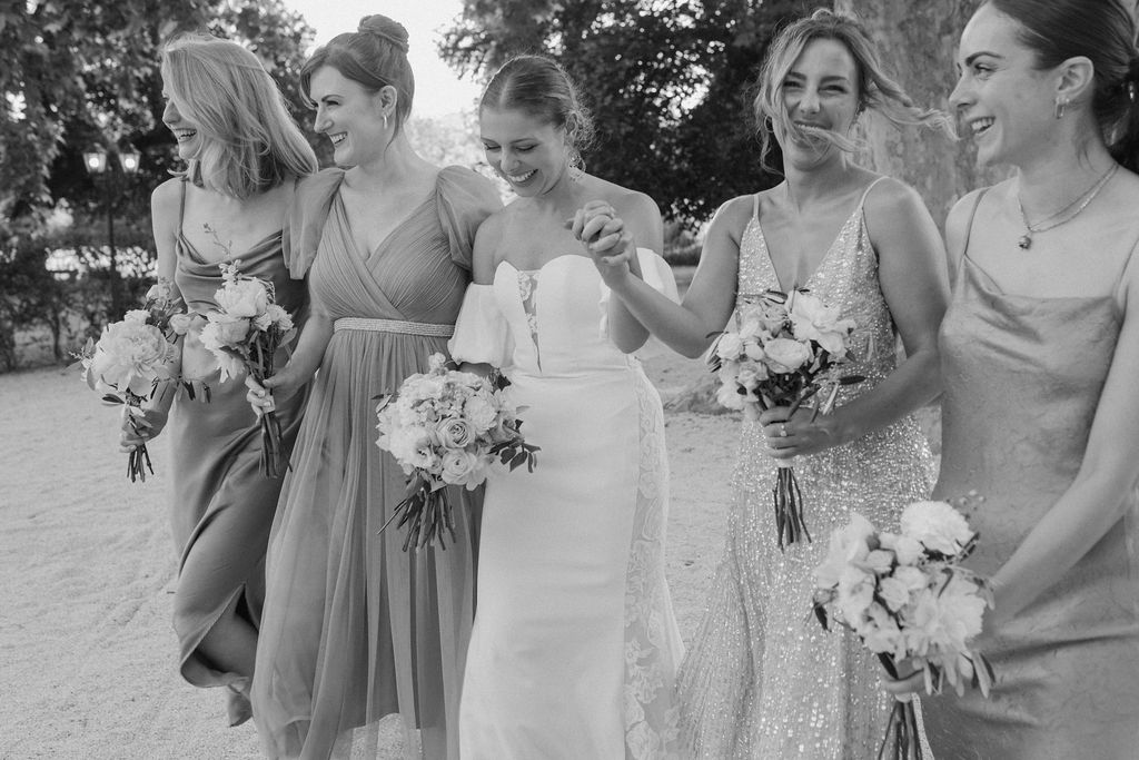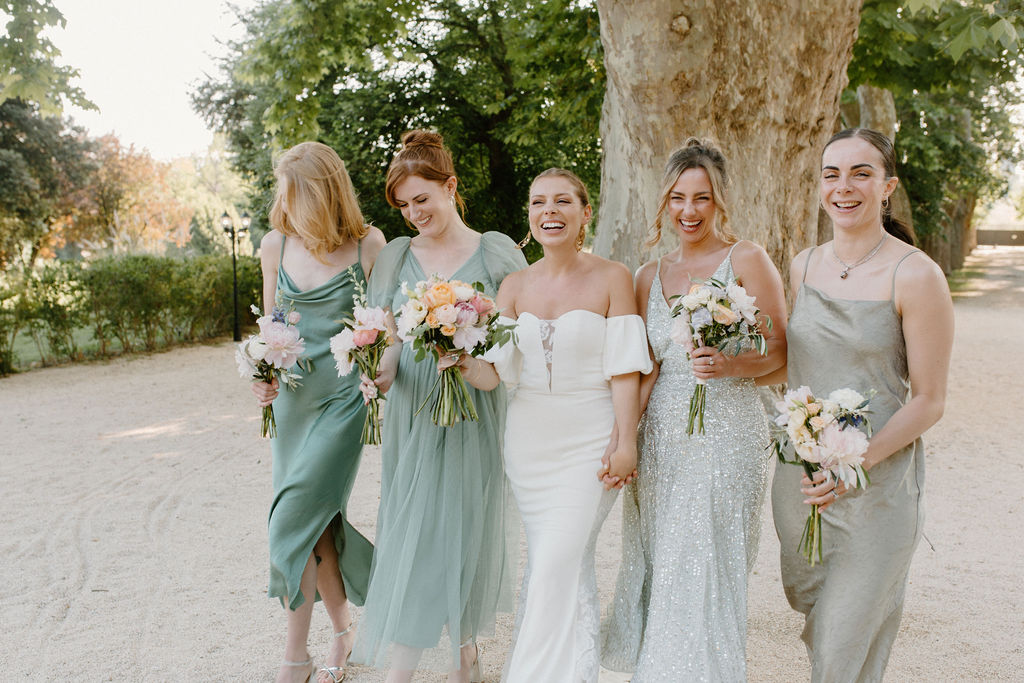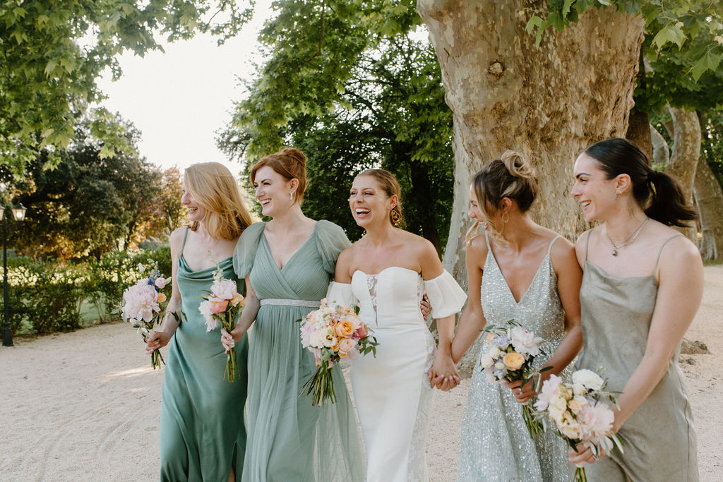 Nous sommes tous les deux créatifs et voulions que cette journée nous ressemble, nous avons donc choisi de créer notre propre papeterie de mariage en utilisant de l’aquarelle et de la feuille d’or ! Les robes de nos demoiselles d’honneur ont également été inspirées par la couleur des volets de la bastide, chacune optant pour une nuance différente de vert sauge en soie, mousseline et paillettes.
