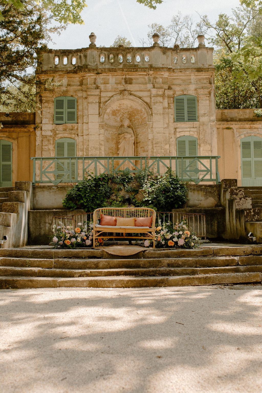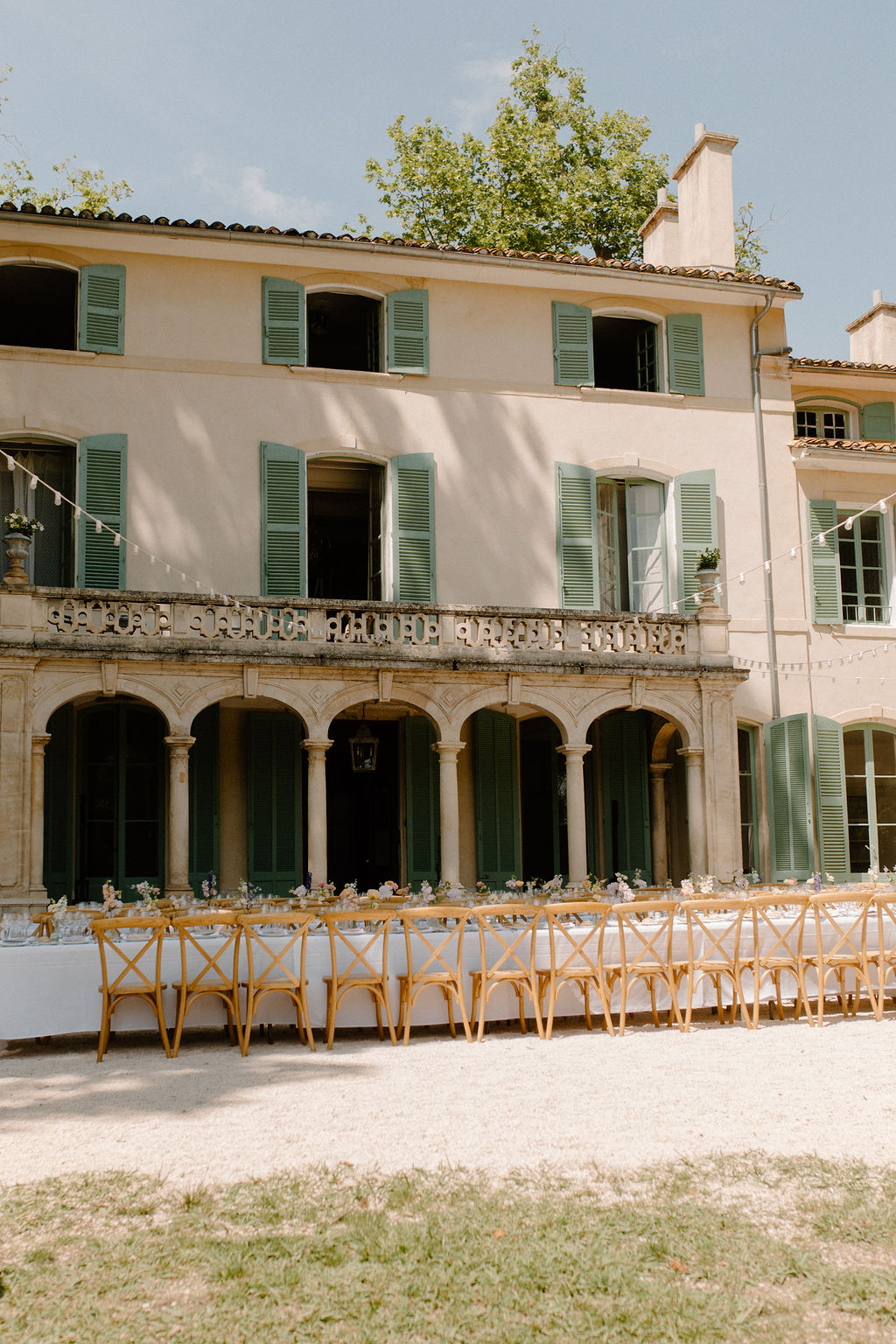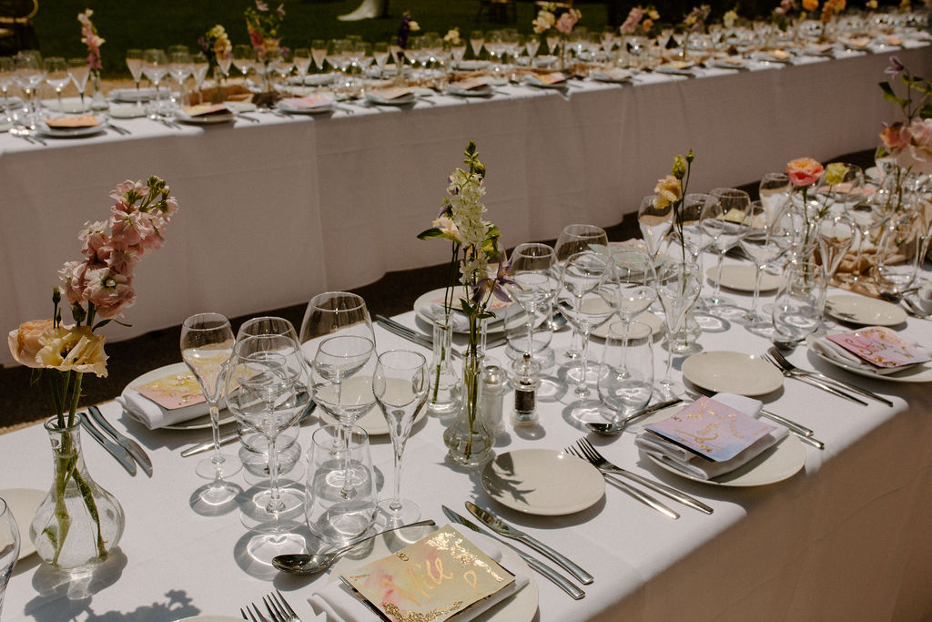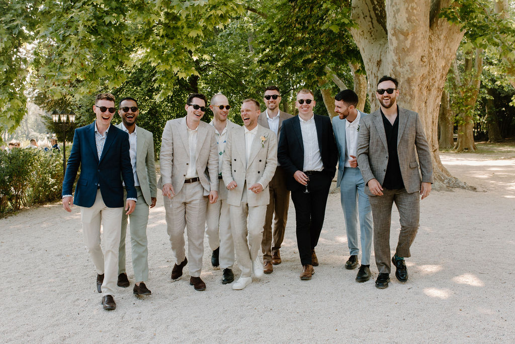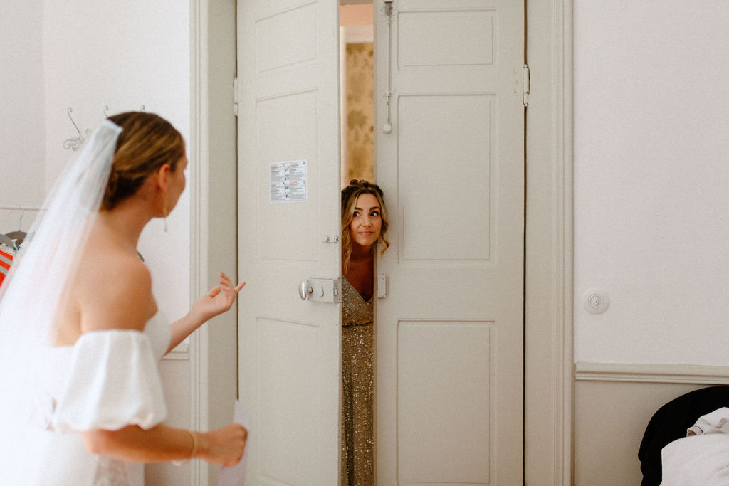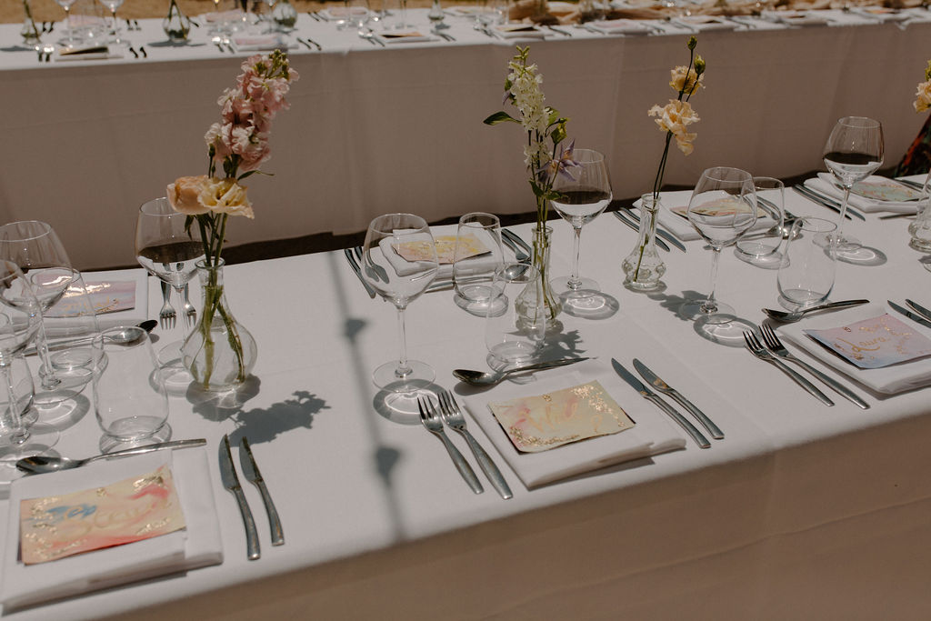 Nous sommes tous les deux créatifs et voulions que cette journée nous ressemble, nous avons donc choisi de créer notre propre papeterie de mariage en utilisant de l’aquarelle et de la feuille d’or ! Les robes de nos demoiselles d’honneur ont également été inspirées par la couleur des volets de la bastide, chacune optant pour une nuance différente de vert sauge en soie, mousseline et paillettes.