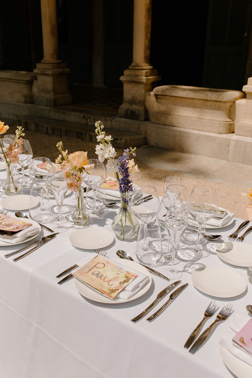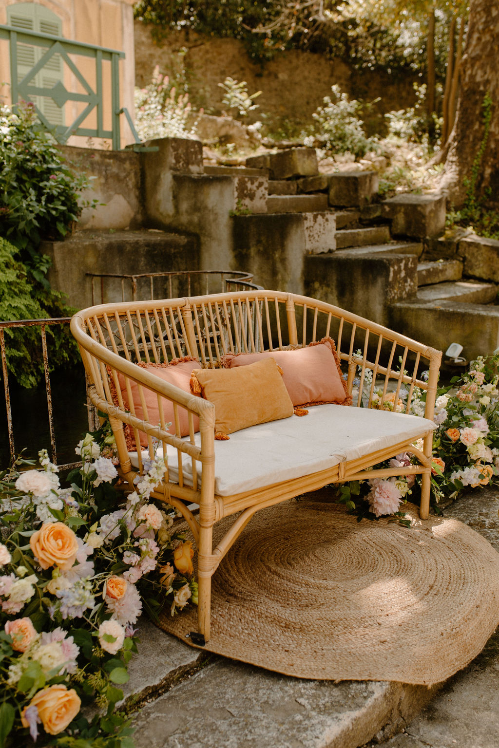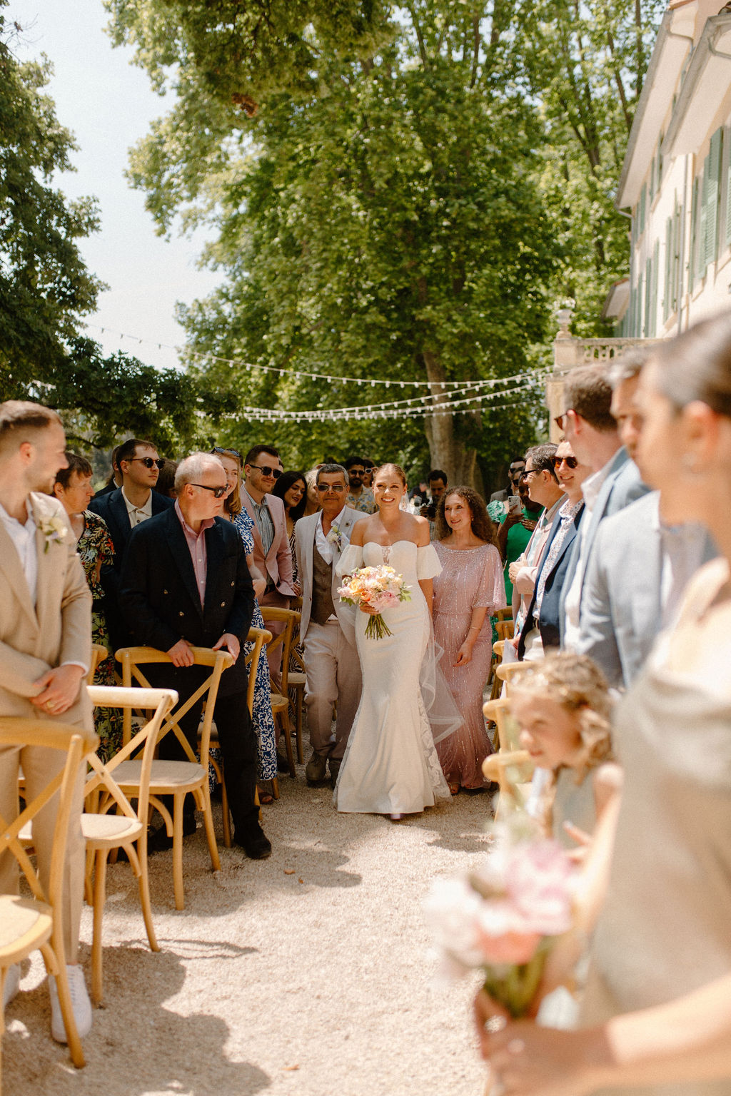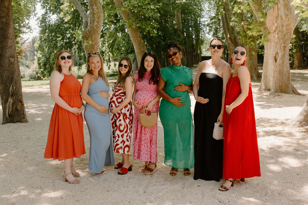 Nous sommes tous les deux créatifs et voulions que cette journée nous ressemble, nous avons donc choisi de créer notre propre papeterie de mariage en utilisant de l’aquarelle et de la feuille d’or ! Les robes de nos demoiselles d’honneur ont également été inspirées par la couleur des volets de la bastide, chacune optant pour une nuance différente de vert sauge en soie, mousseline et paillettes.