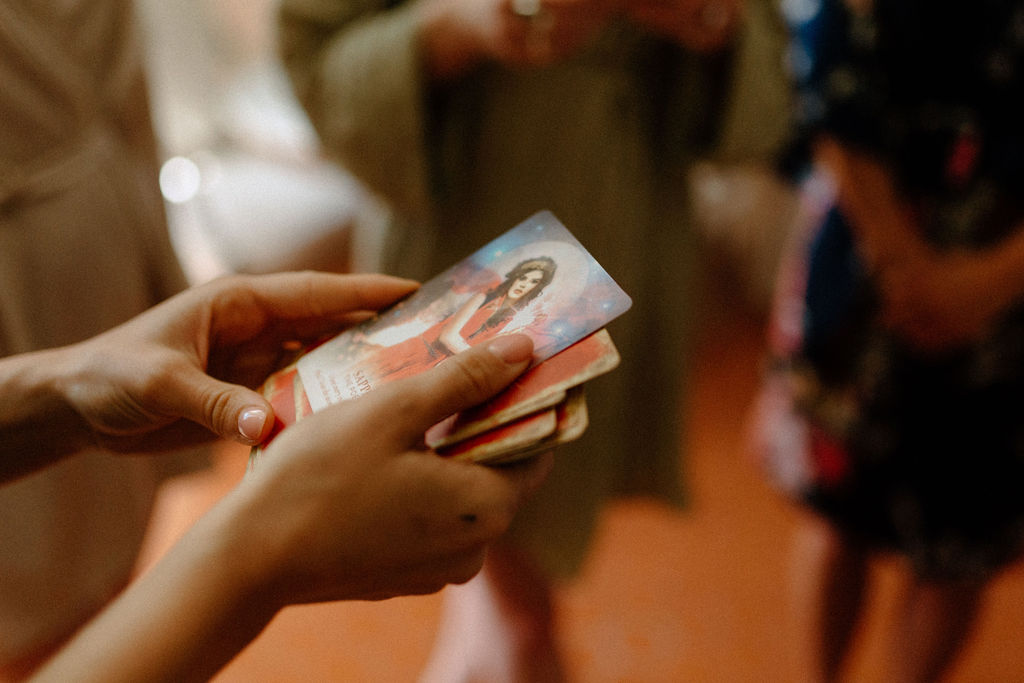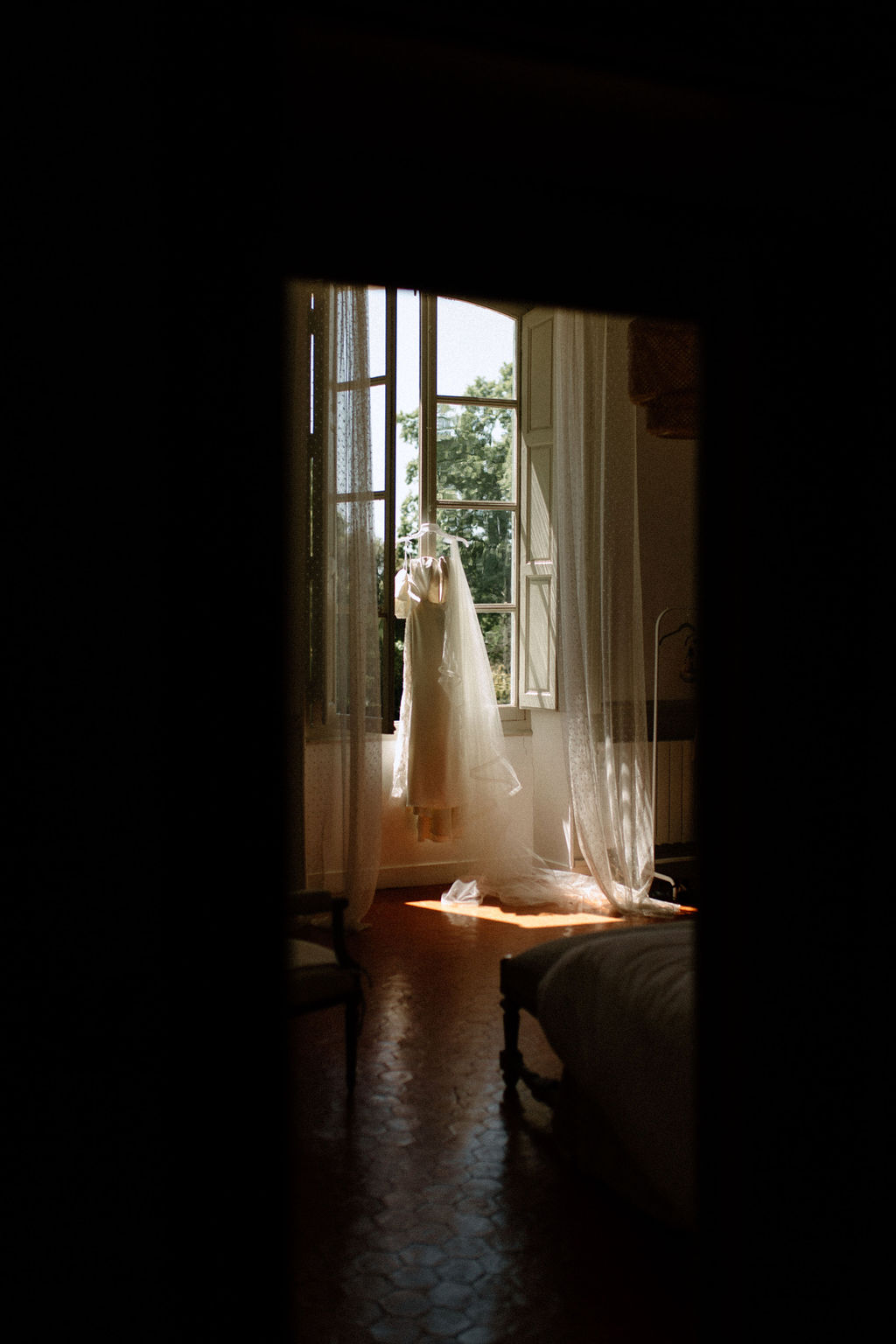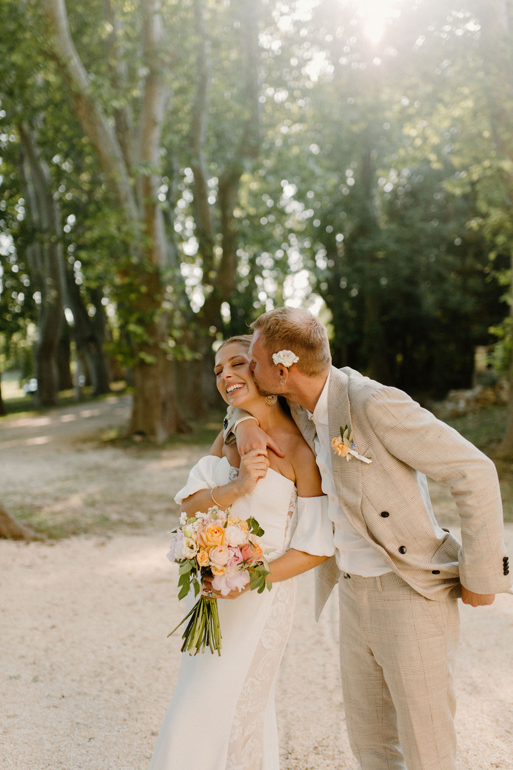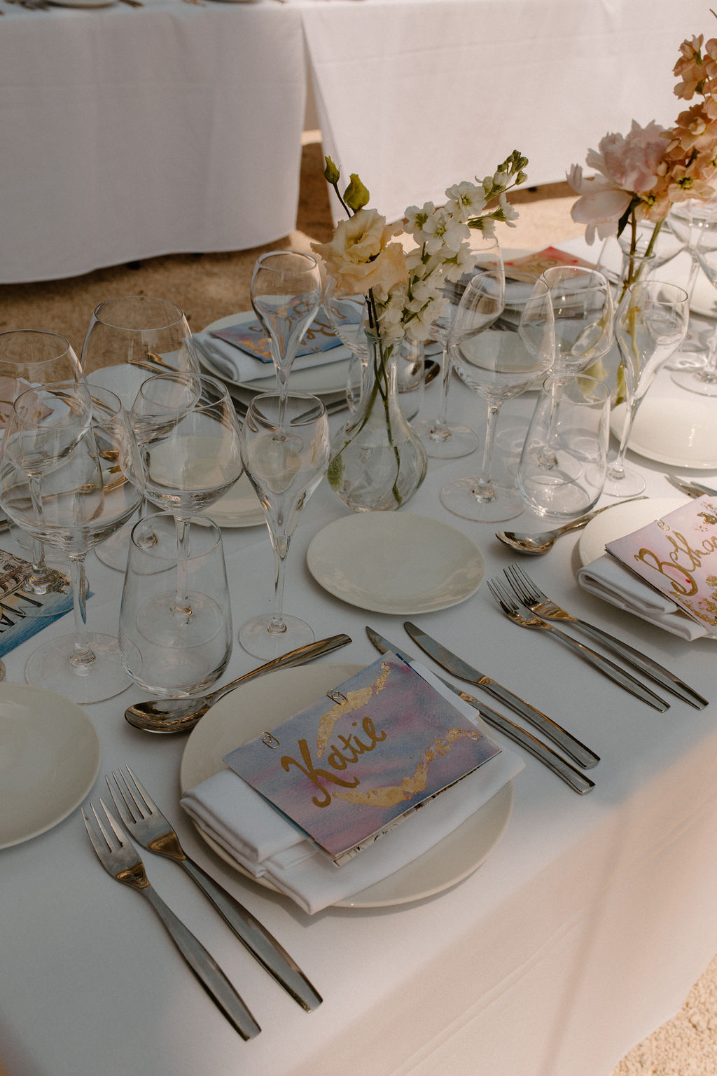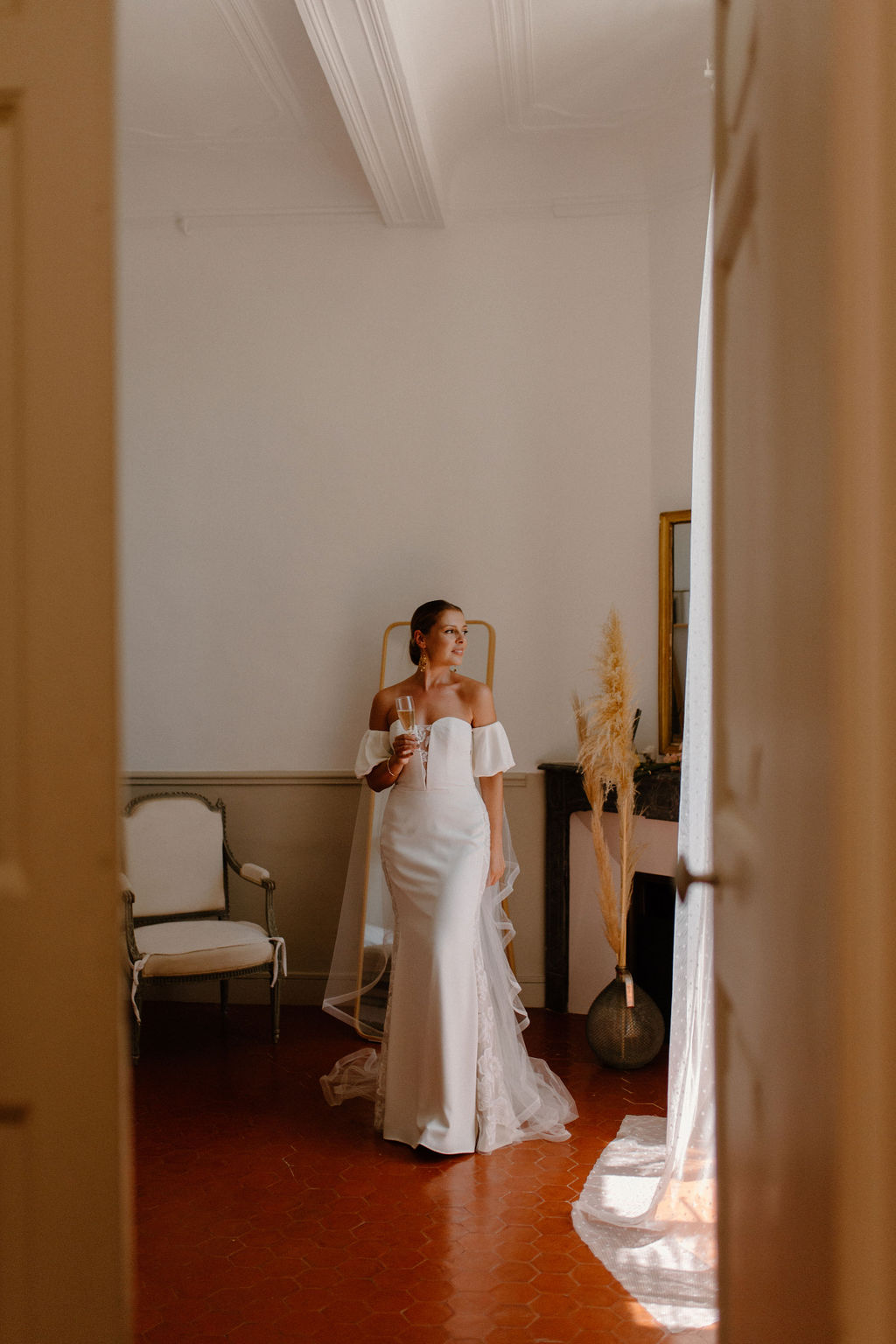 Nous sommes tous les deux créatifs et voulions que cette journée nous ressemble, nous avons donc choisi de créer notre propre papeterie de mariage en utilisant de l’aquarelle et de la feuille d’or ! Les robes de nos demoiselles d’honneur ont également été inspirées par la couleur des volets de la bastide, chacune optant pour une nuance différente de vert sauge en soie, mousseline et paillettes.