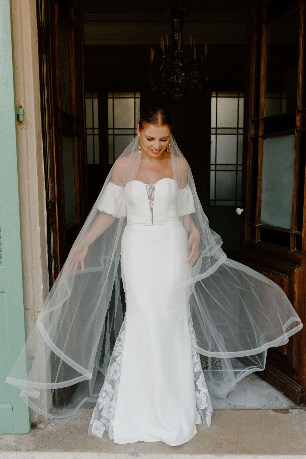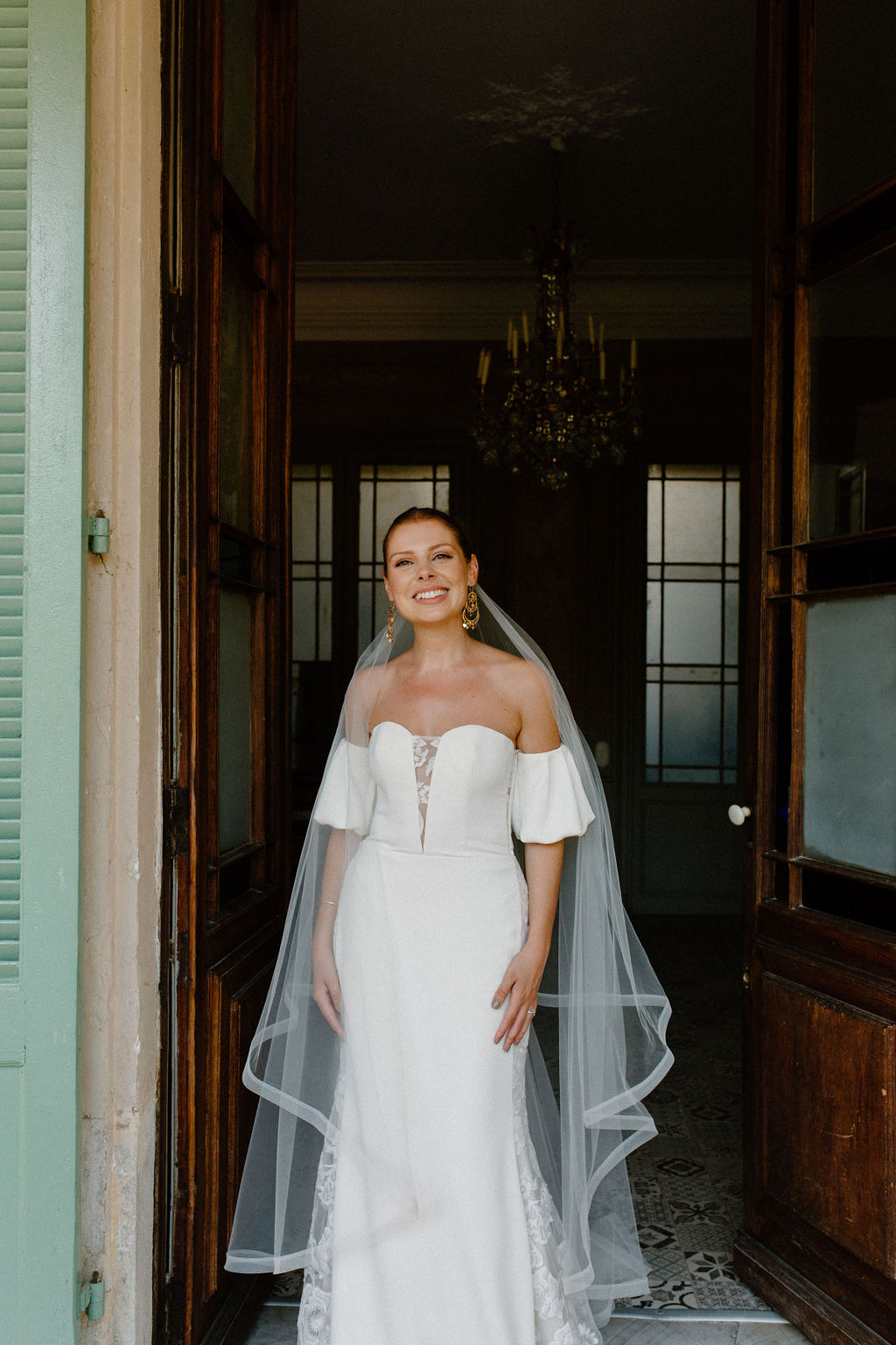 Après avoir essayé plusieurs robes plus volumineuses et m’être sentie comme une enfant perdue dans une boîte à déguisements, la propriétaire de la boutique m’a gentiment suggéré d’essayer Luana. Elle n’avait pas l’air excitante sur le cintre, mais une fois que je l’ai mise, quelque chose en moi s’est allumé. C’était simple mais avec des détails de dentelle complexes et des manches bouffantes amusantes qui lui donnaient un effet romantique et parfait pour un mariage méditerranéen. Plus important encore, j’avais gardé les boucles d’oreilles de mariage algériennes en or de ma mère datant de 1990 pour les porter le jour de mon propre mariage, et voir les boucles d’oreilles avec la robe était le moment où j’ai su que c’était la version de moi-même que je voulais être en tant que mariée.