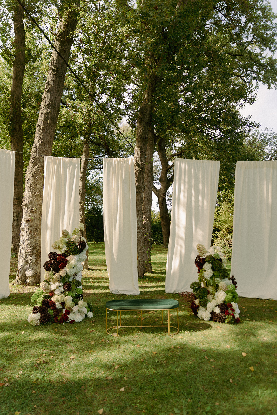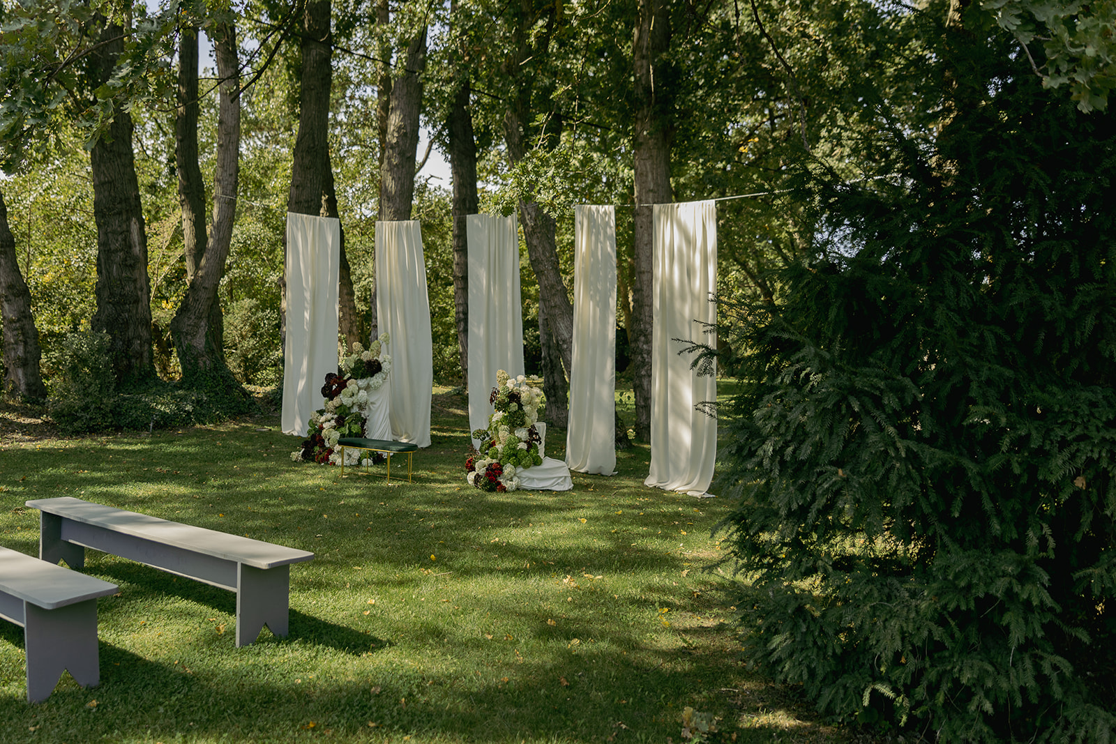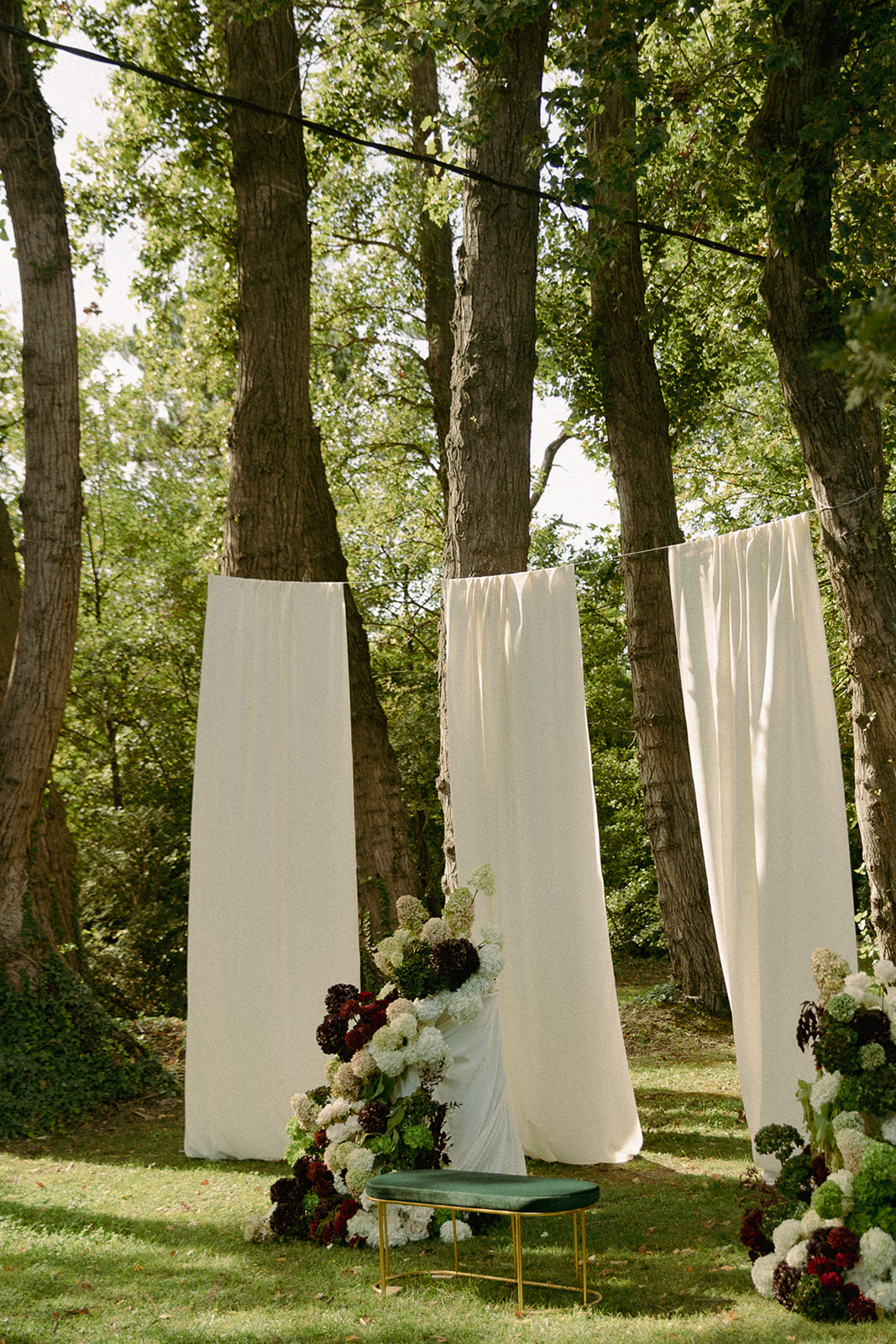 Le lieu de cérémonie, avec l’impression de grandeur et légèreté apporté par des grands draps entre les arbres.